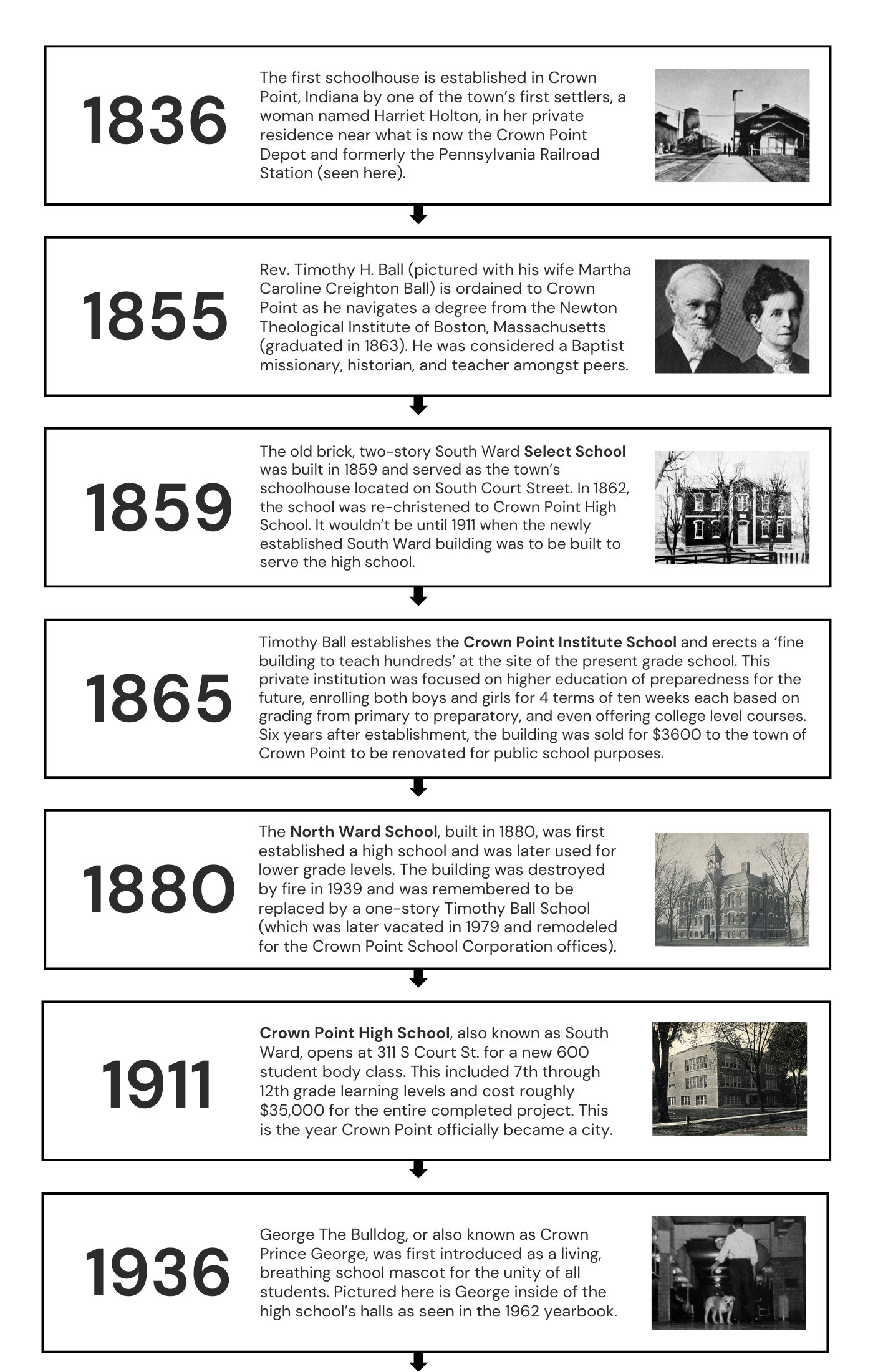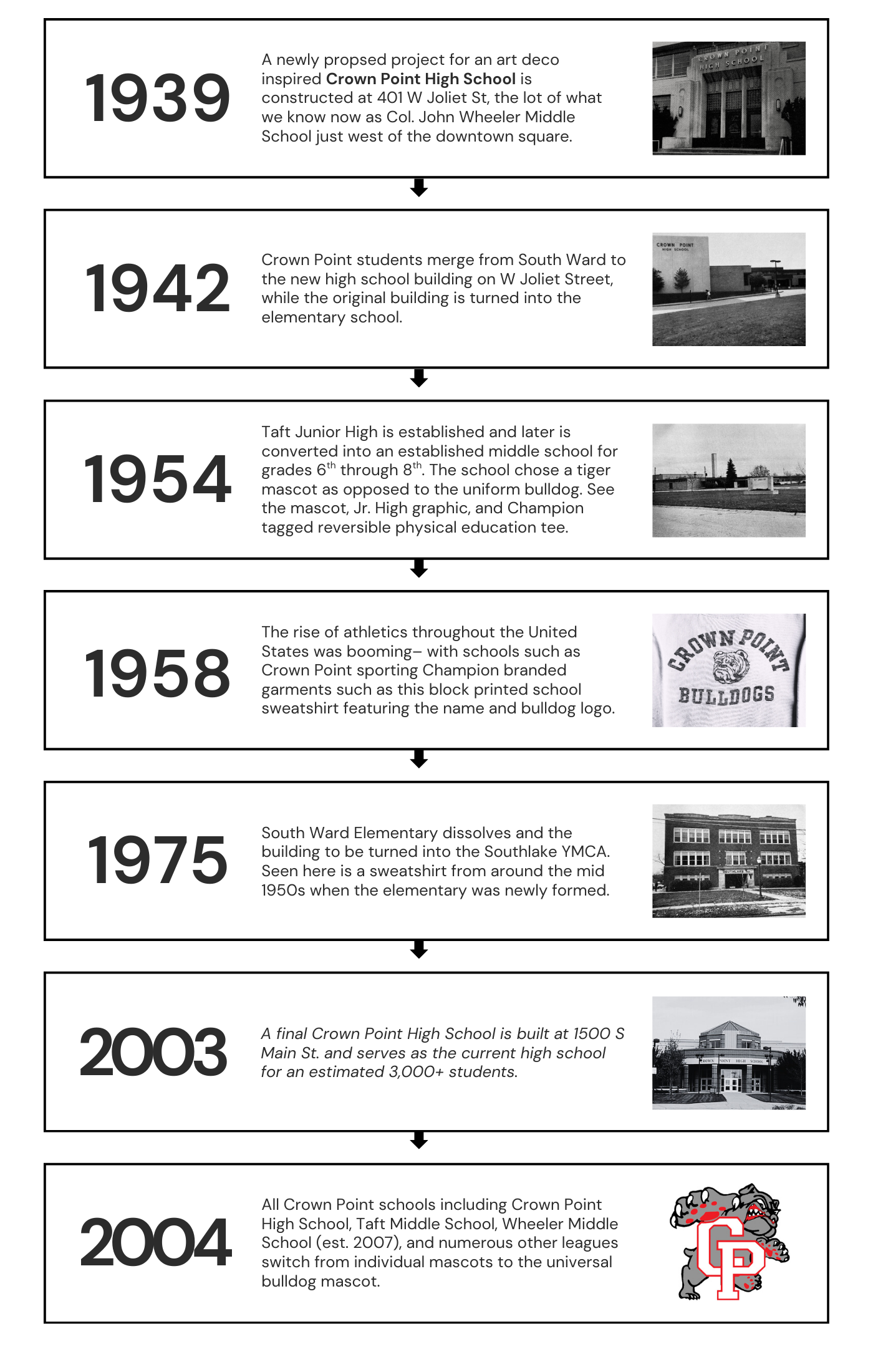 Read and see more about the Crown Point community schools and their respected local history through the lens of vintage athletic wear, CPHS yearbook photos, and more references.