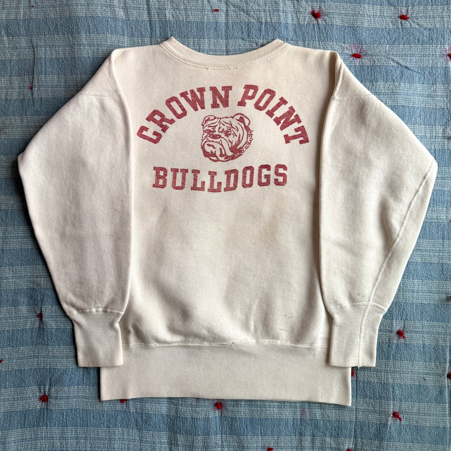 This 1950s sweatshirt sports a white combed cotton material, water printed chest graphic of the Crown Point Bulldogs mascot in red, overlock stitching throughout, raised athletic collar, and elongated cuffs. The sweat was likely made by Champion based on features such as the original tag location, collar design, and overall shape.