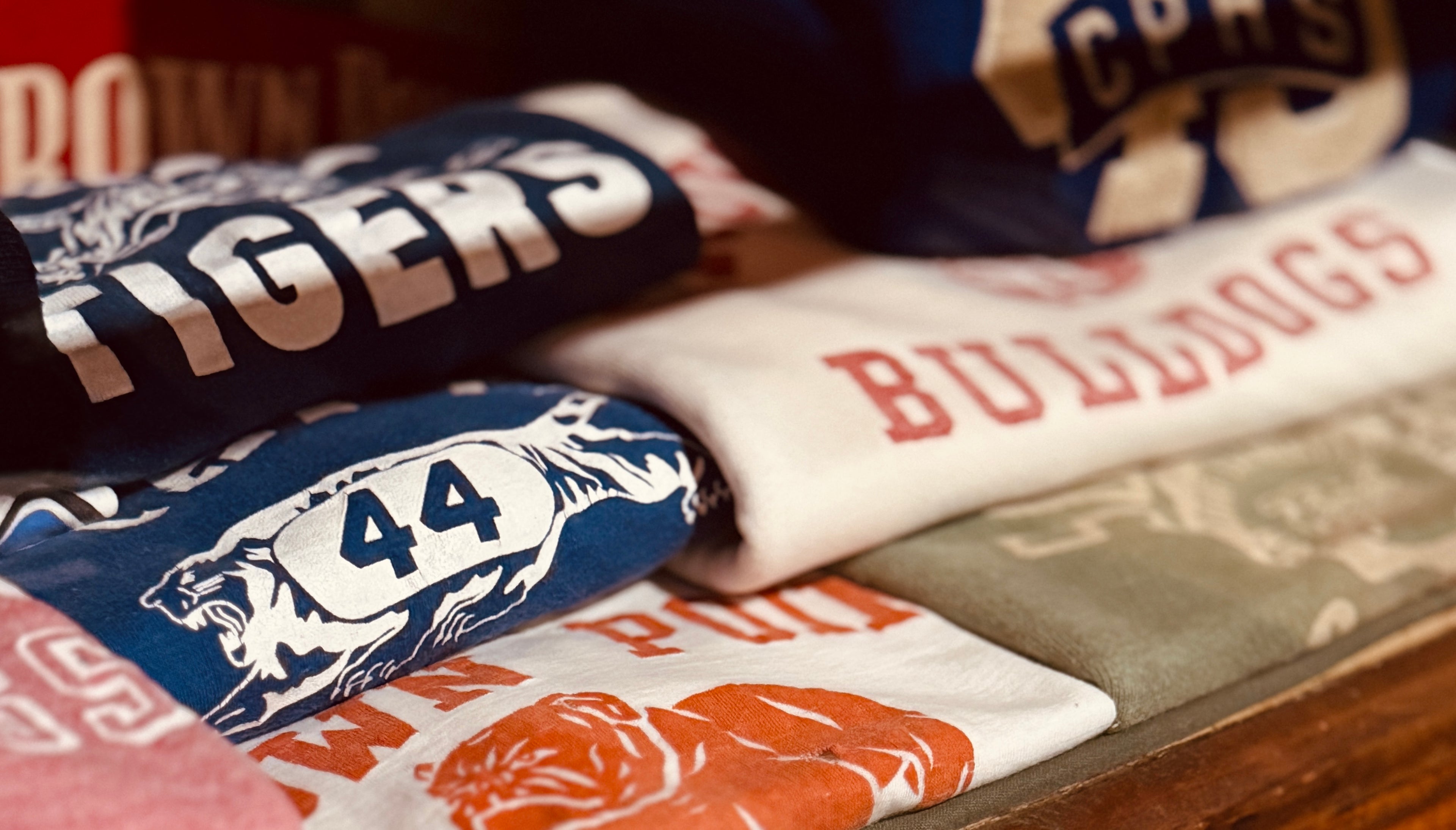 Showcased is a late 1940s, possibly early 1950s, school mascot graphic tee from our local hometown, Crown Point, Indiana. It's weaved with a fine combed cotton material, deep orange colored graphic color, raised collar, and single stitch sleeves. While Crown Point is known for their classic red and white school colors, it is interesting to note this is printed with a dark orange ink. Maybe time is to blame for the color fading, but the deep richness tells a different story. Also, it has been observed that every couple years, the bulldog mascot graphic would variate. Always a bulldog, but sometimes a slightly different one. This special t-shirt will now be apart of our shop's archive for a long time to preserve for our ultimate appreciation, remembrance, and nostalgia as a Crown Point student.