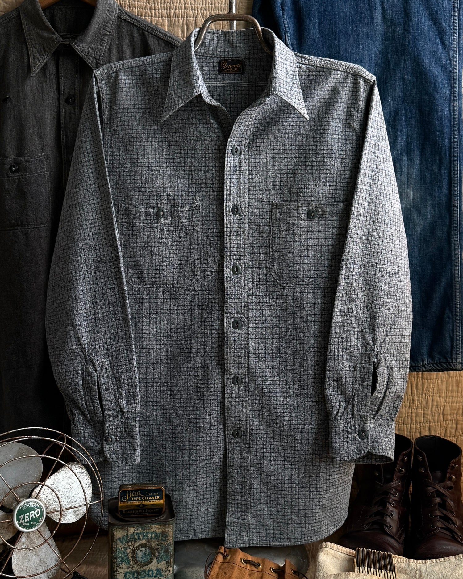 Here’s a look at an early 20th century piece of workwear history from the brand The General Work Shirt. It’s made of a sturdy, yet soft greyish, blue checkered cotton fabric throughout. The front closure has lightweight metal cats-eye buttons with expanding side seam, selvedge gussets sewn into each side of the hips. Functionally speaking— this shirt has everything you would need to complete a successful work day. From the tailored fit that hugs the body, utility pockets, fabric, intact label tag, etc.