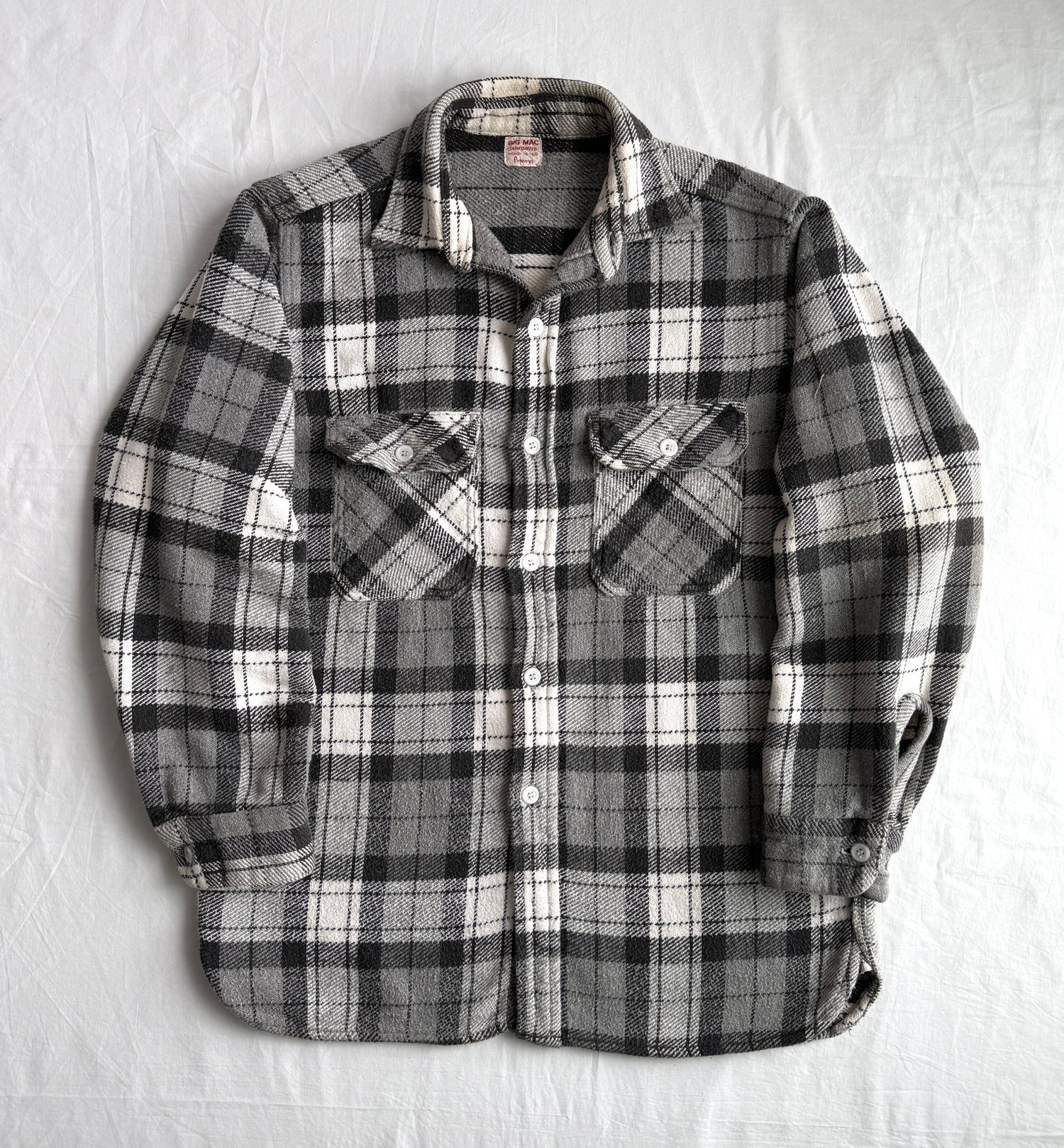 This absolute beautiful woven flannel shirt was pulled from an estate near our shop and felt it was only right to be shown off here as part of our archive collection. It features a black, white, and grey woven, heavy sanforized cotton plaid fabric, expansion gusset notches sewn into each hip seam, a full six-button front closure, and one of the best labels for any flannel— an all embroidered, stitched down Penneys Big Mac tag at the collar.