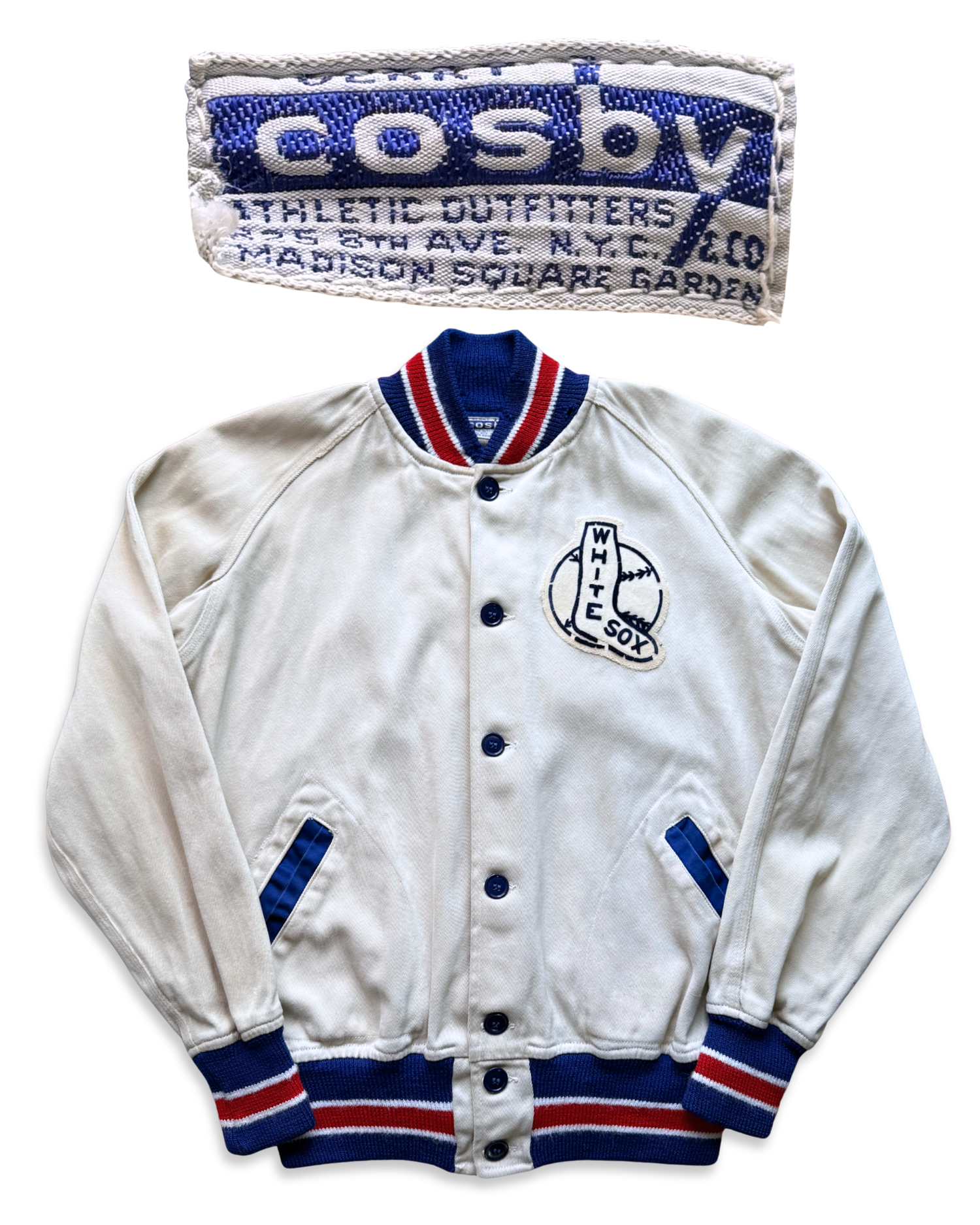 Headquartered at the iconic Madison Square Garden and located at 125th 8th Ave, NYC– the proximity to the surrounding city and local amatuer and professional hockey teams proved uber successful. The company supplied hockey equipment, sports jerseys, and more athletic goods such as this jacket seen here. It features a white cotton twill material with red and blue striped woven wool sleeve cuffs, waistband, and collar. The chest patch is hand stitched on and made of a flock/felt like print of the Chicago White Sox baseball team logo. The original label tag by Cosby & Co is still strongly sewn to the collar, while the size tag is sewn inside the pocket near the button front. A beautiful, and well-preserved piece of Chicago sportswear history now kept just outside the city with us.