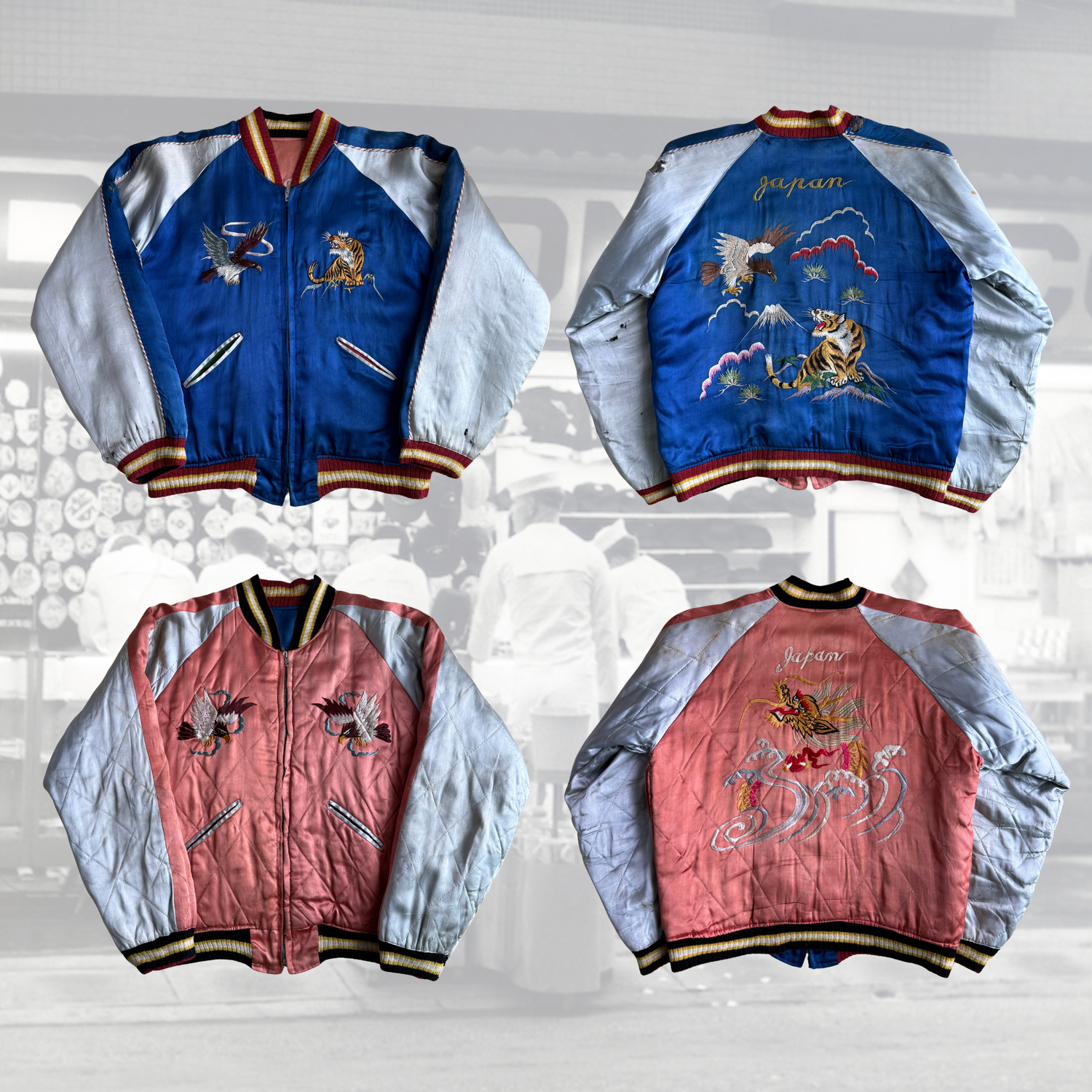 Seen here is one of these special jackets dated to around that time just after the Second World War— sporting a blue and white satin fabric outer shell with a pink and white reversible inner. The zipper is made by TTS, a Tokyo based manufacturer. The motifs used: an eagle, tiger, and dragon represent courage, glory, and strength. Having all these displayed on one piece is truly special.