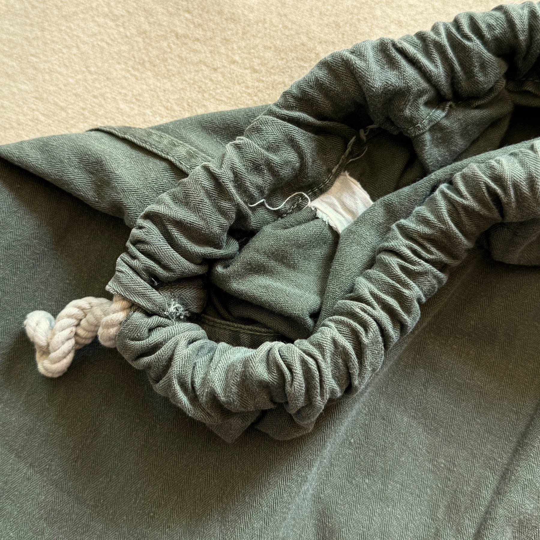 Features a sage green HBT fabric used, drawstring pulls on each side of the opening, and faded tag stitched inside the bag.