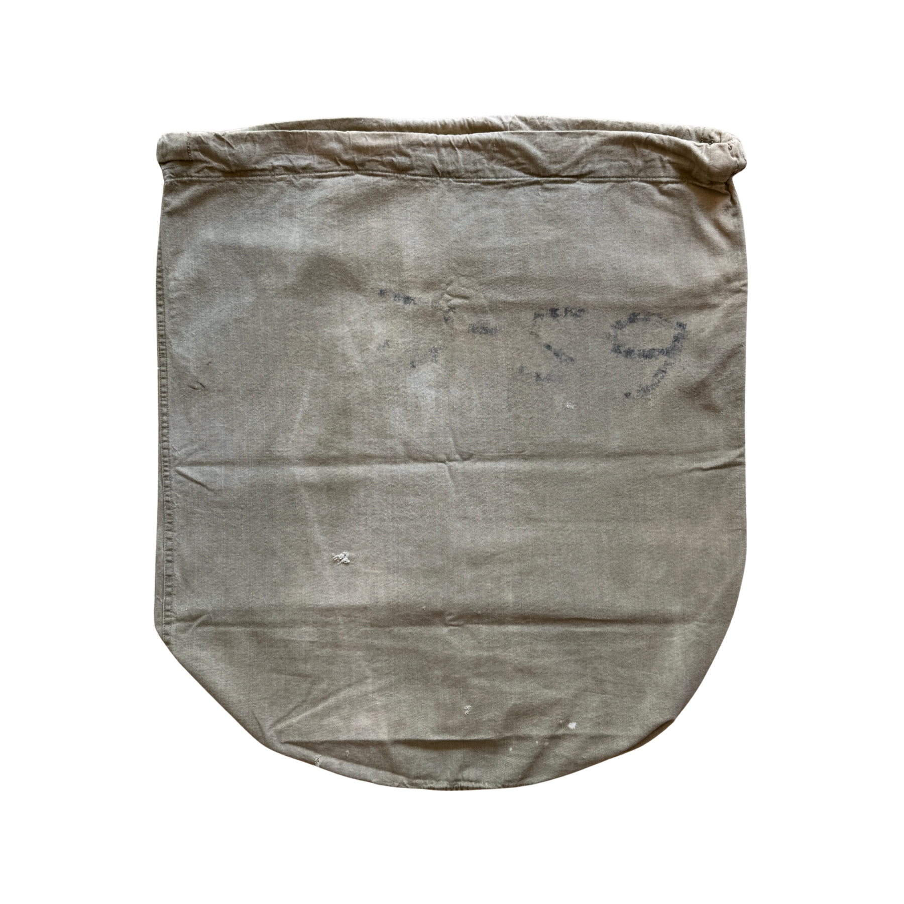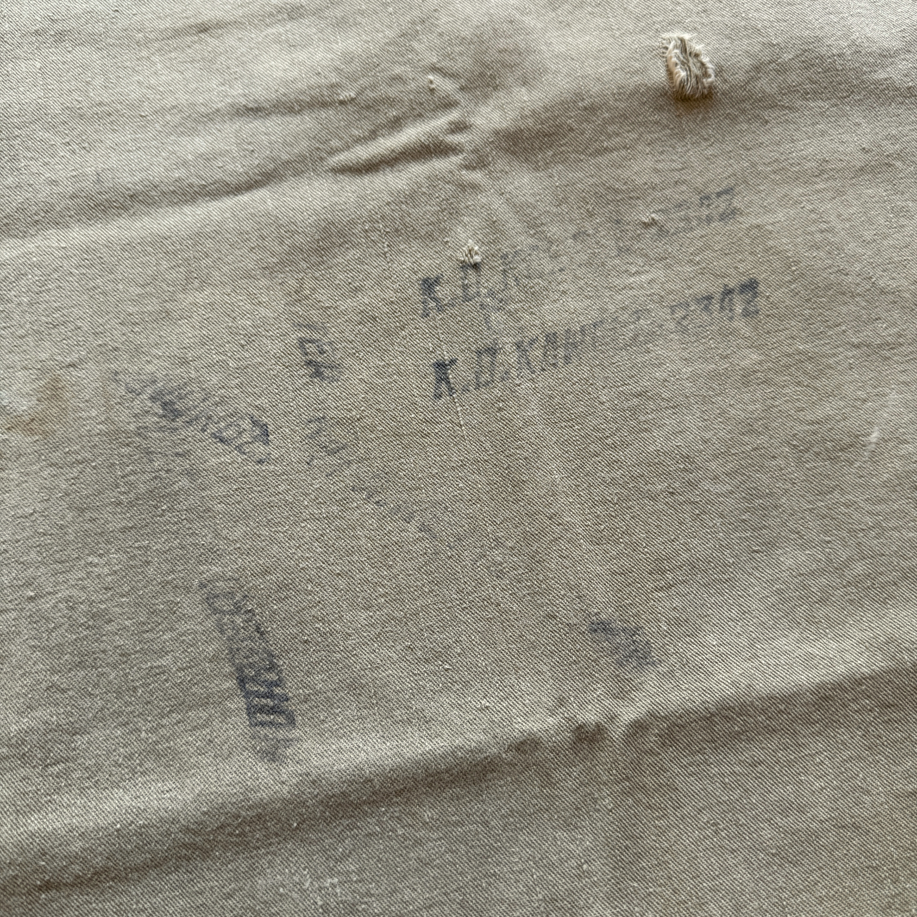 Features a faded green color that almost looks grey, custom stencils on both the front and back, and overall distressed, faded look.