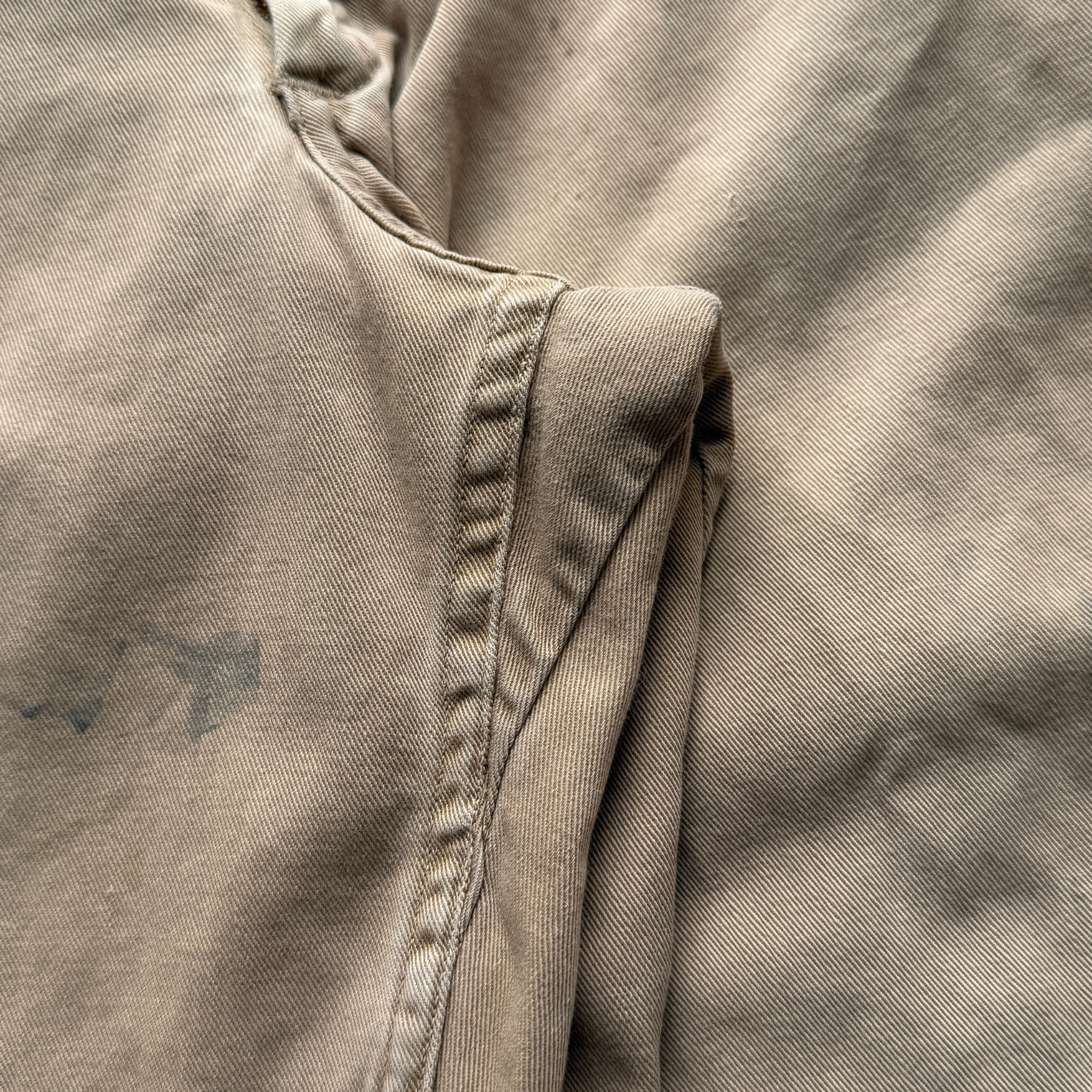 Features a faded and distressed soft tan twill cotton/nylon blend material, hand repairs done to each pocket drop to ensure wearability, Talon branded zipper fly, and cuffed leg openings.