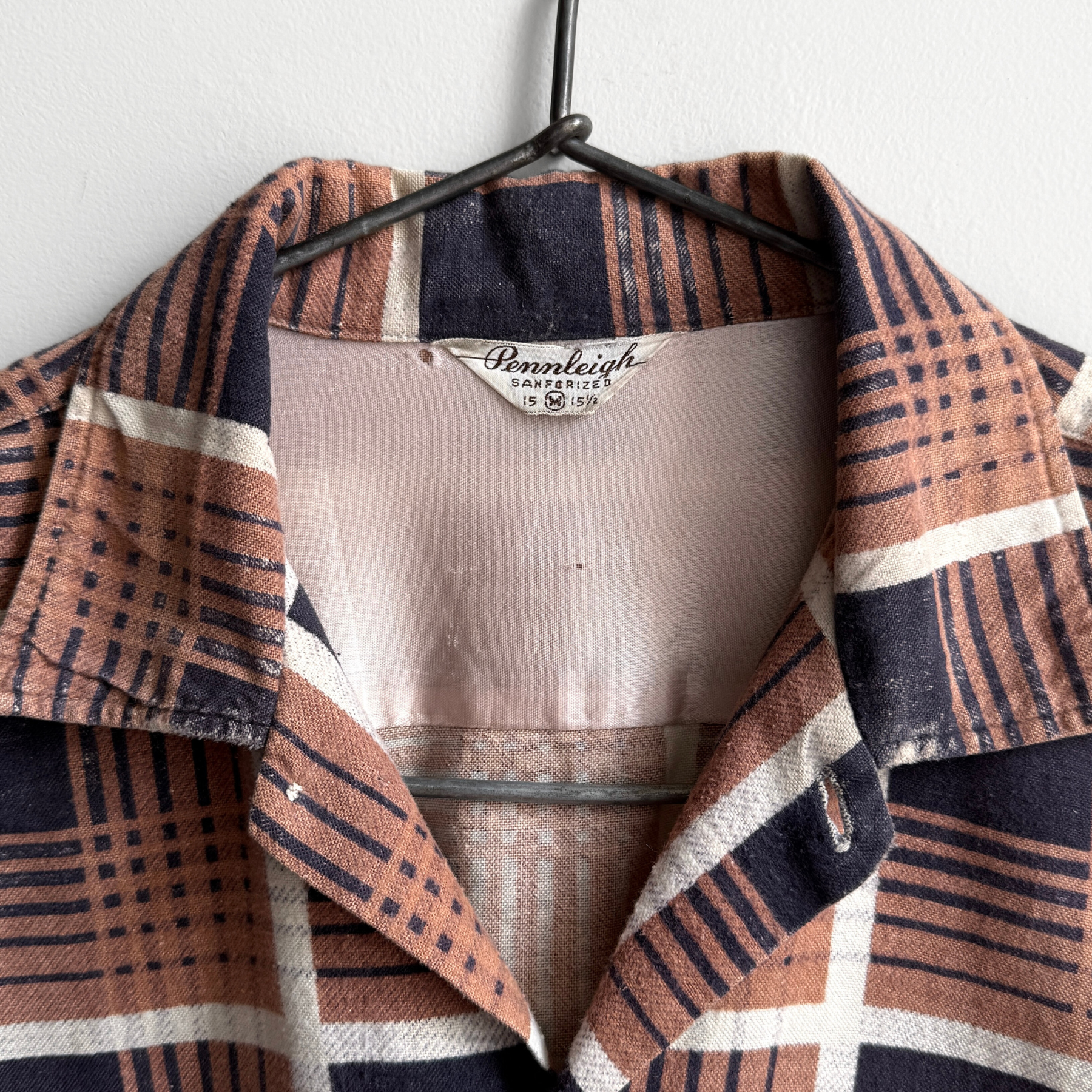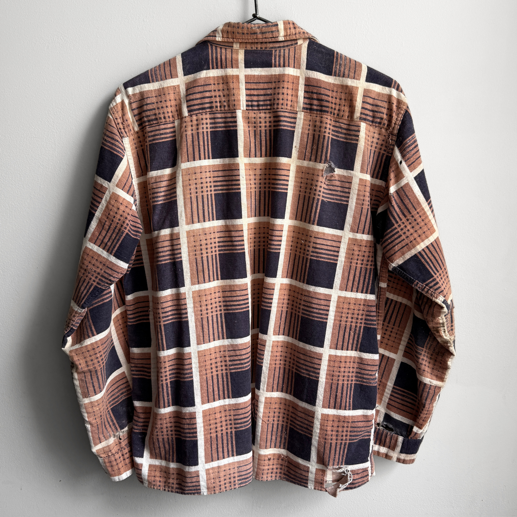 Features a distressed brown and black geometric print plaid, single chest pocket, pink satin shoulder lining, and great fading throughout. Has heavy signs of wear as shown. See photos for more.