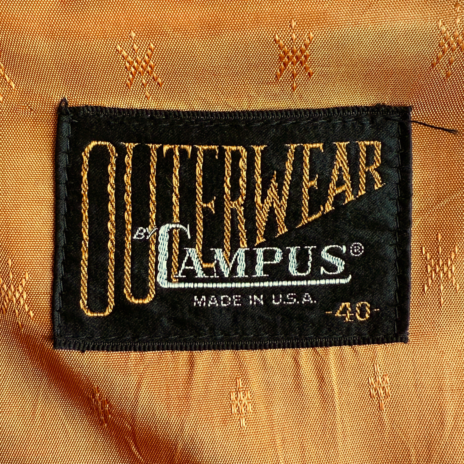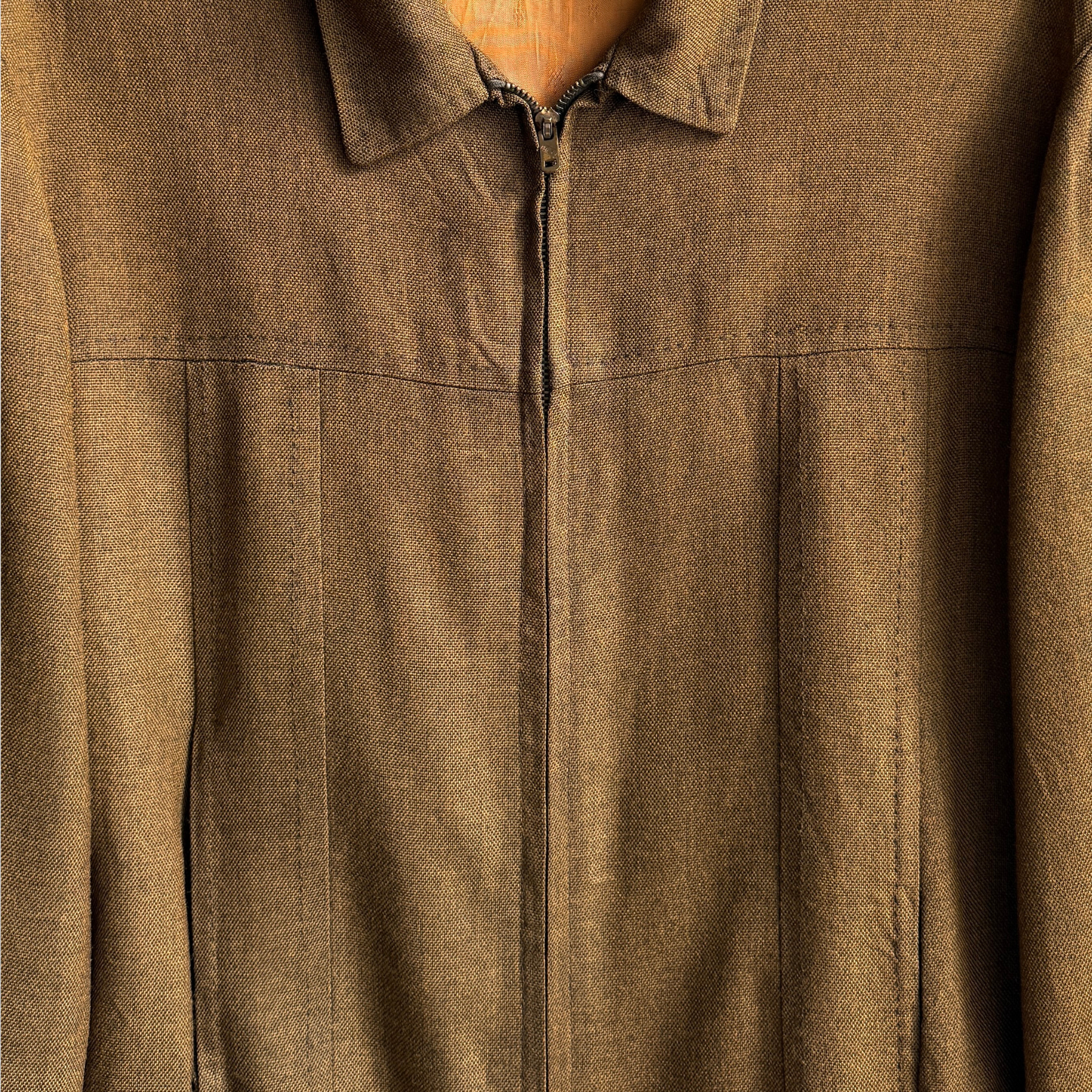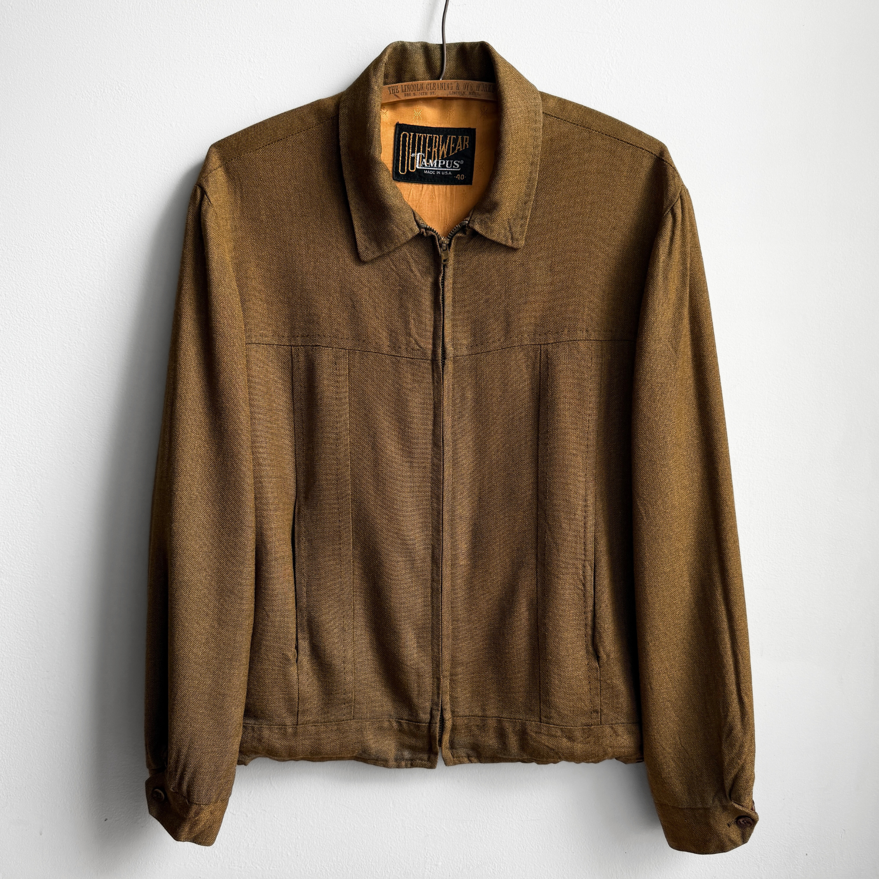 This rockabilly style jacket by Campus features a drapey brown gabardine shell with an orange embroider-detailed satin lining, front torso pleats with visible brown stitching across the chest and collar, zip up front, and overall in excellent condition.