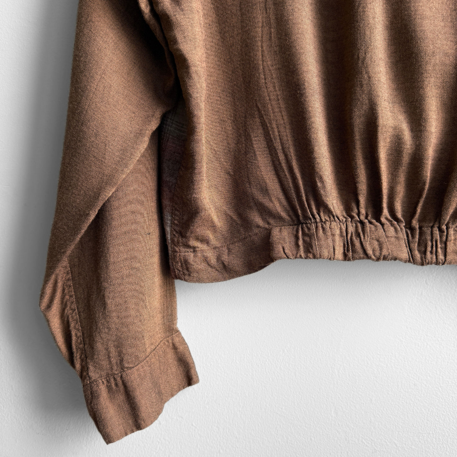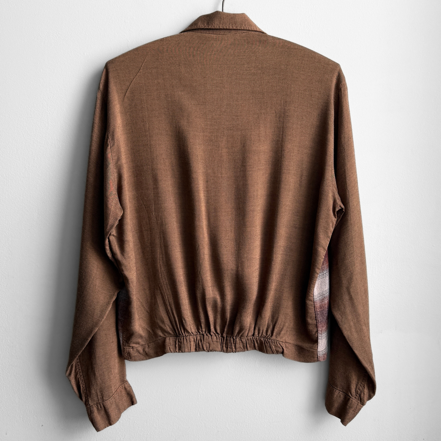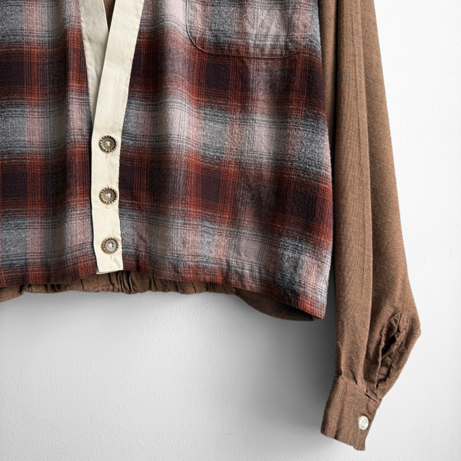 Features a brown base color with a shadow plaid torso flannel-like panel, elastic hem on backside, cropped fit, decorative front buttons, single chest pocket, elongated sleeves, and loop collar.