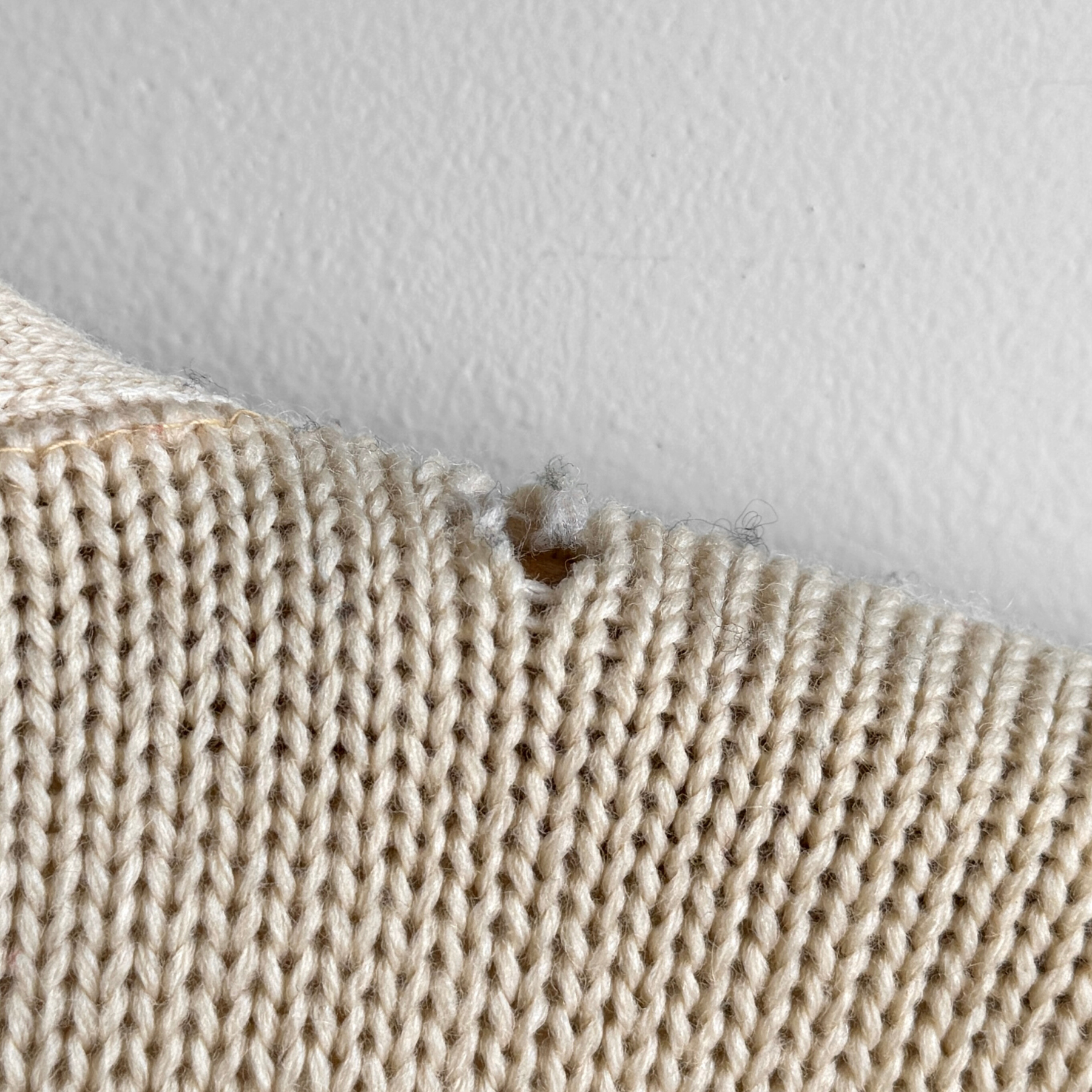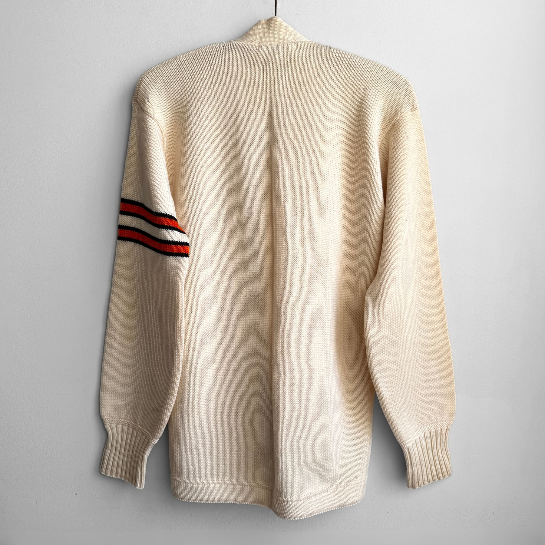 Features a cream wool colored base with orange striped sleeve and two hand pockets at the waist. Overall in excellent condition besides a small hole shown. Super heavy letterman sweater.