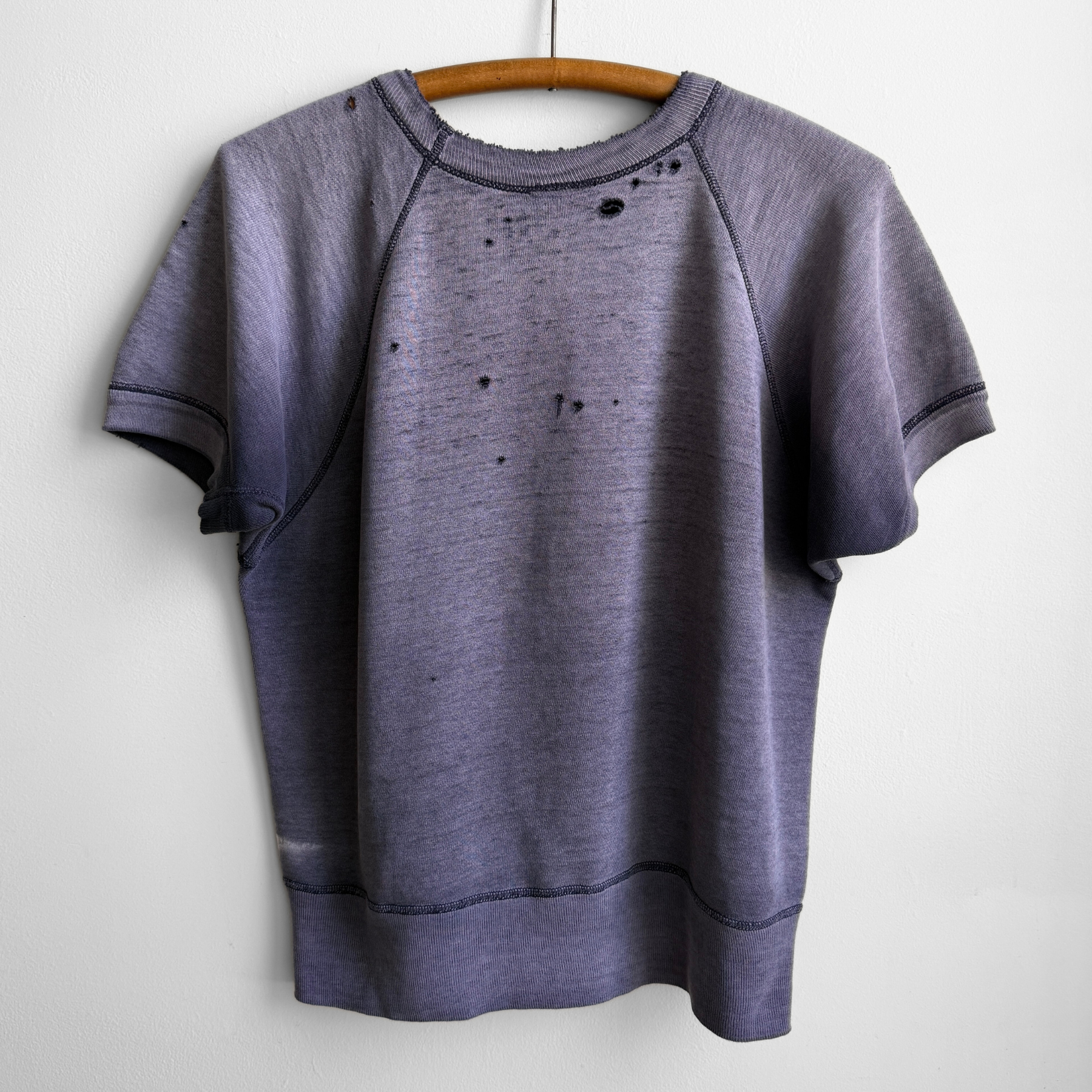 Features a perfectly sun faded blue color, raglan sleeves, and short sleeve fit.