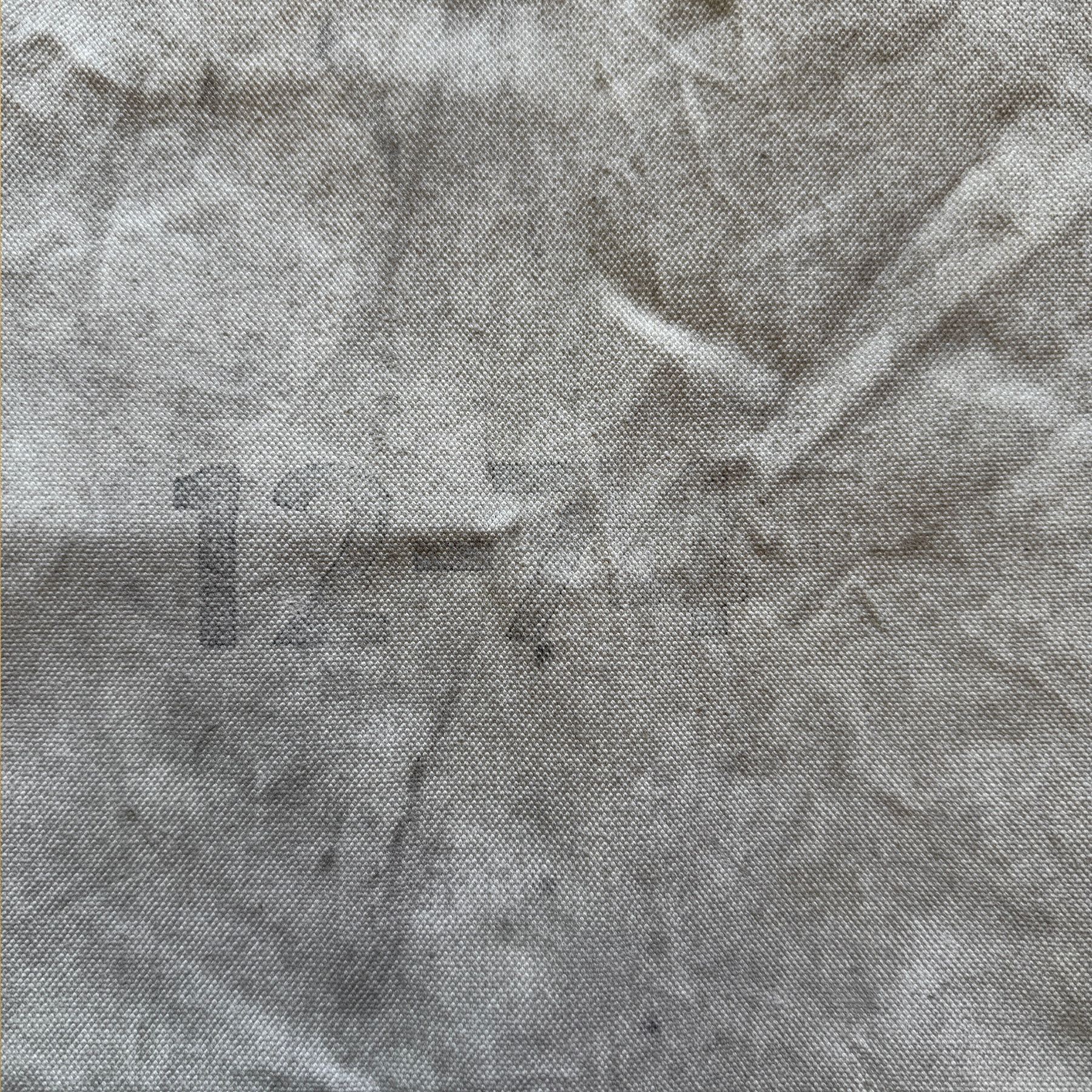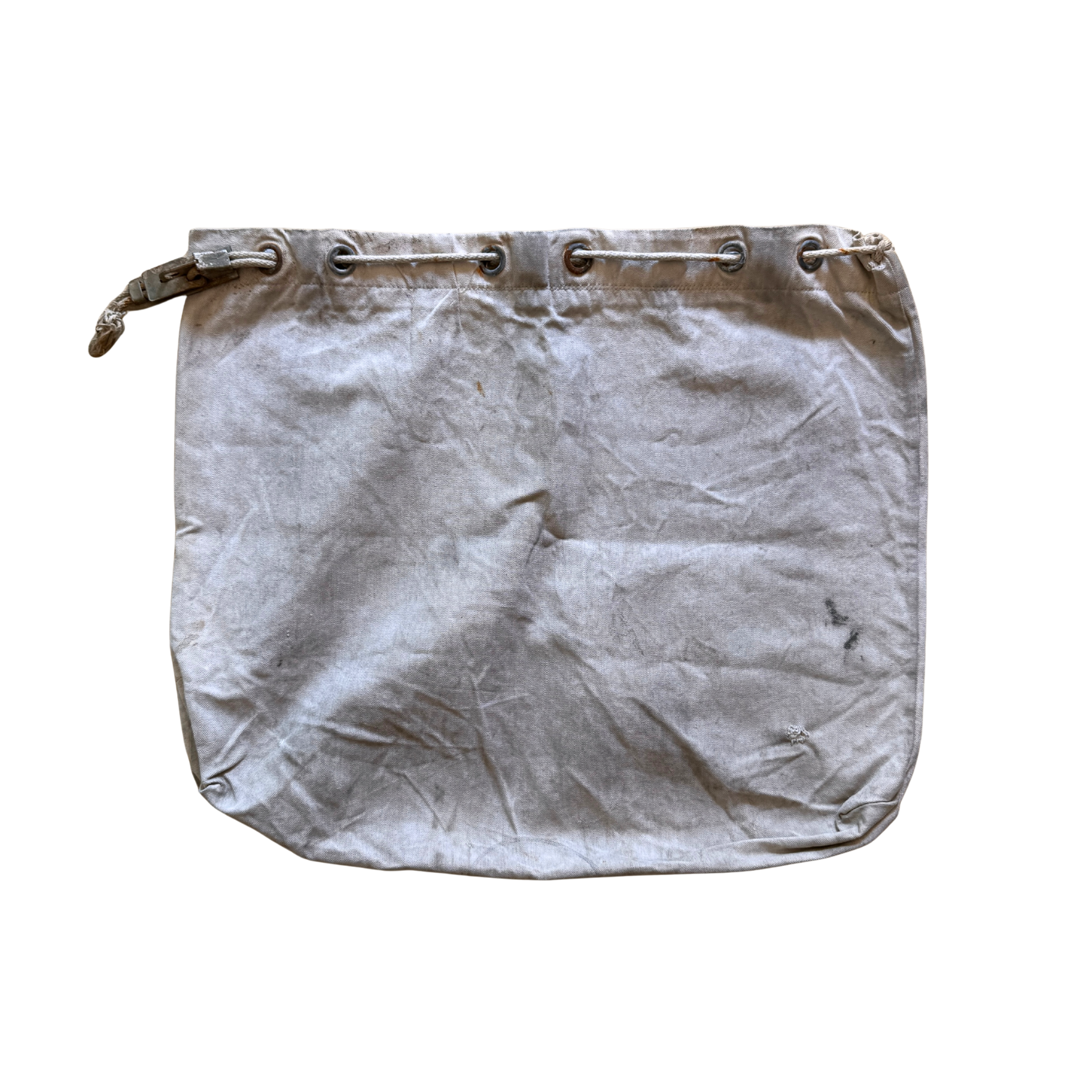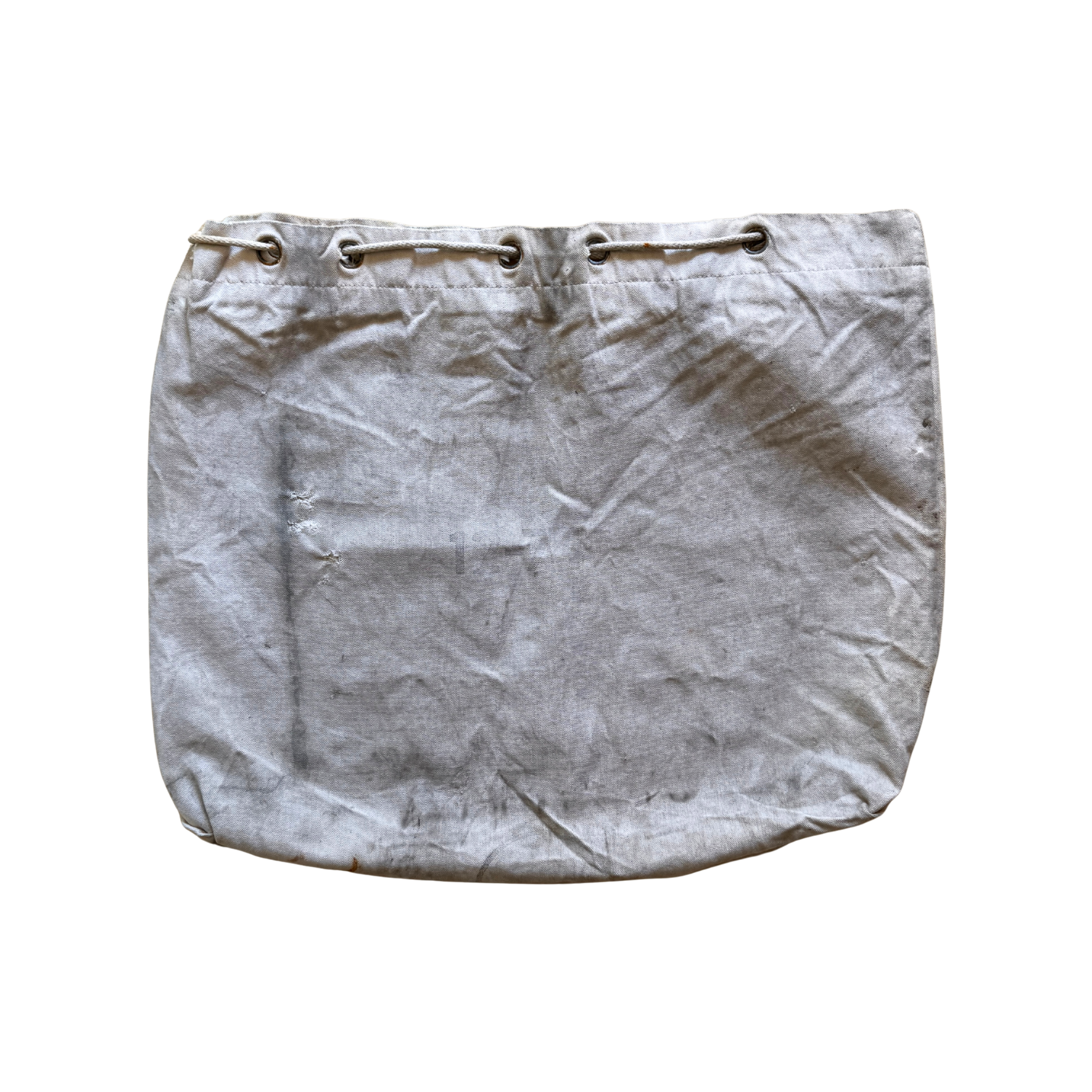 Features a faded white canvas material, metal grommets and locking mechanism, and stencil on oen side. Has some rust as shown.
