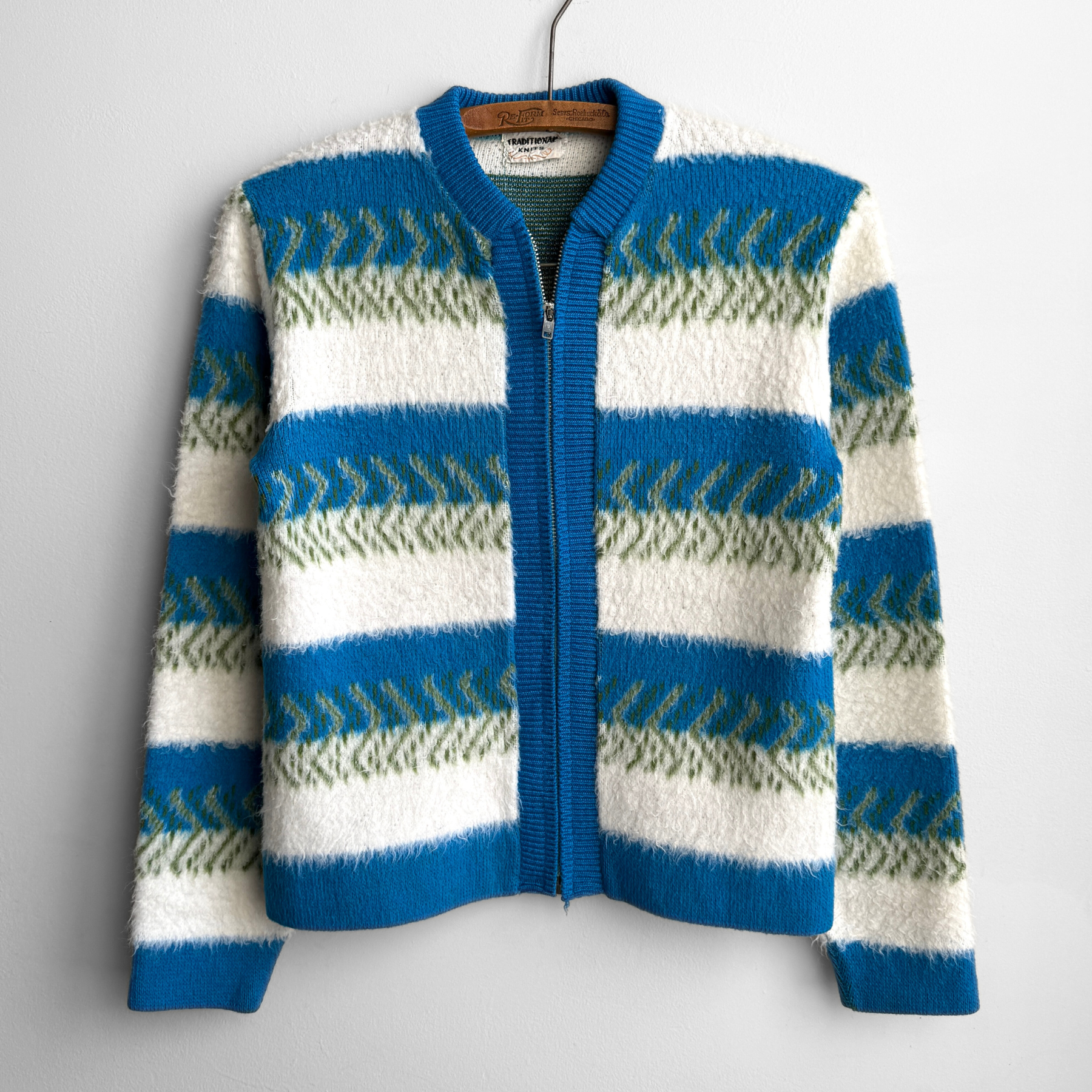 1960s Blue & Green Geometric Knit Zip Up Cardigan