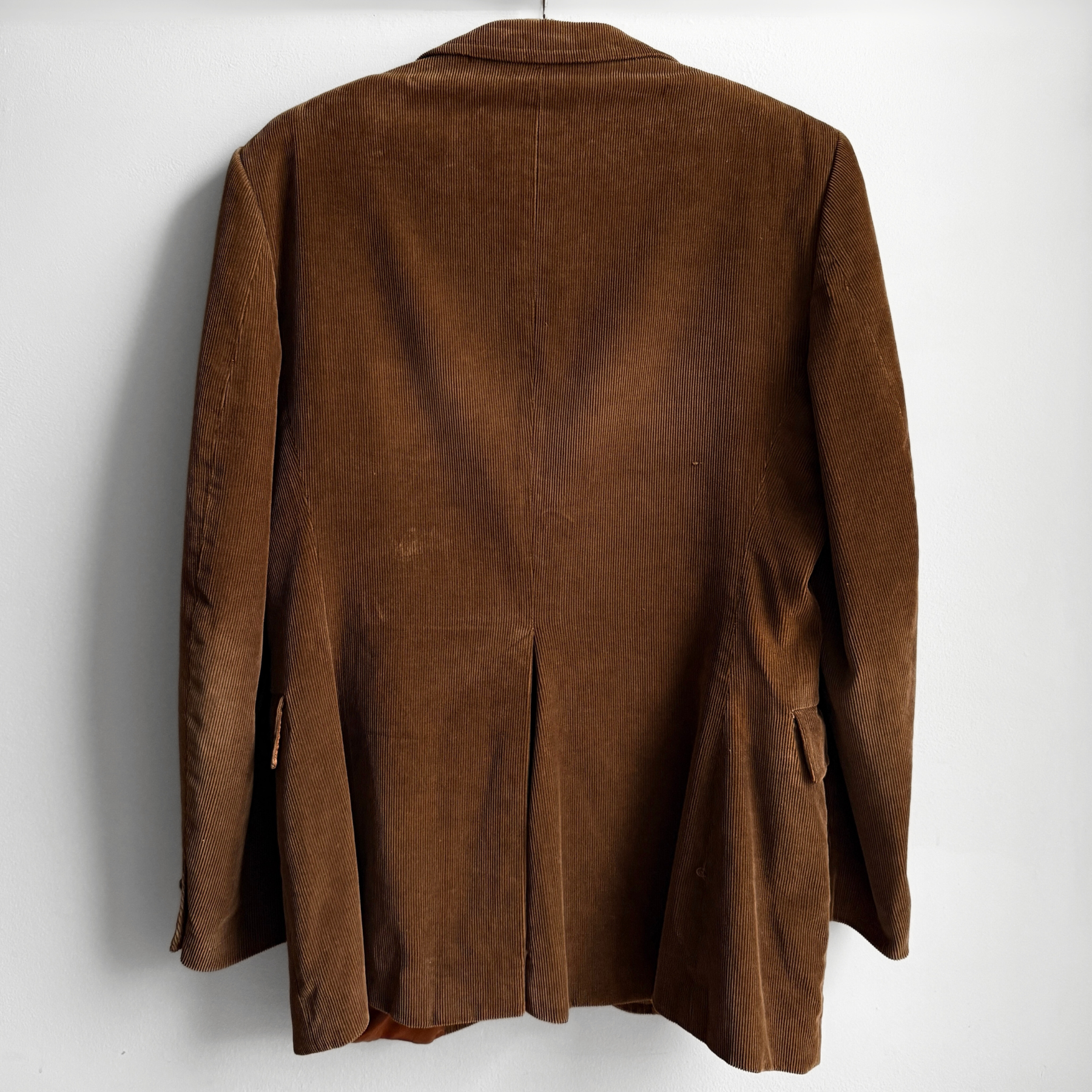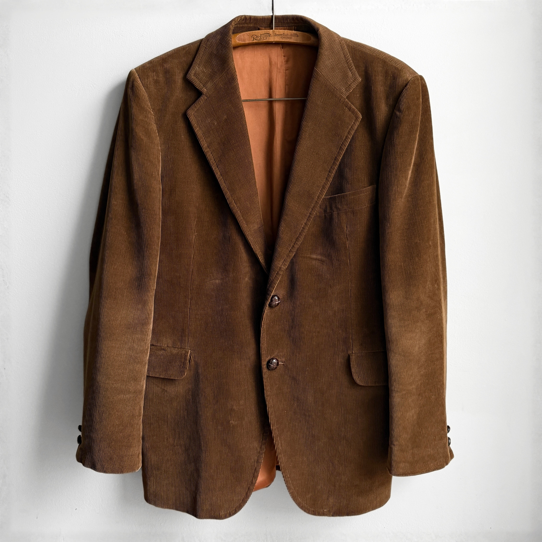 Features a chocolate brown corduroy material, button front, two waist pockets and single chest pocket, notched lapel, and bronze orange colored silky rayon lining. Professional dry clean only.