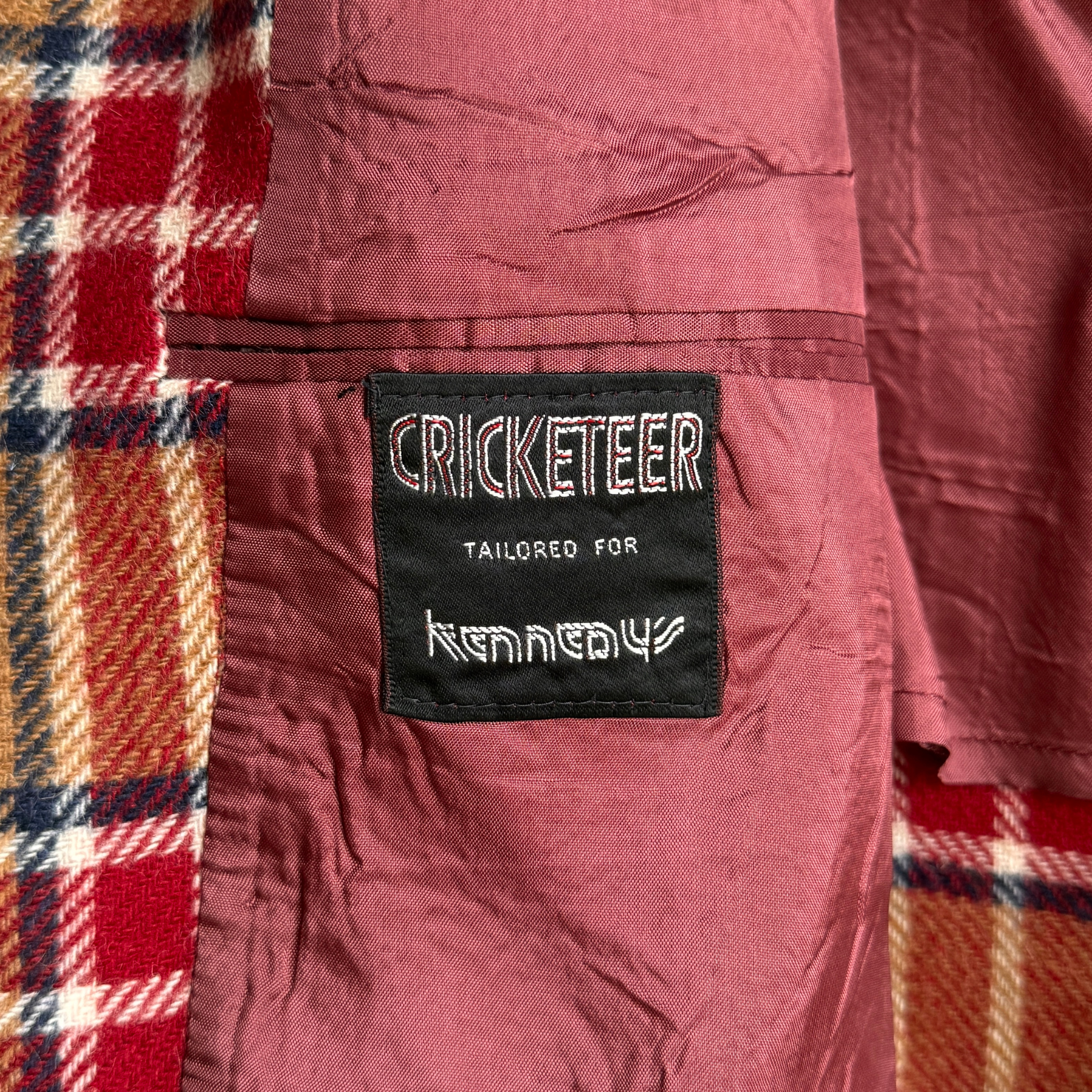 Features a brown base color with red and white plaid check pattern, two-button front, two front pockets, and a notched lapel.