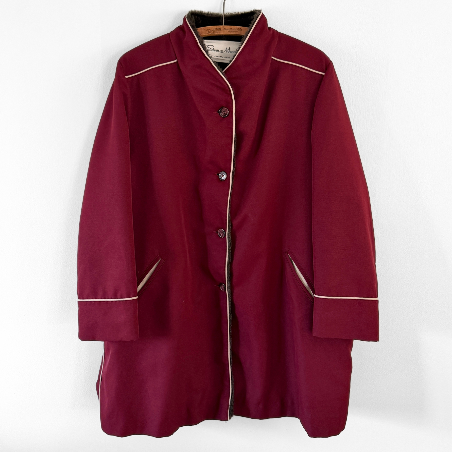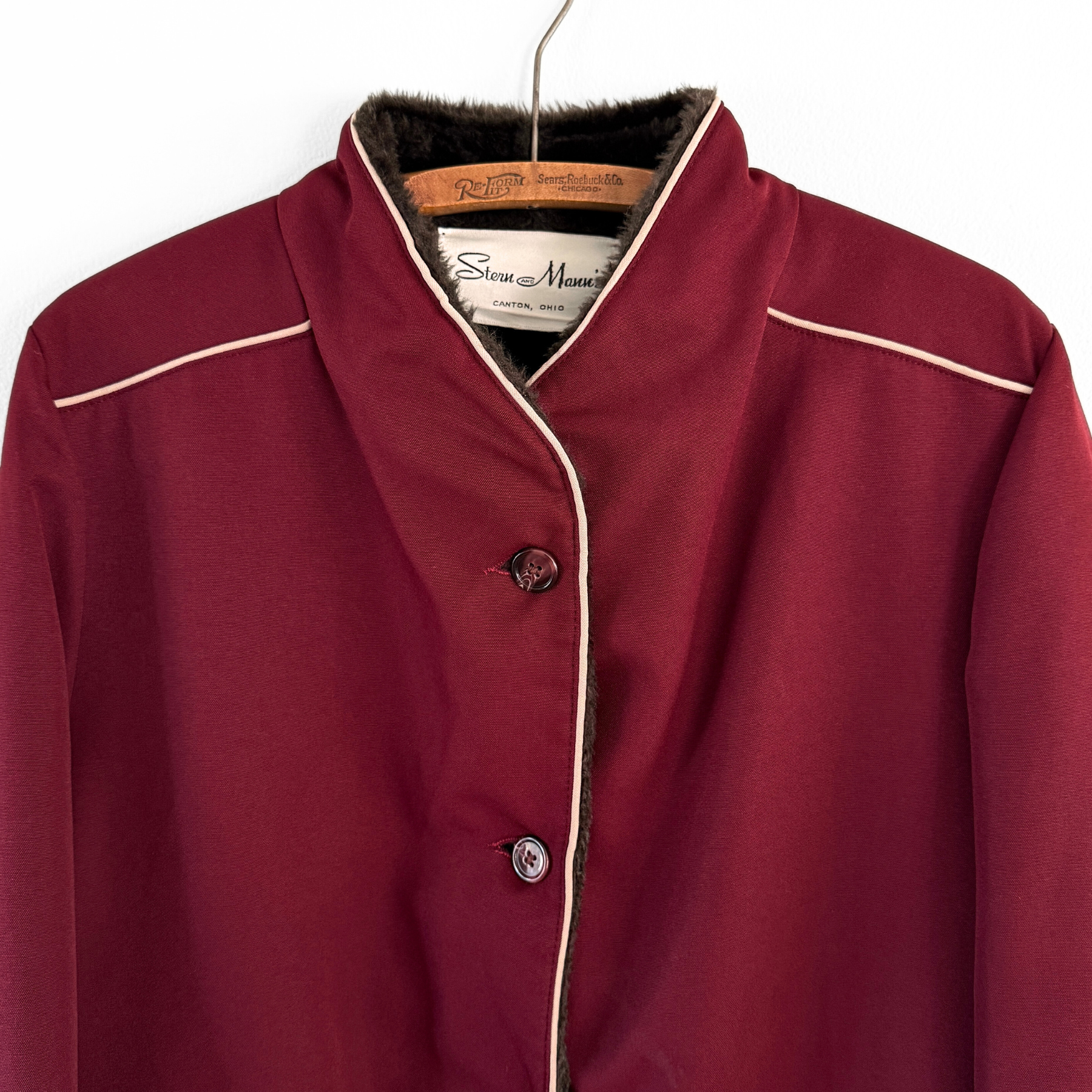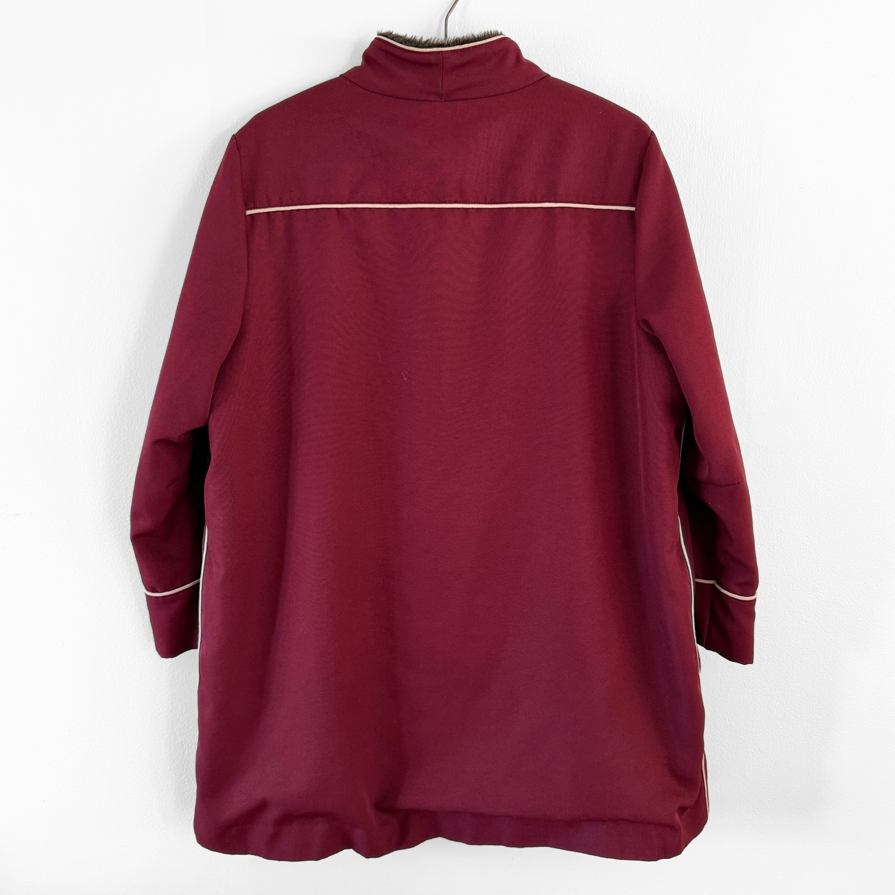 Features a light outer shell material, fuzzy sherpa lining, and mandarin collar.