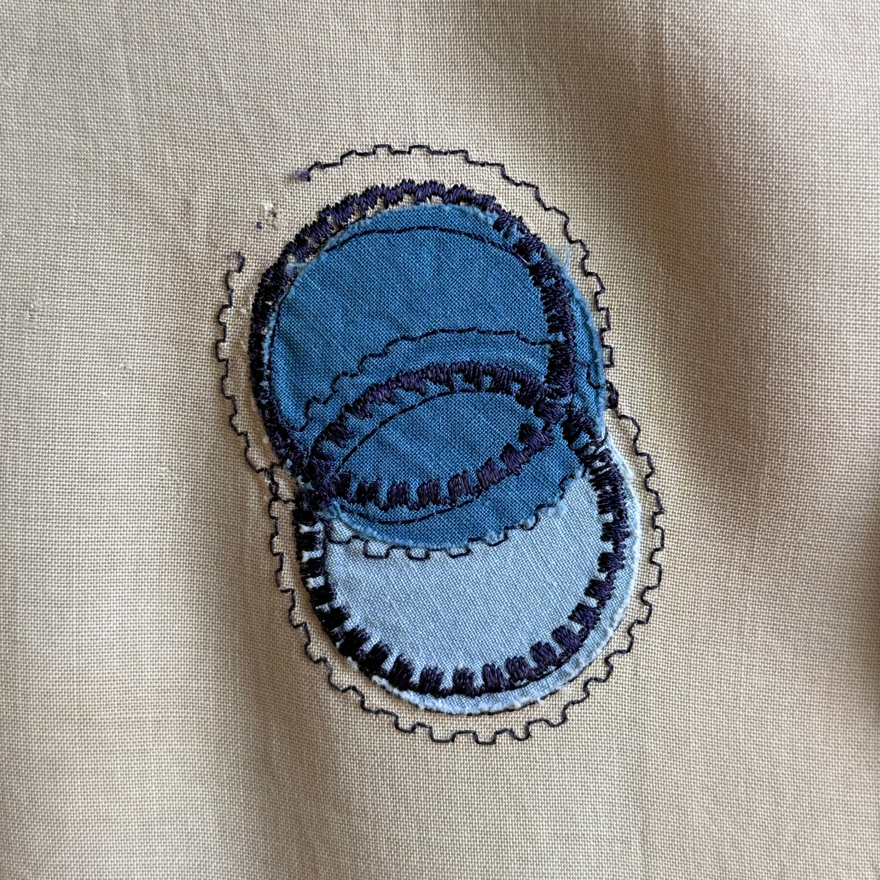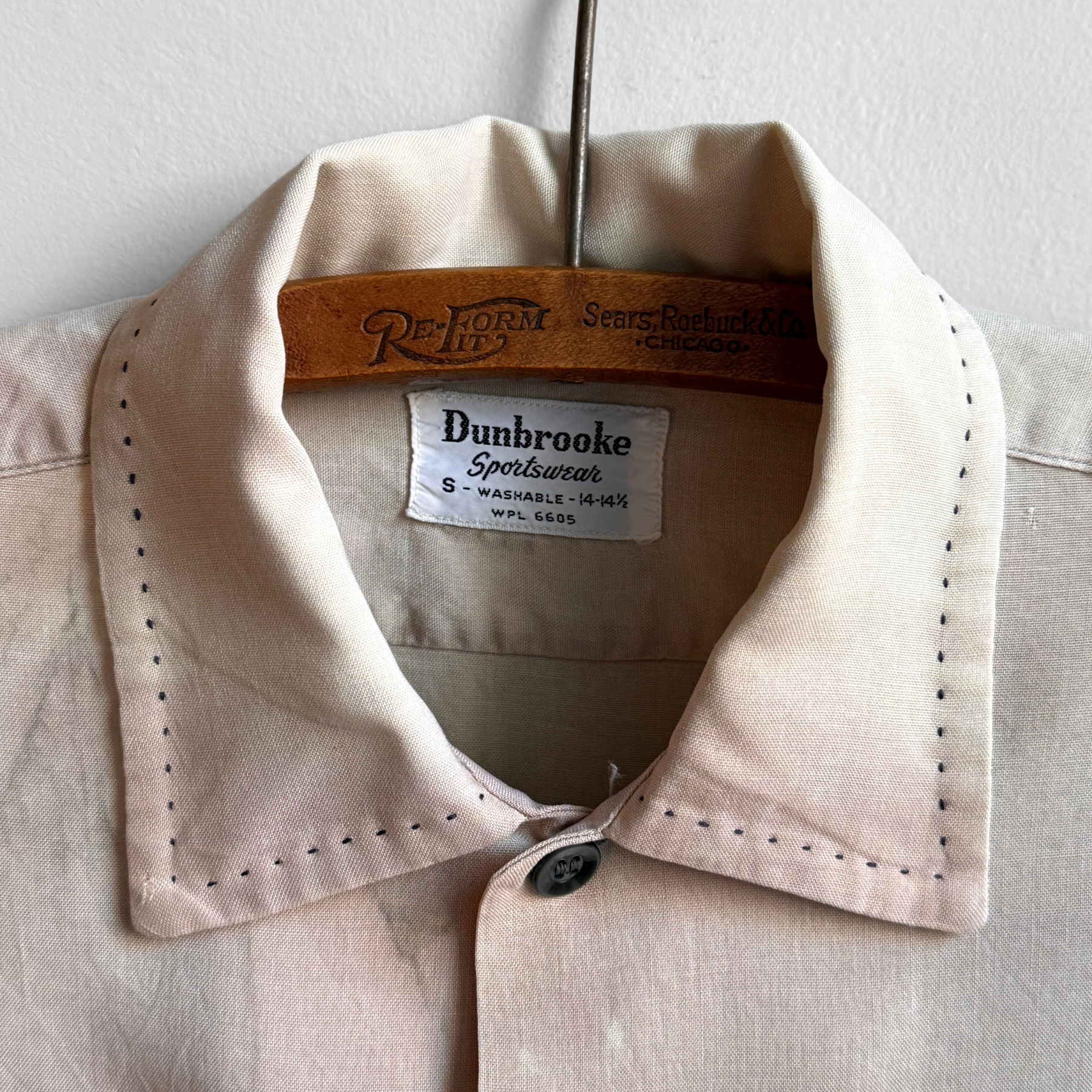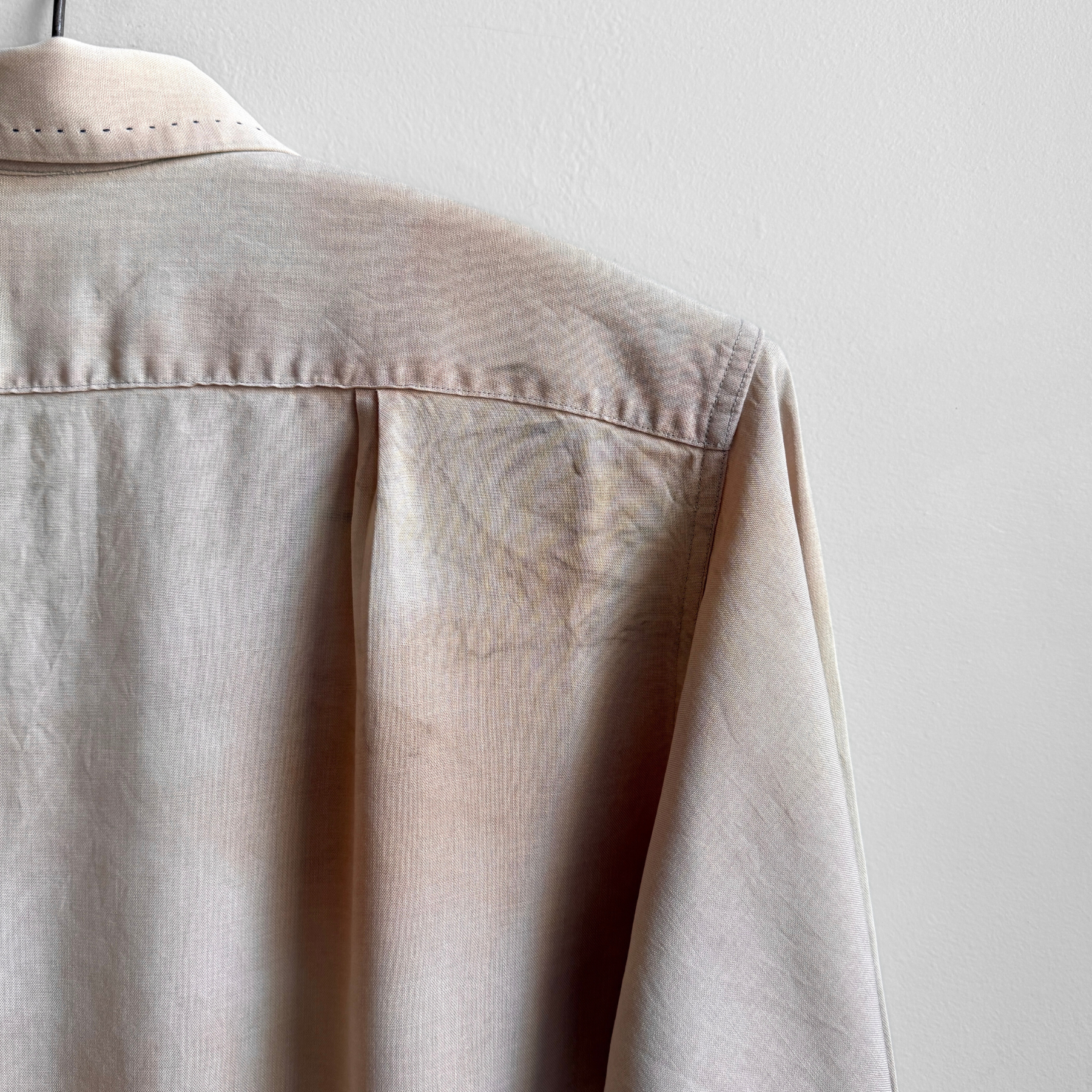 Features a really unique dye faded rayon material, blue chest embroidery, and single stitch needle tailoring details.