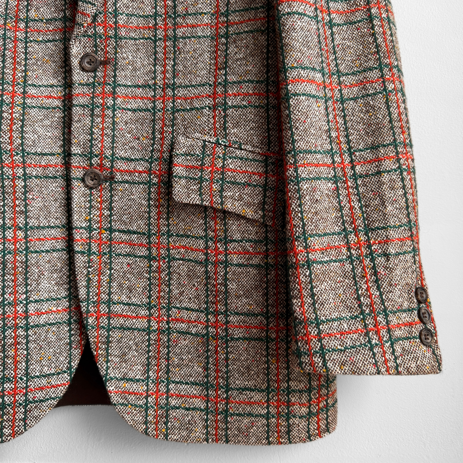 Features a brown base color with green and orange windowpane check plaid, two-button front, two front pockets, and a notched lapel.