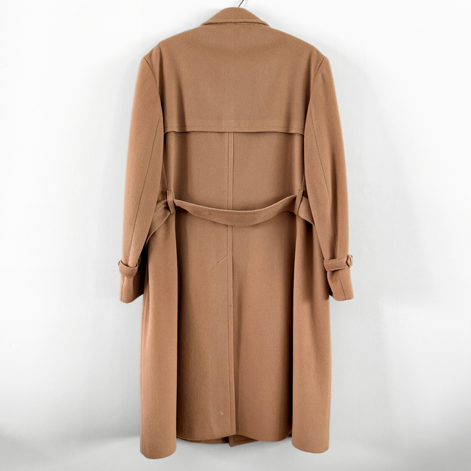 Features a heavy, light brown wool outer shell and silky rayon lining, full torso belt with buckle, 3-button front design, collar buckle, two hand warming pockets, and large notched lapel.
