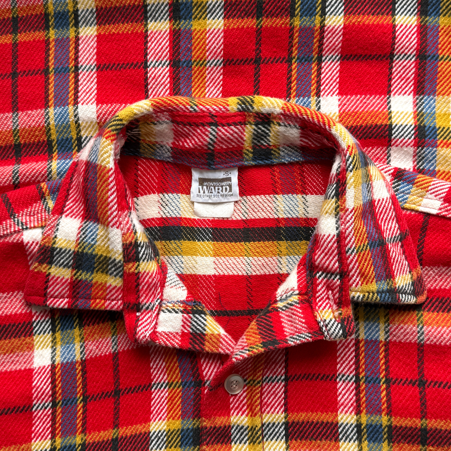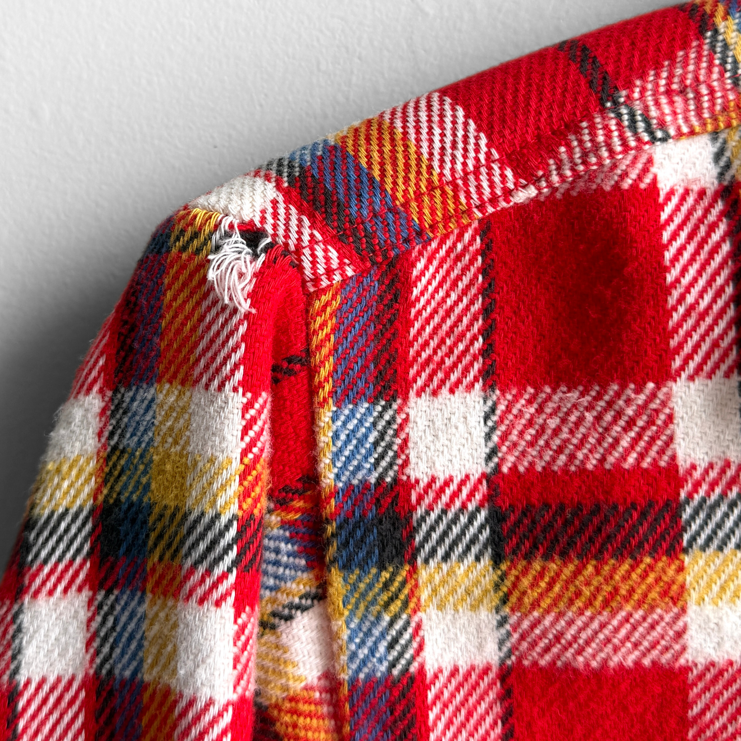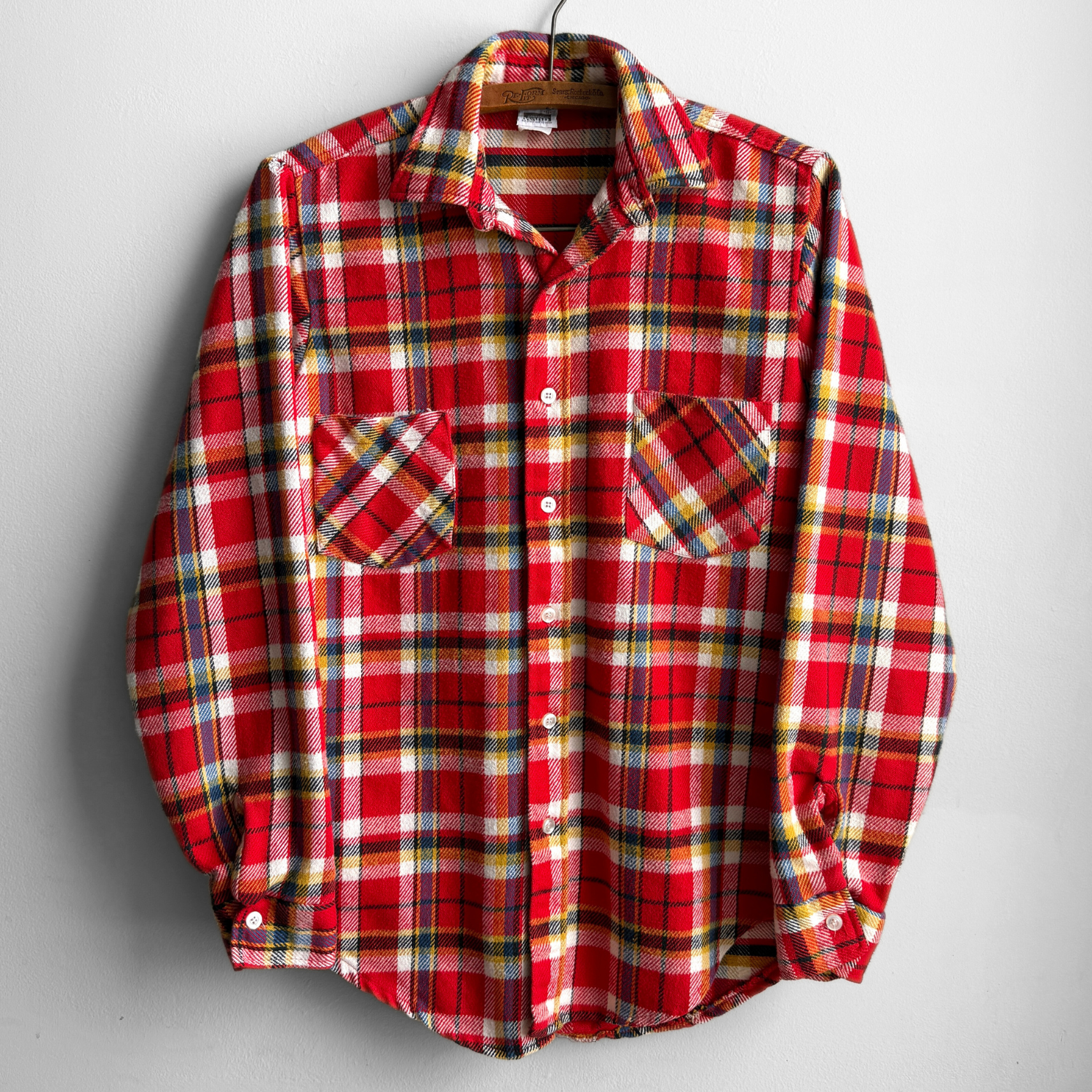 Features a red, blue, and yellow multi color plaid, woven cotton fabric, two chest pockets, sewn label tag, and overall excellent.