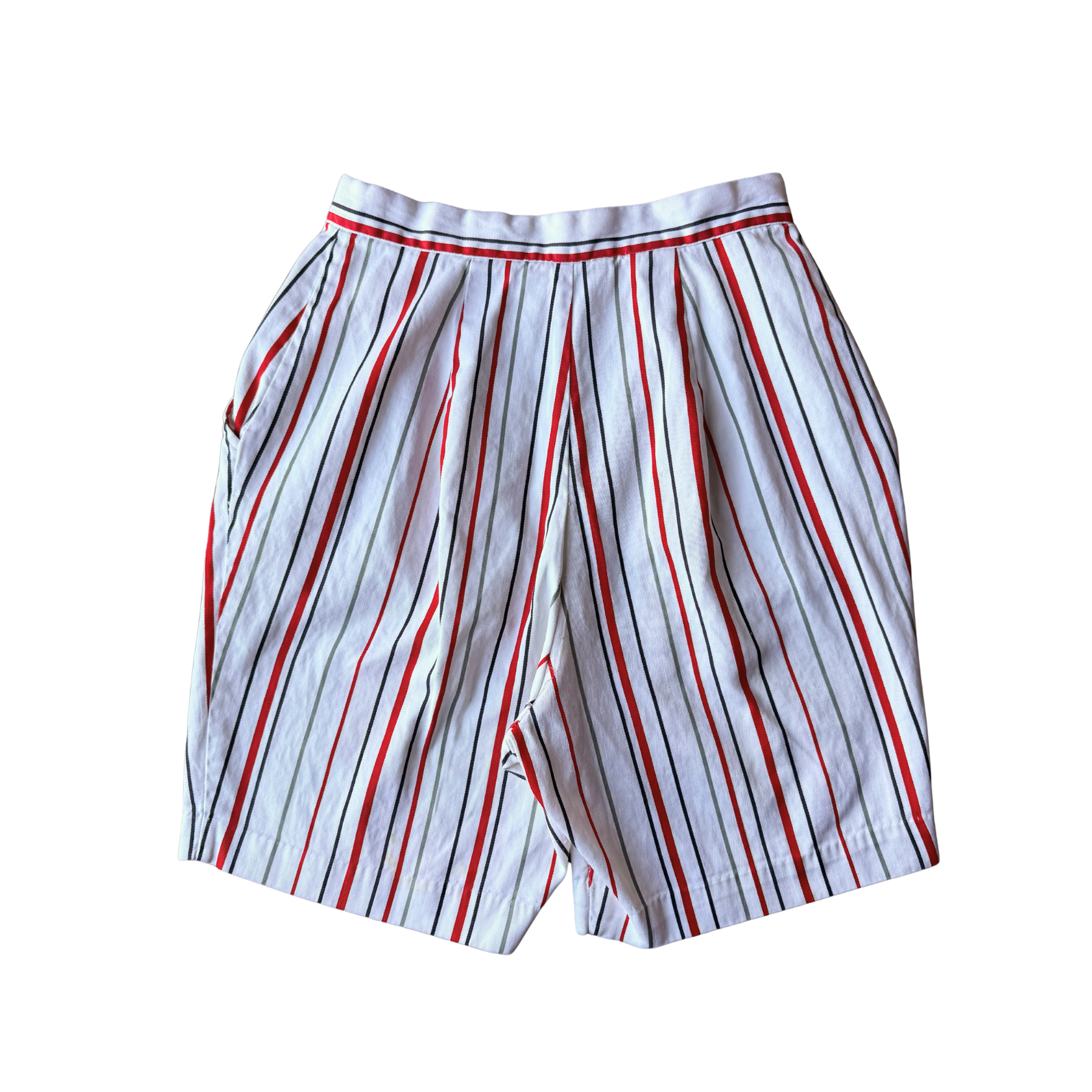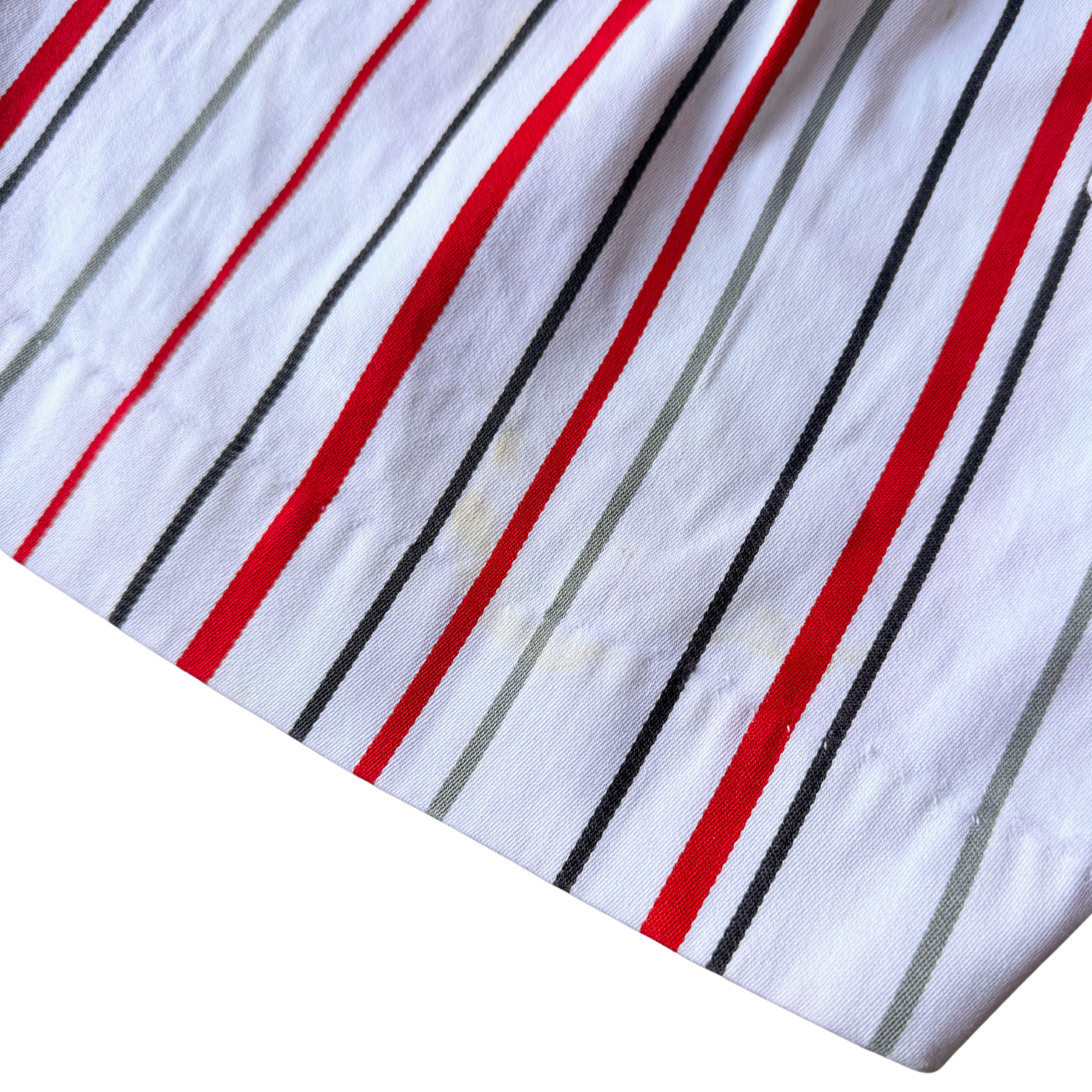 Features a red, white, and blue vertical striped pattern, double button closure with a Talon branded zipper fly, and high waisted fit. Has a small spot shown.