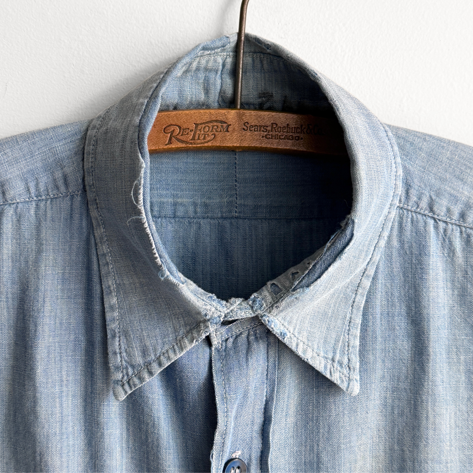 Features a faded chambray cotton material, embroidered name and sleeve patch, replaced button front, straight fit waist, and original owner's service number printed inside the collar. Has repairs done to seams throughout.