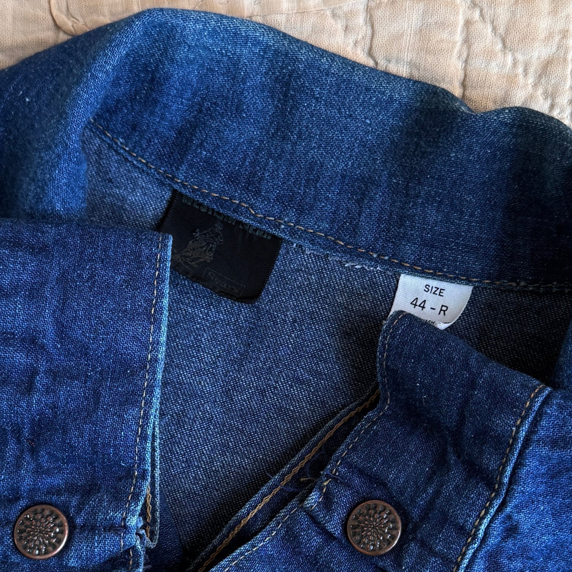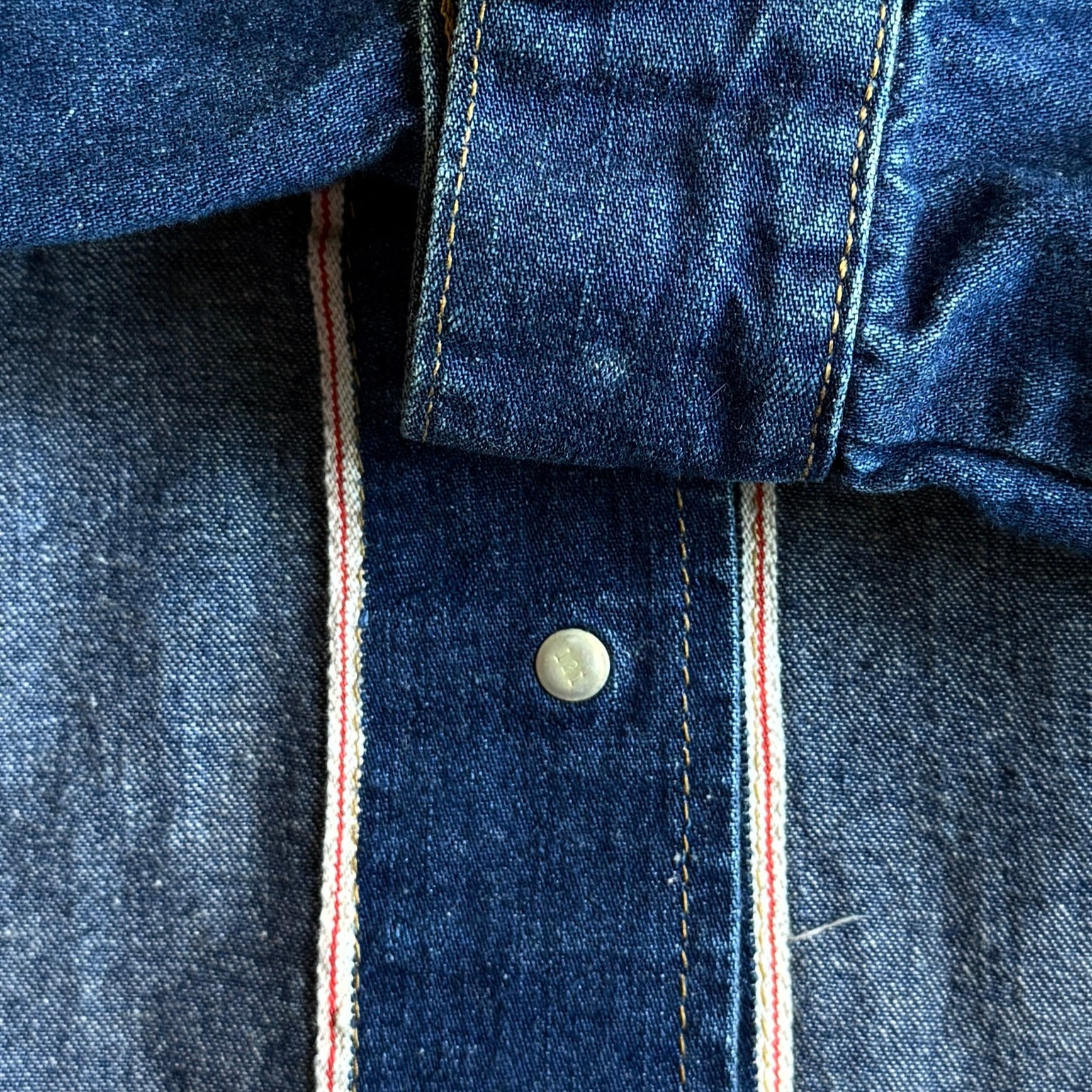 Features a dark blue denim material, selvedge front inside edge, snap button front, two check pockets, and overall in excellent condition. See photos for more.