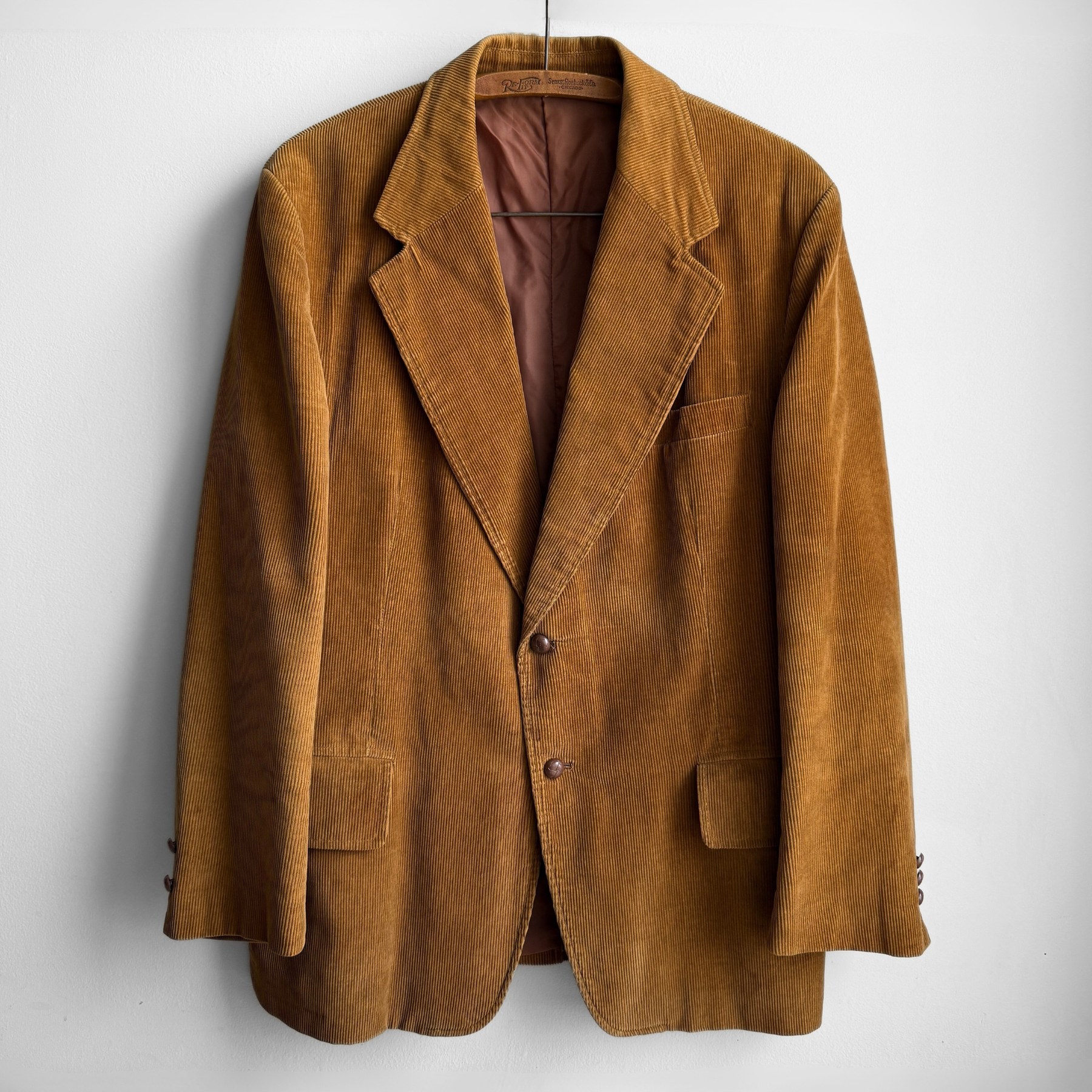 Features a brown corduroy material, 2-button front, two flap style waist pockets and single chest pocket, notched lapel, and reddish brown colored silky lining.