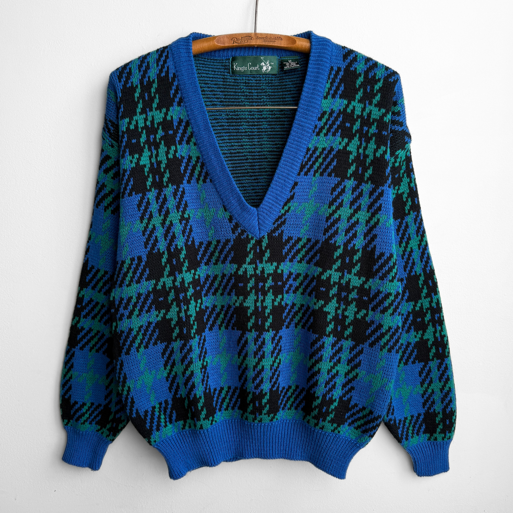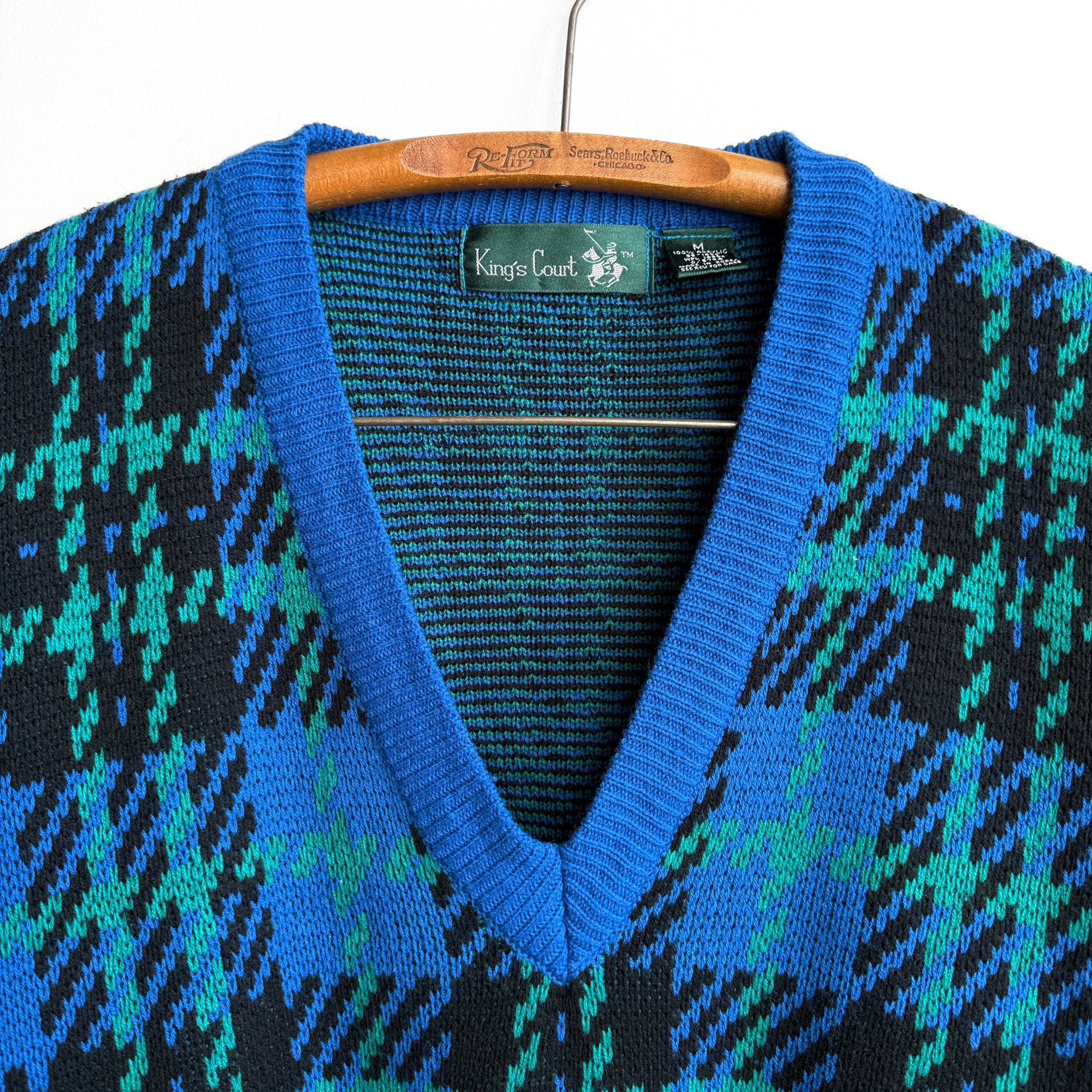 1970s Blue & Green Geometric Knit V-Neck Sweater