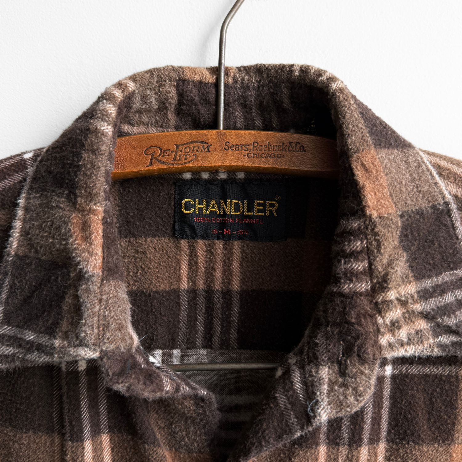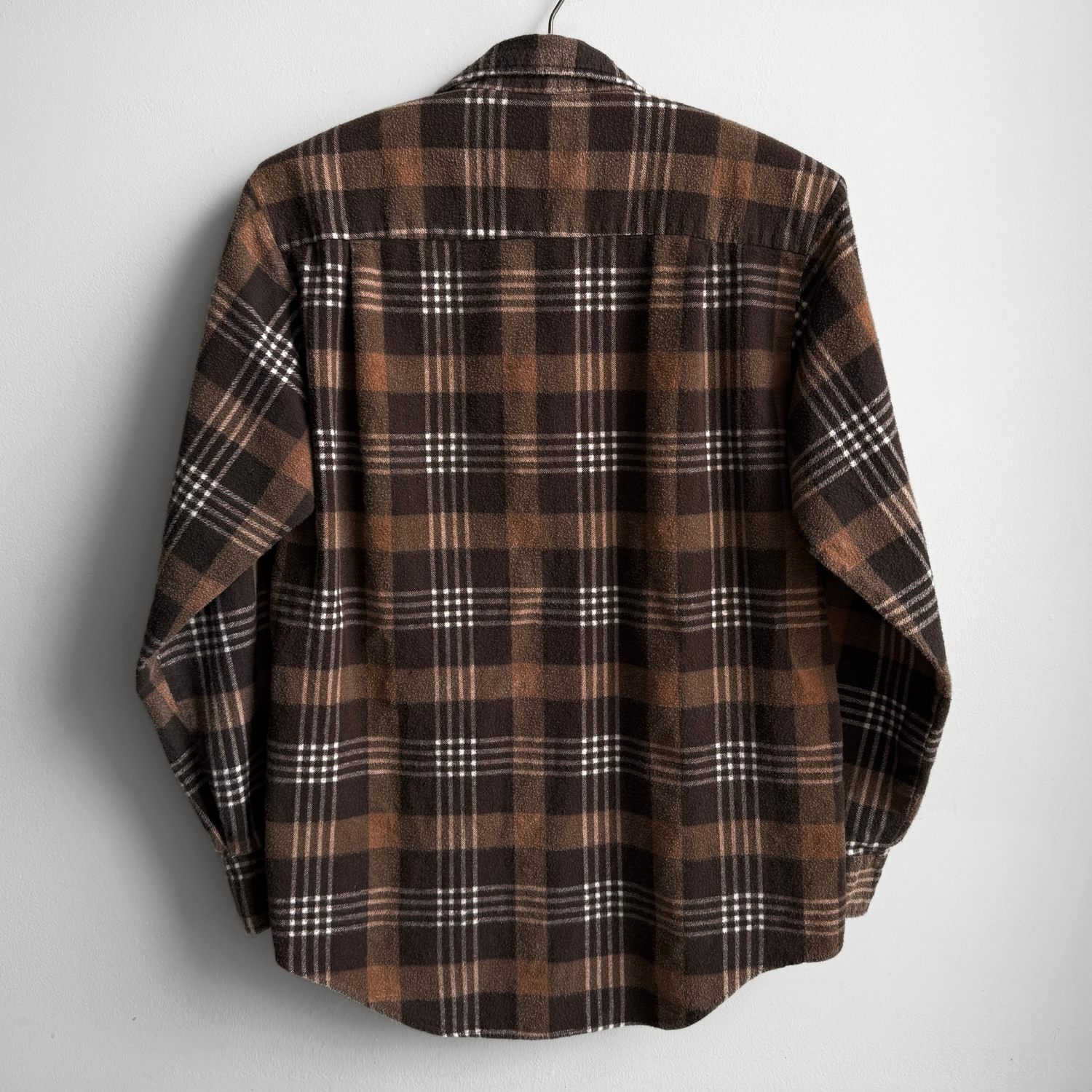 Features a brown plaid cotton fabric, two chest pockets, sewn label tag, and overall excellent condition.