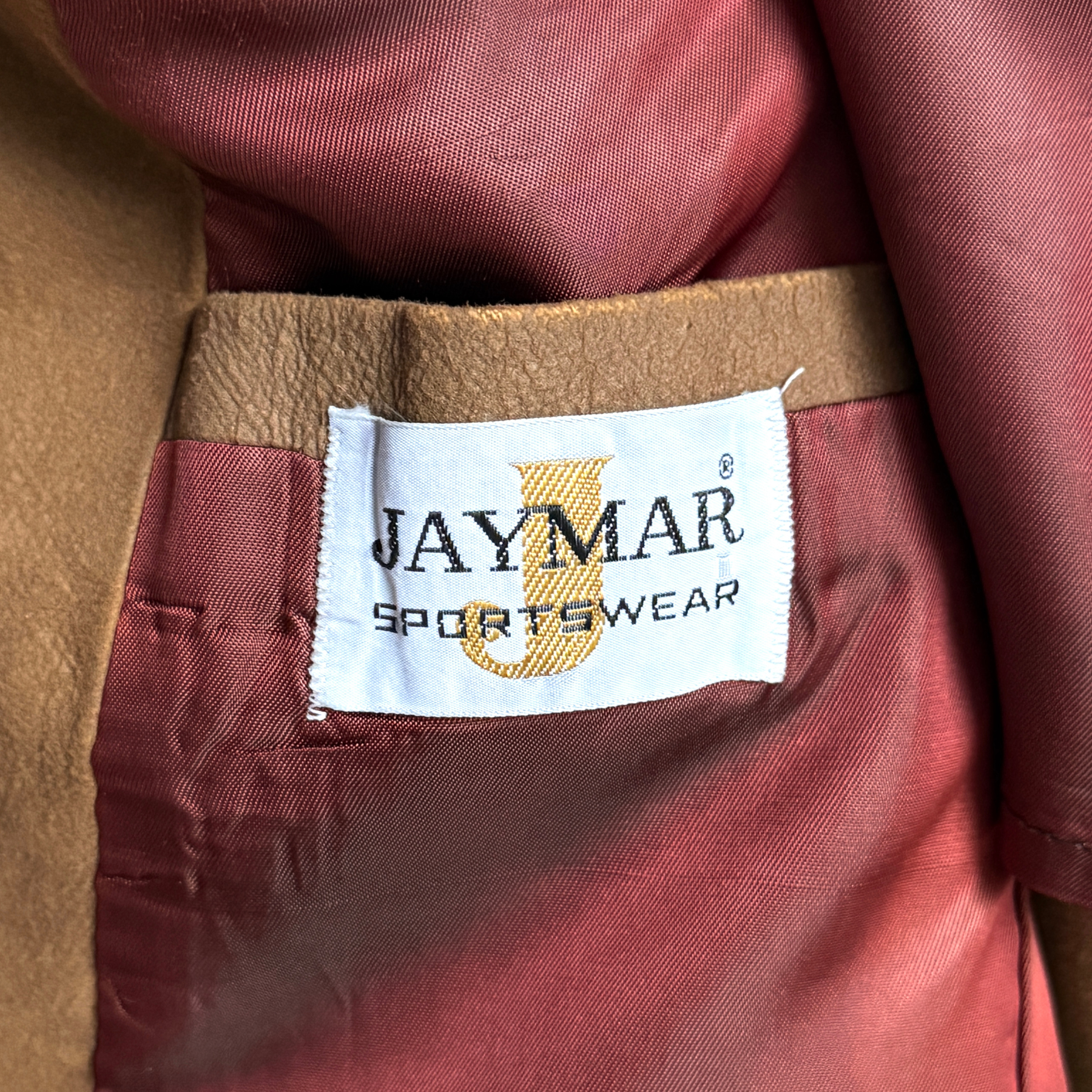Features a brown aged suede-like material, detailed 2-button front, two flap waist pockets, notched lapel, and dark red colored silky rayon lining. Professional dry clean only.