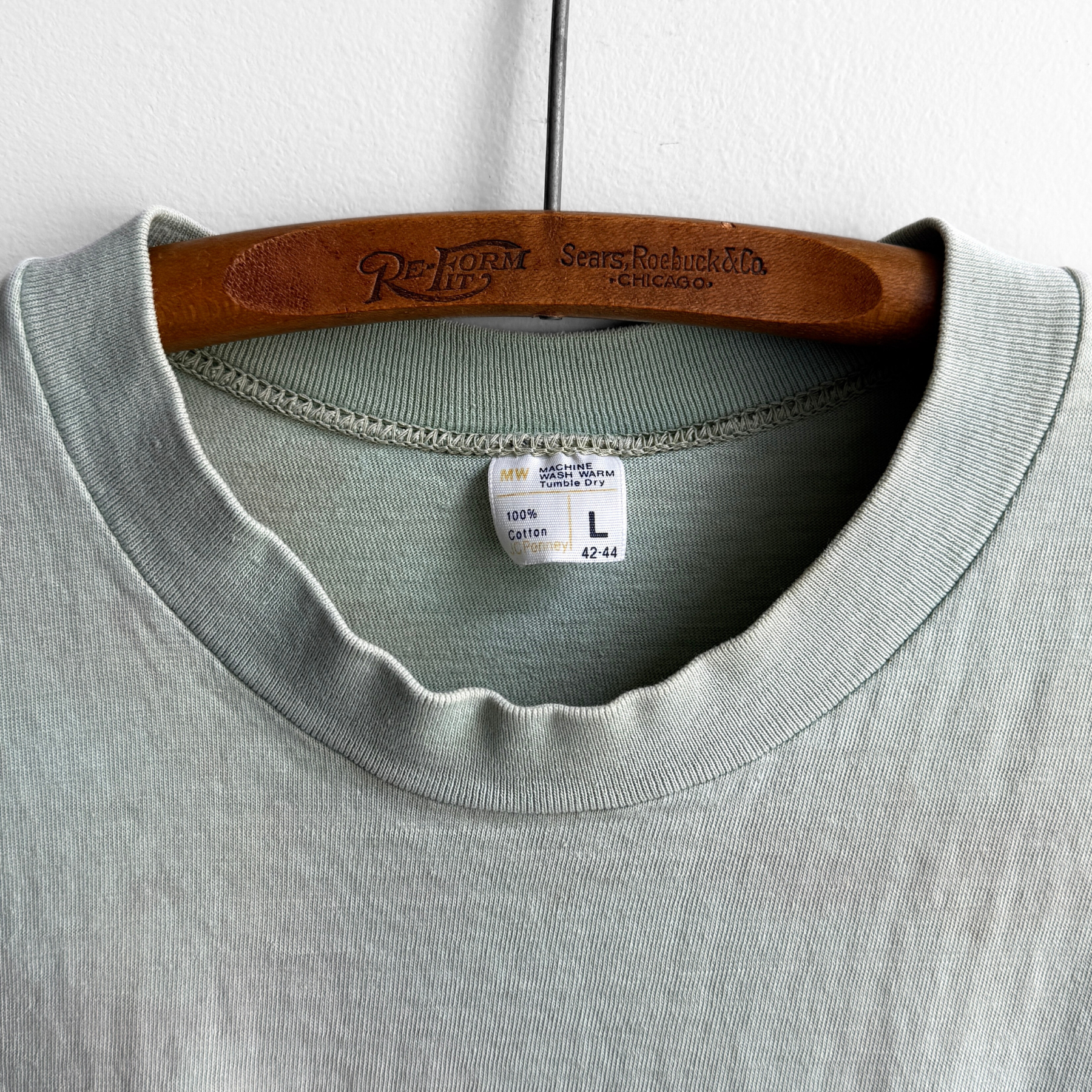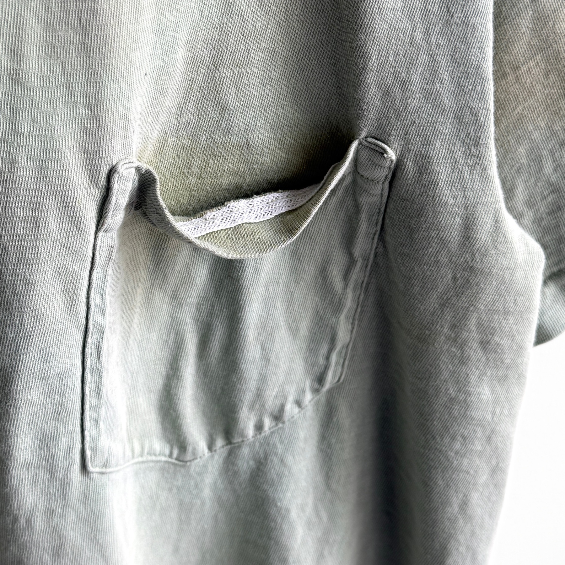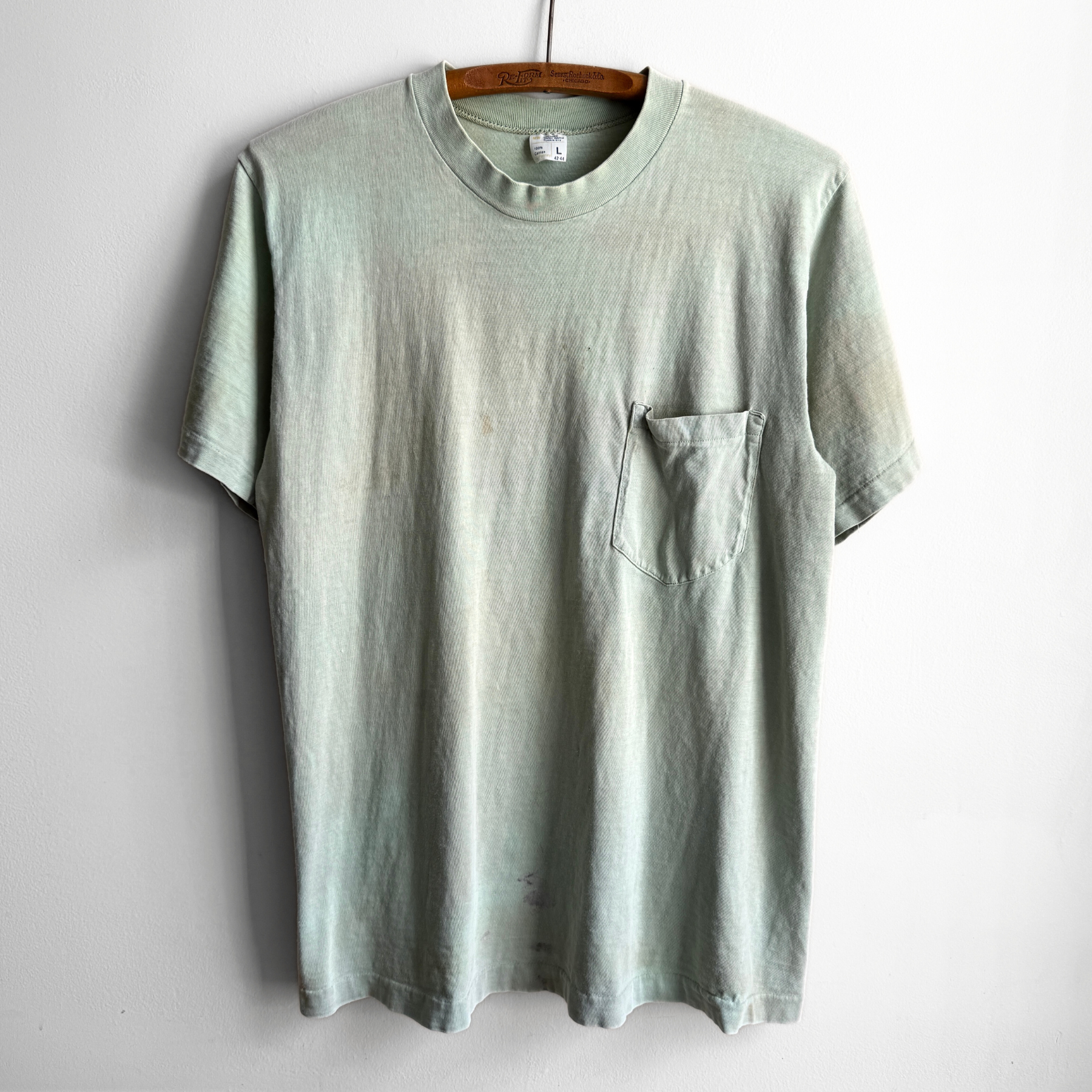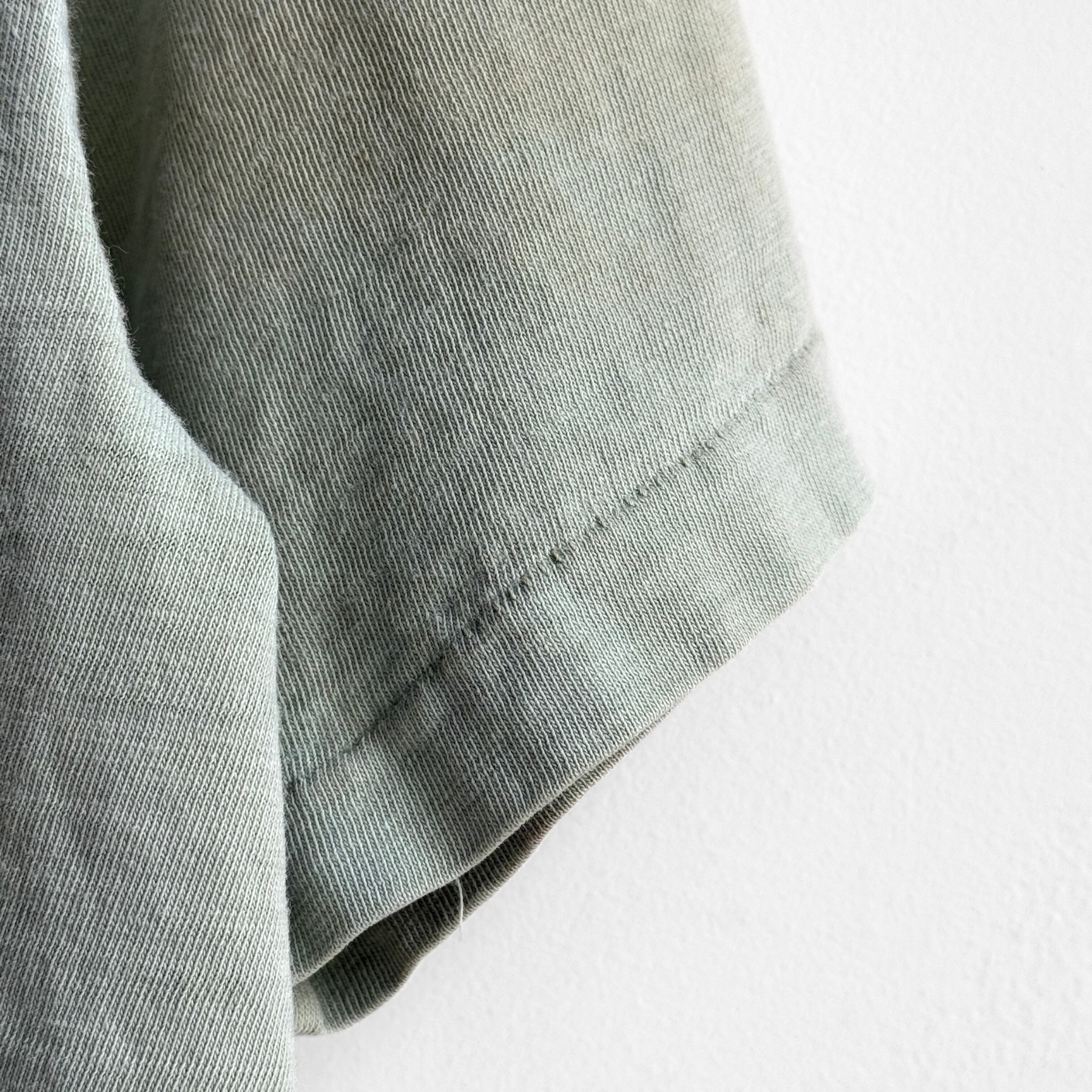 Features a faded light green color, single stitch sleeves, and selvedge pocket.