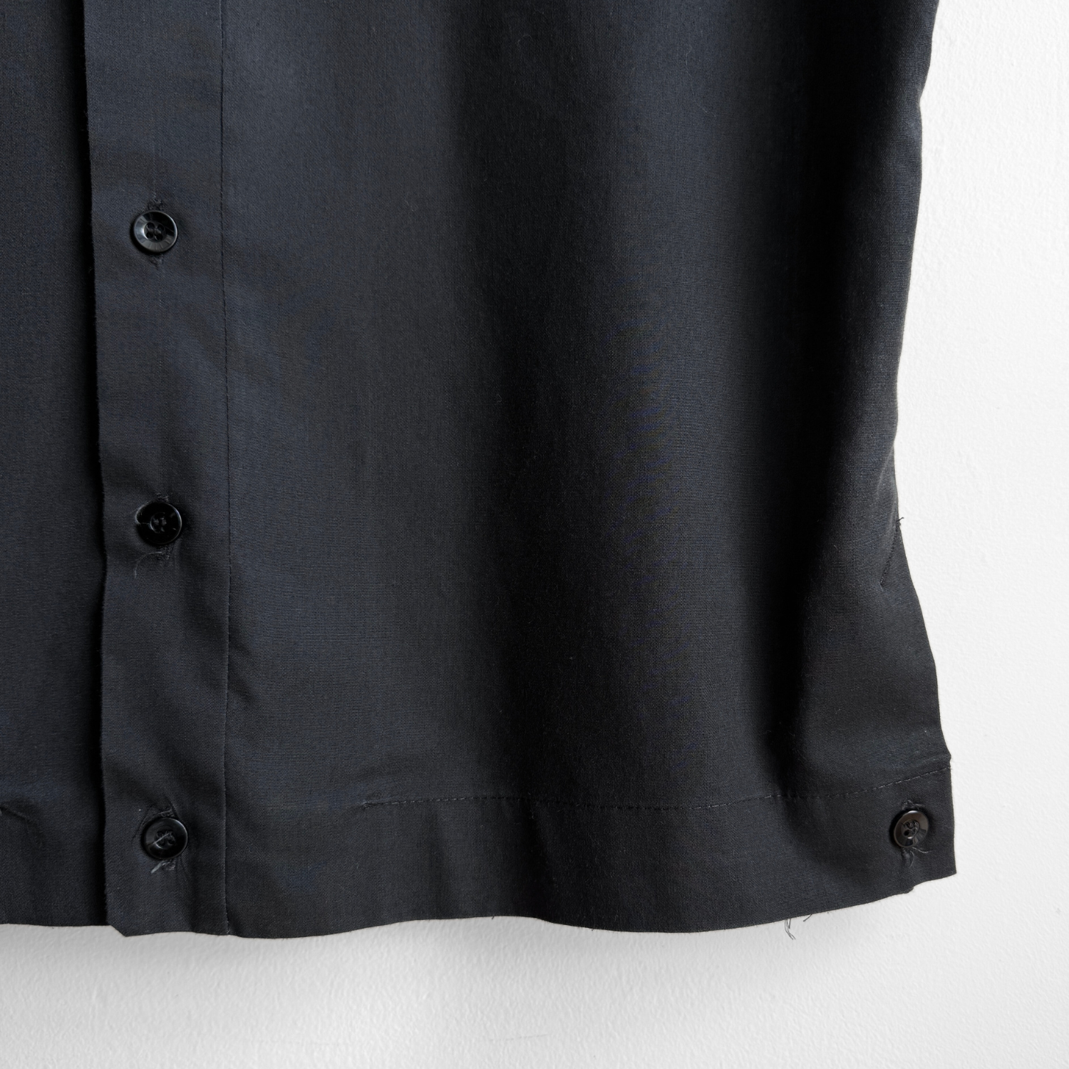 Features a black and white color scheme, buttons on each hip, short sleeves, single chest pocket, and chainstitch name on the chest.