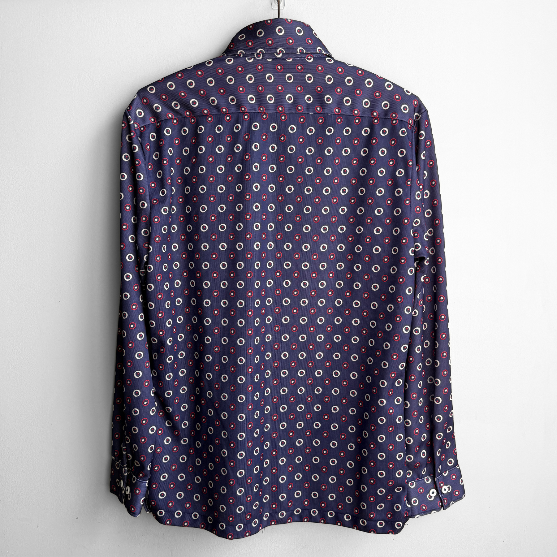 Features a navy base with red and white atomic style pattern, pointed collar, and straight waist.