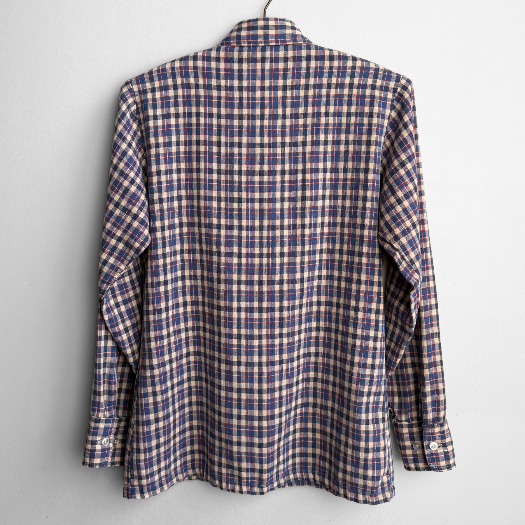 Features blue and cream plaid with red accents, Levi's tab check pocket, and small sleeve repair.