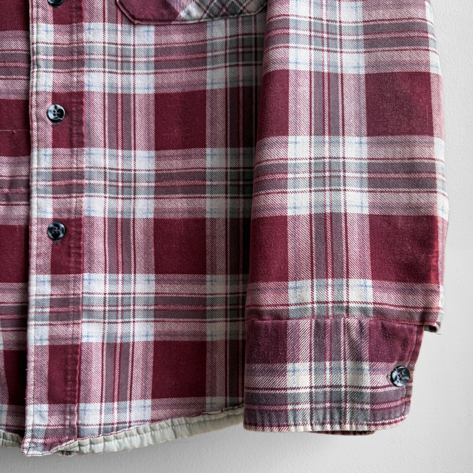 Features a faded red, white, and accented grey colorway, soft quilted liner, two chest pockets, button front.