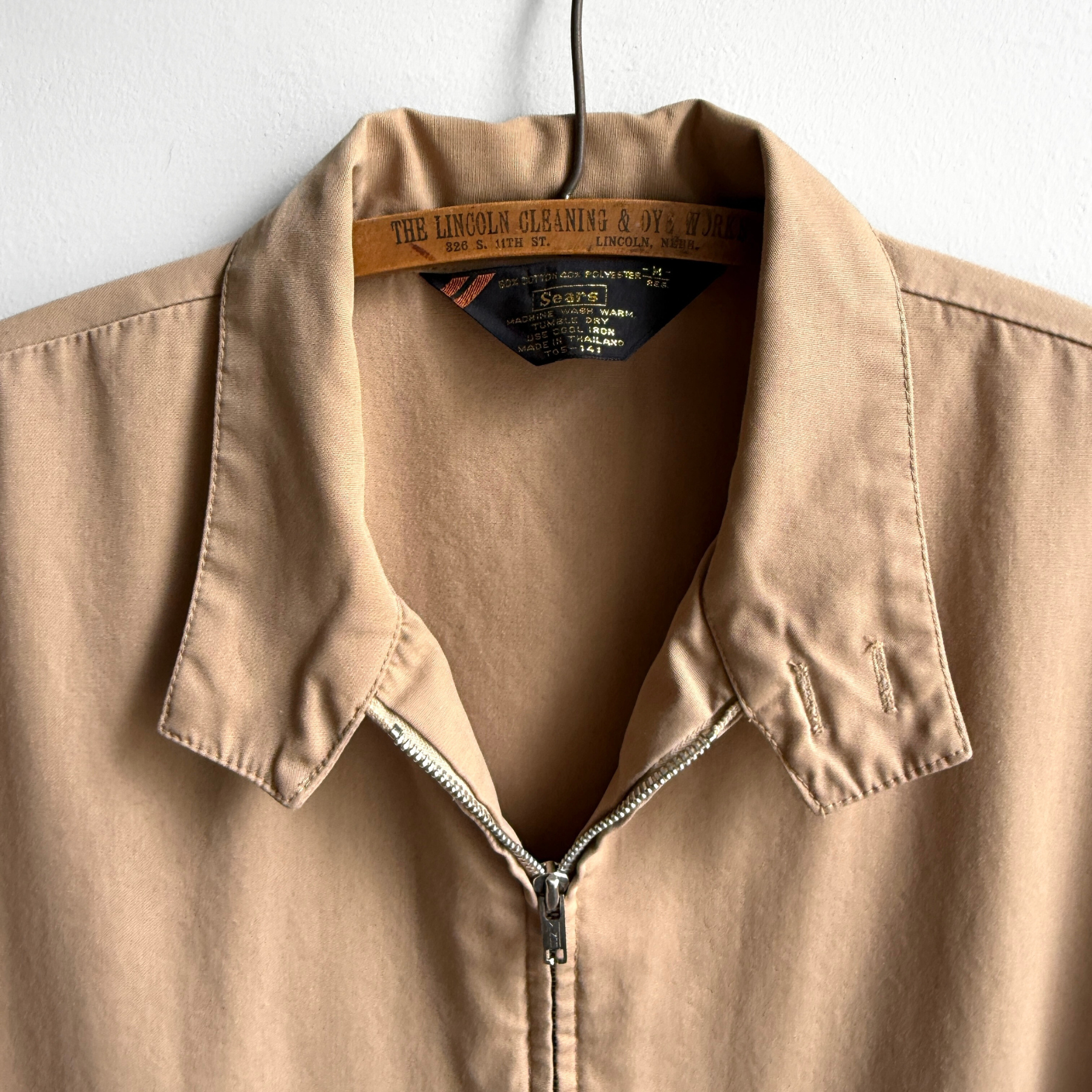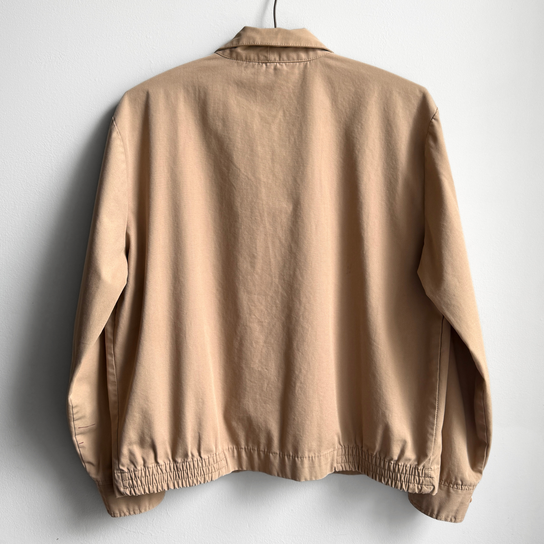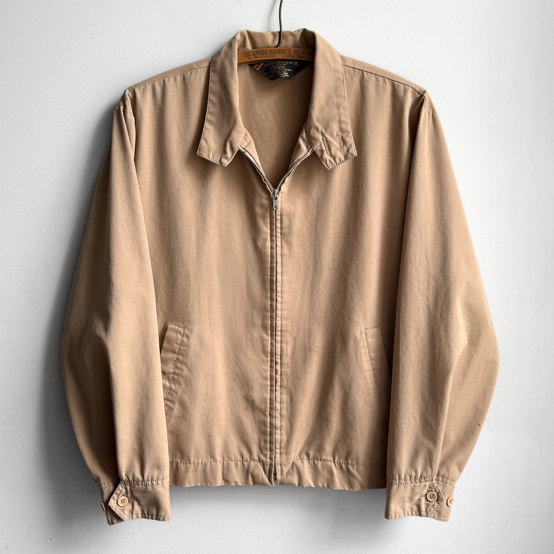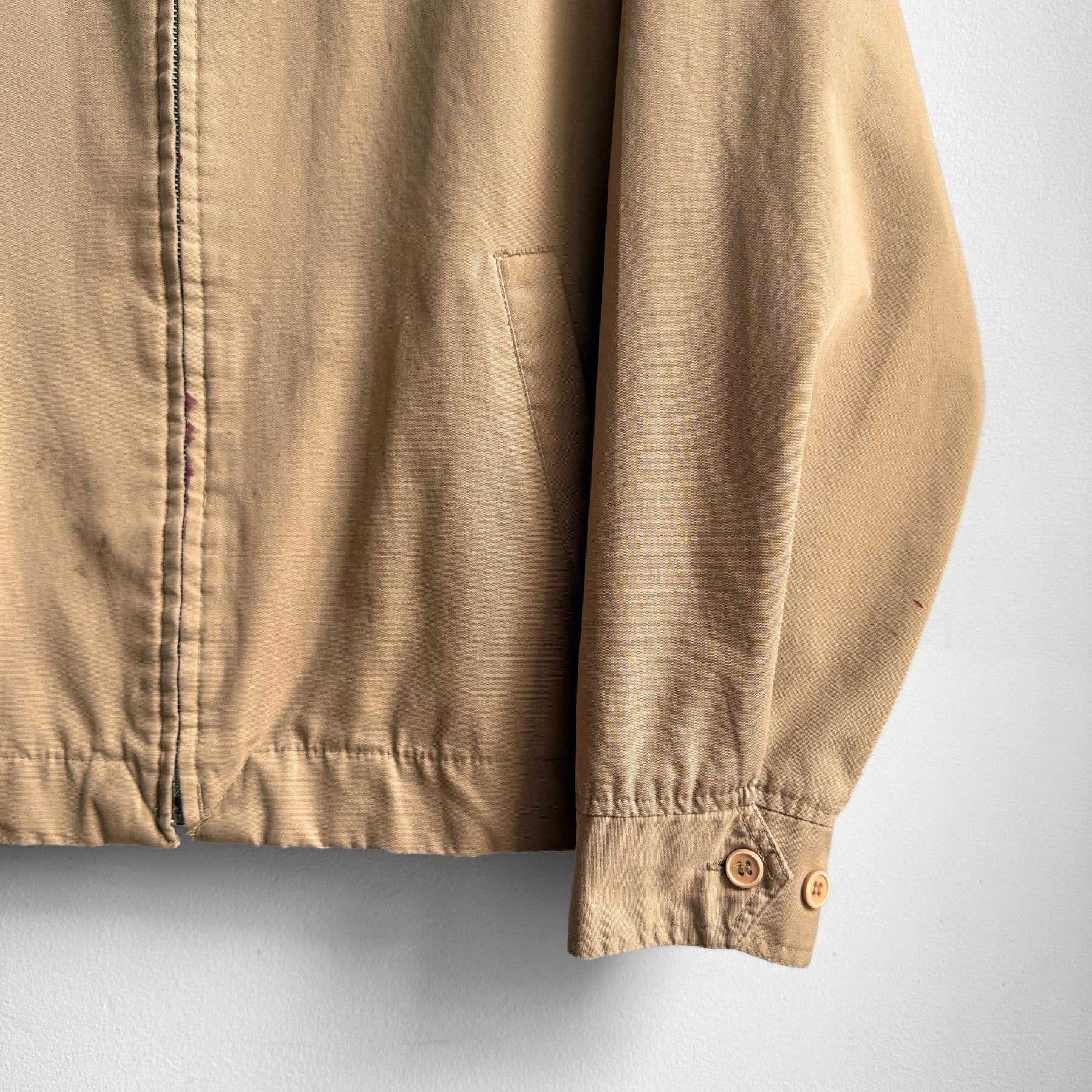 Features a tan poly cotton material, two hand pockets, and some paint spots near the zipper front and on the cuffs. See photos for more.