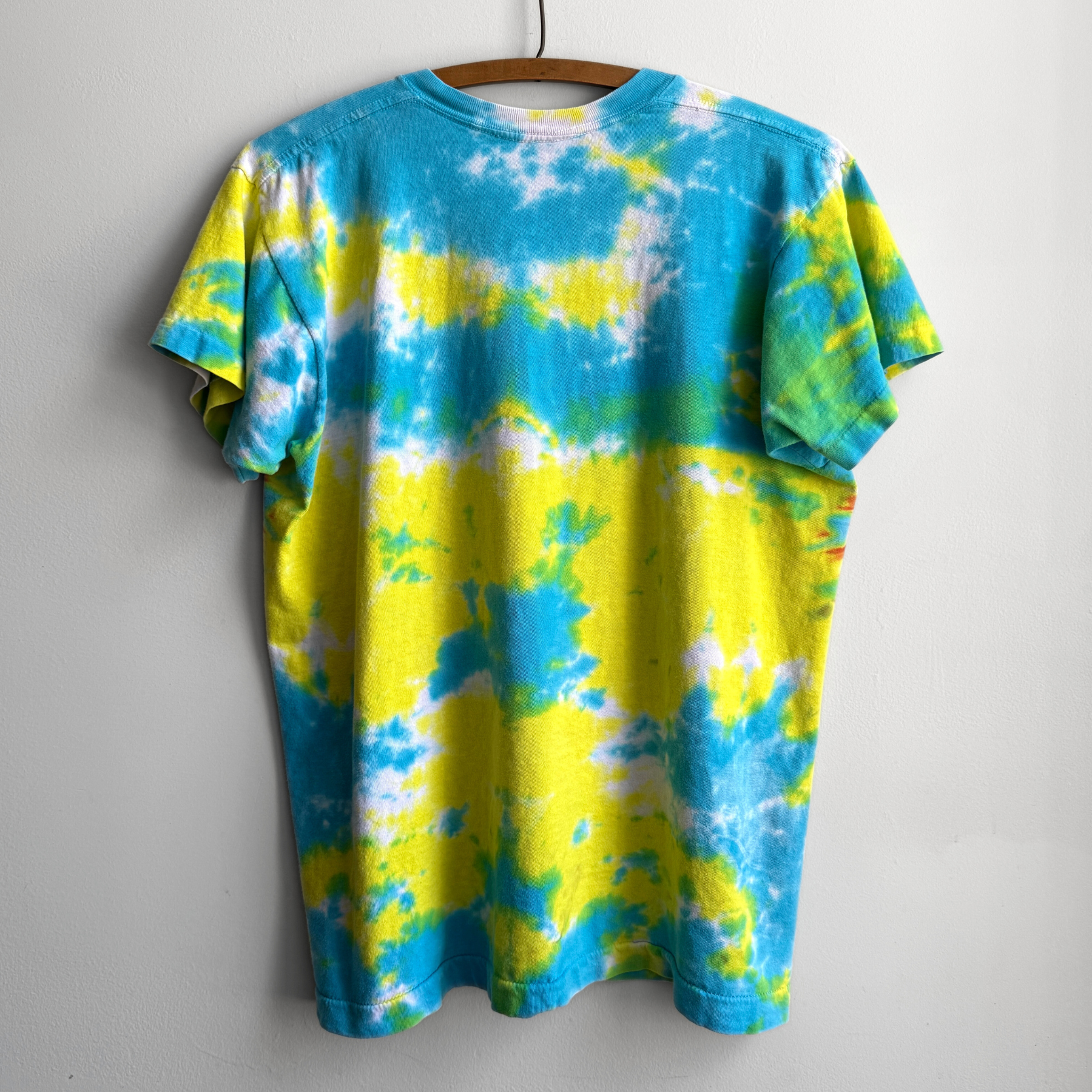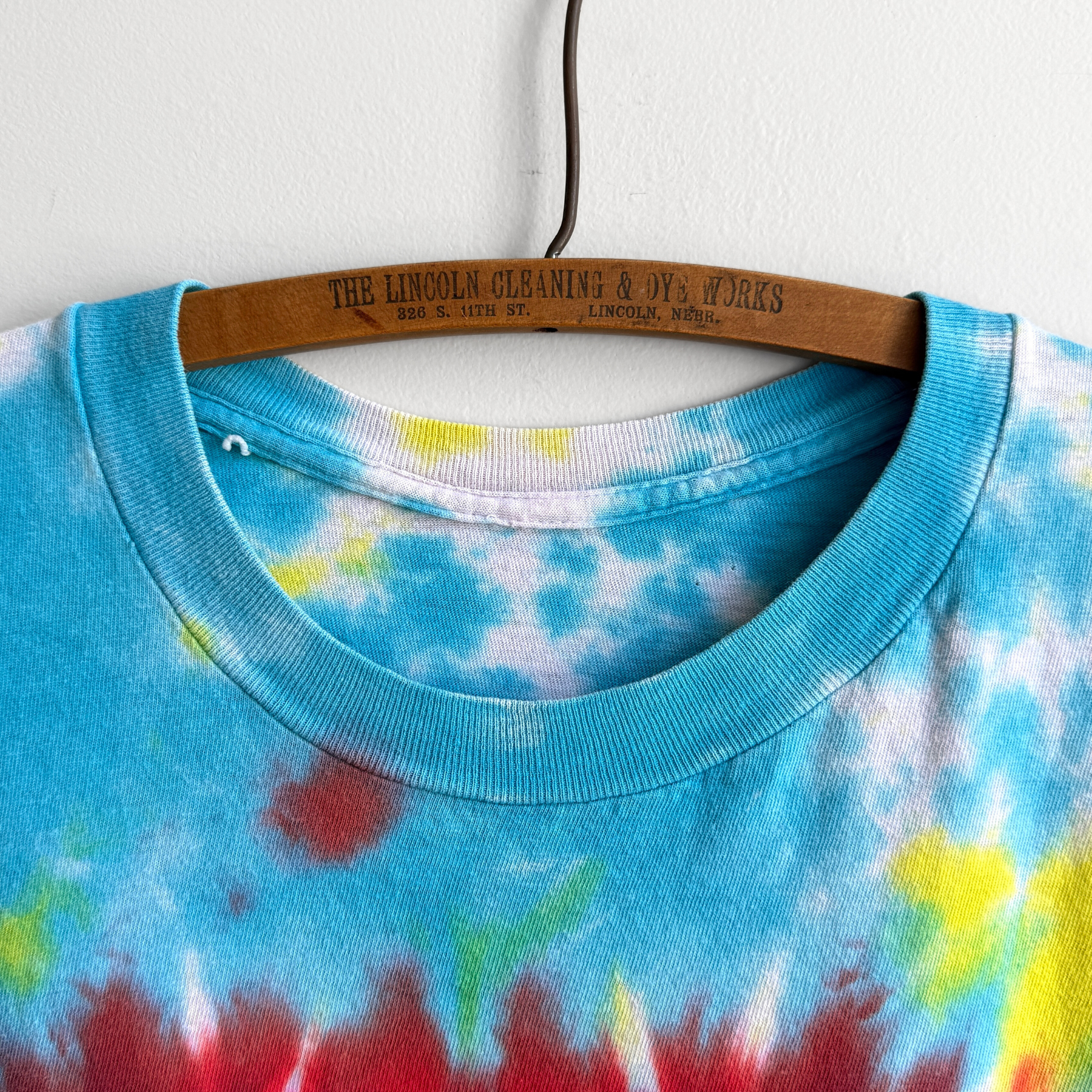 Features a large tie dye peace symbol on the front in red and black, with blue and yellow surrounding it, single stitch sleeves, and overall great condition. See photos for more.