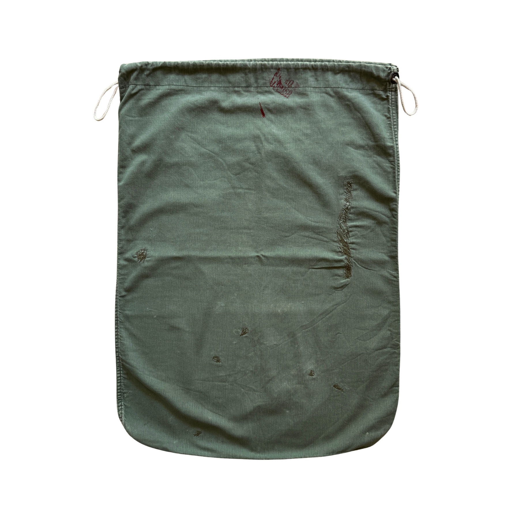 Features a super faded 'US' stencil in the center, drawstring pulls on each side, and soft cotton material with machine sewn repairs throughout the front and back of the bag.