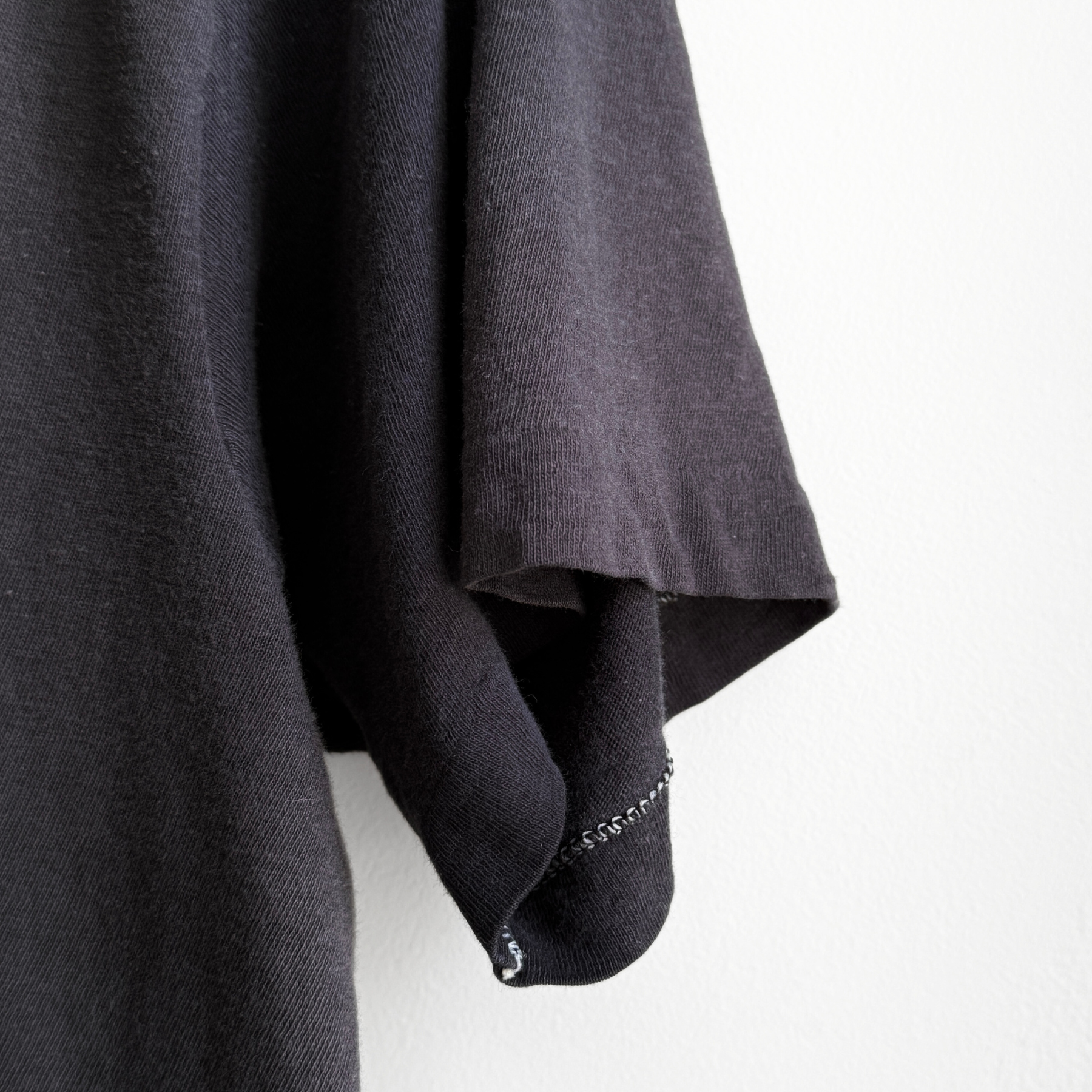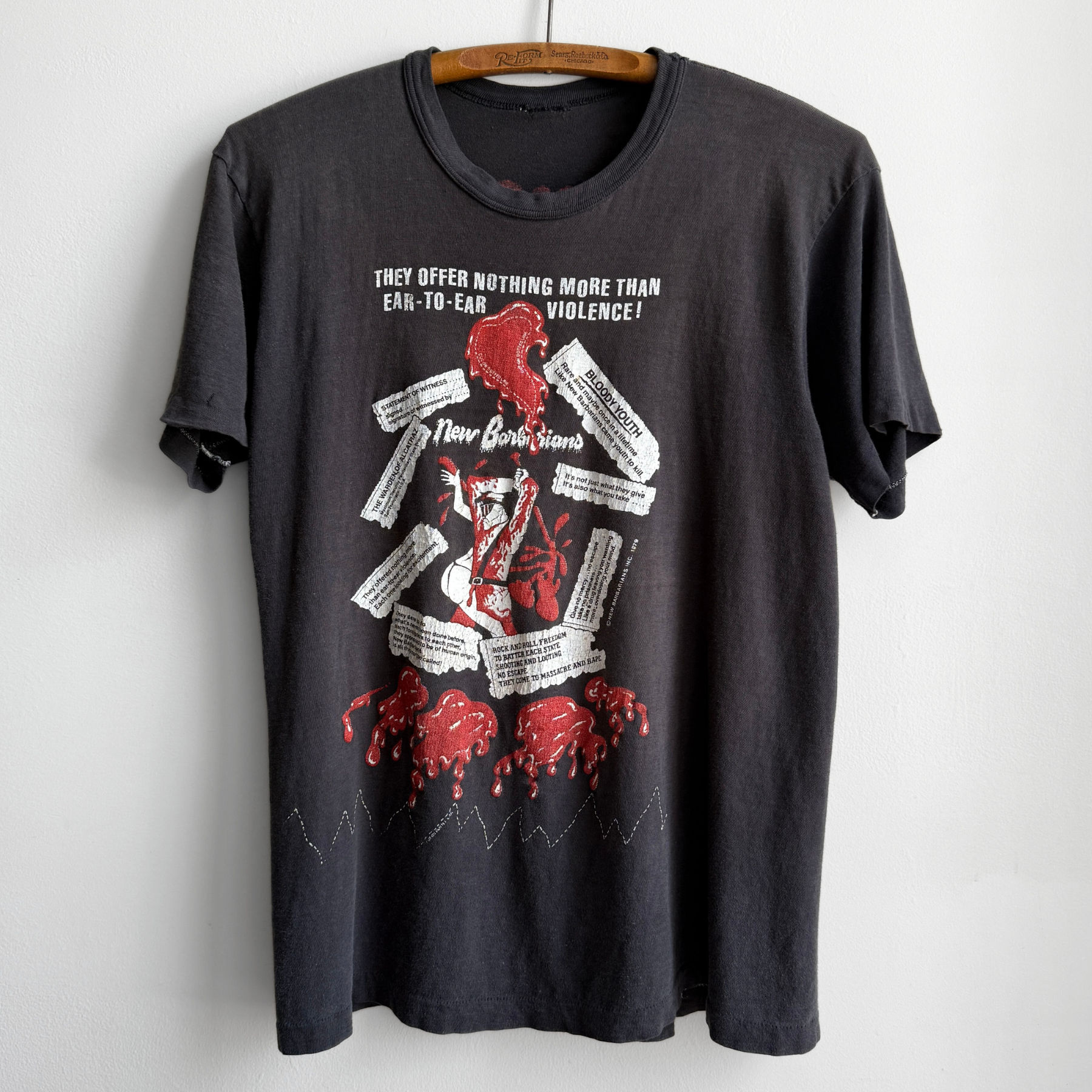 Features a double sided graphic from the New Barbarians 1979 tour, single stitch sleeves, and perfectly charcoal black faded poly cotton material.