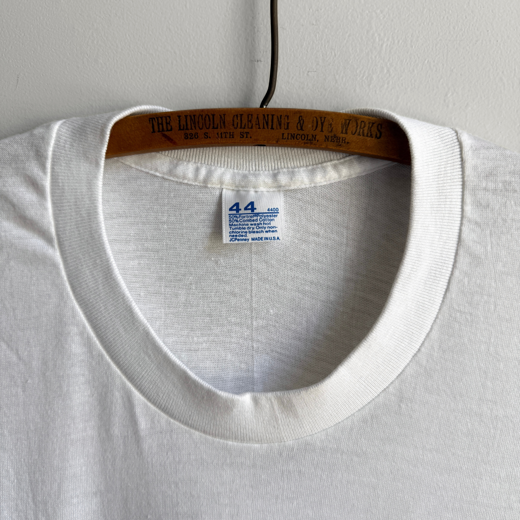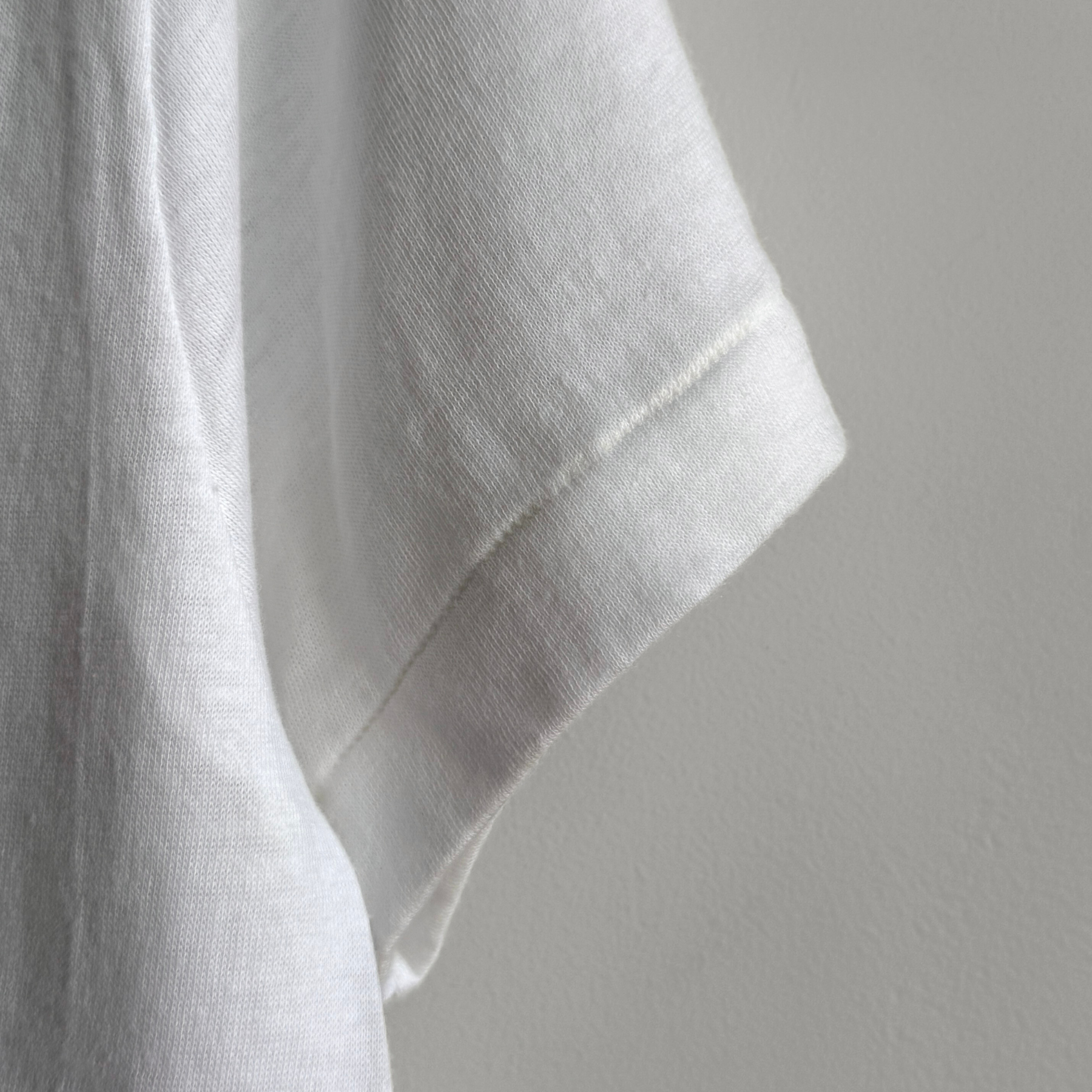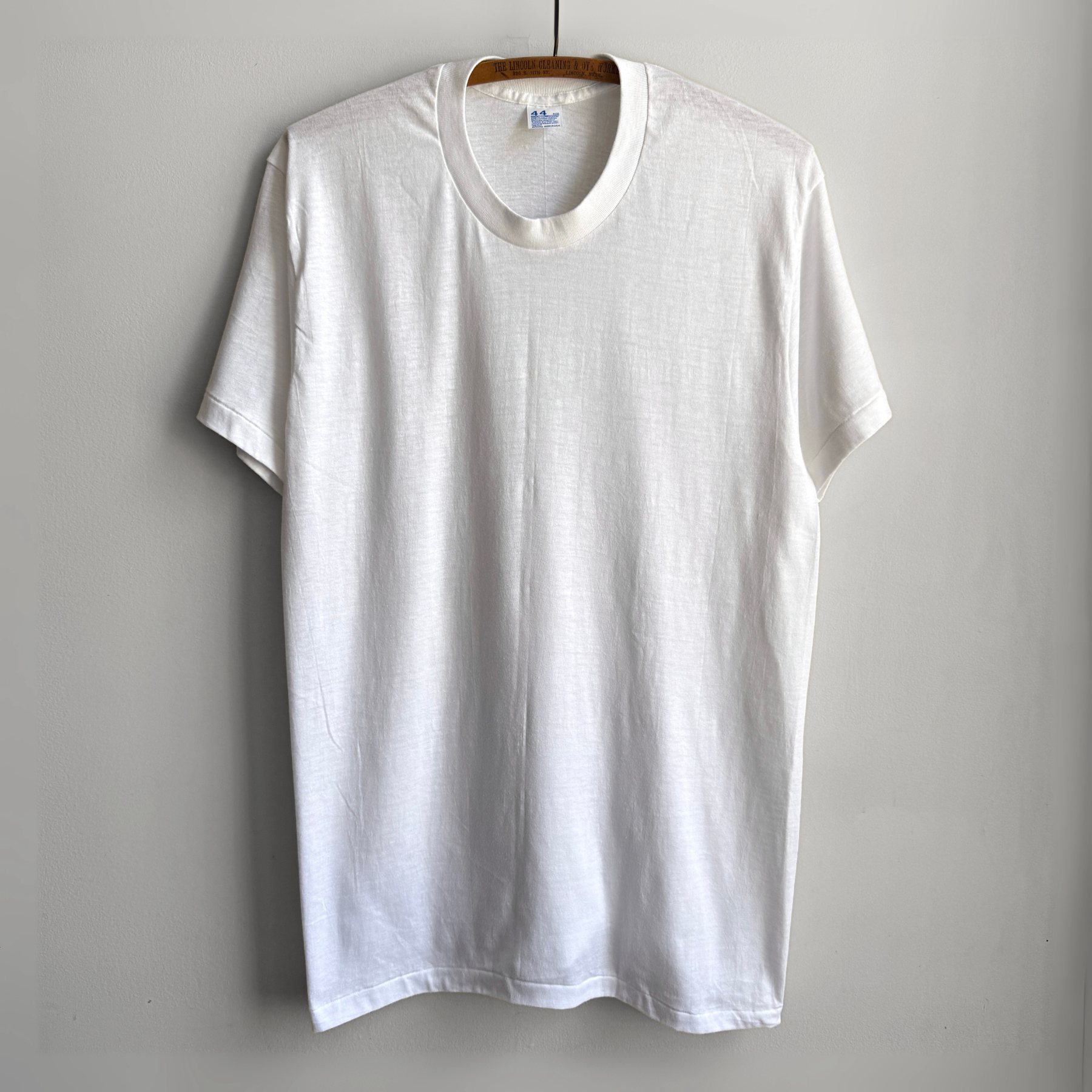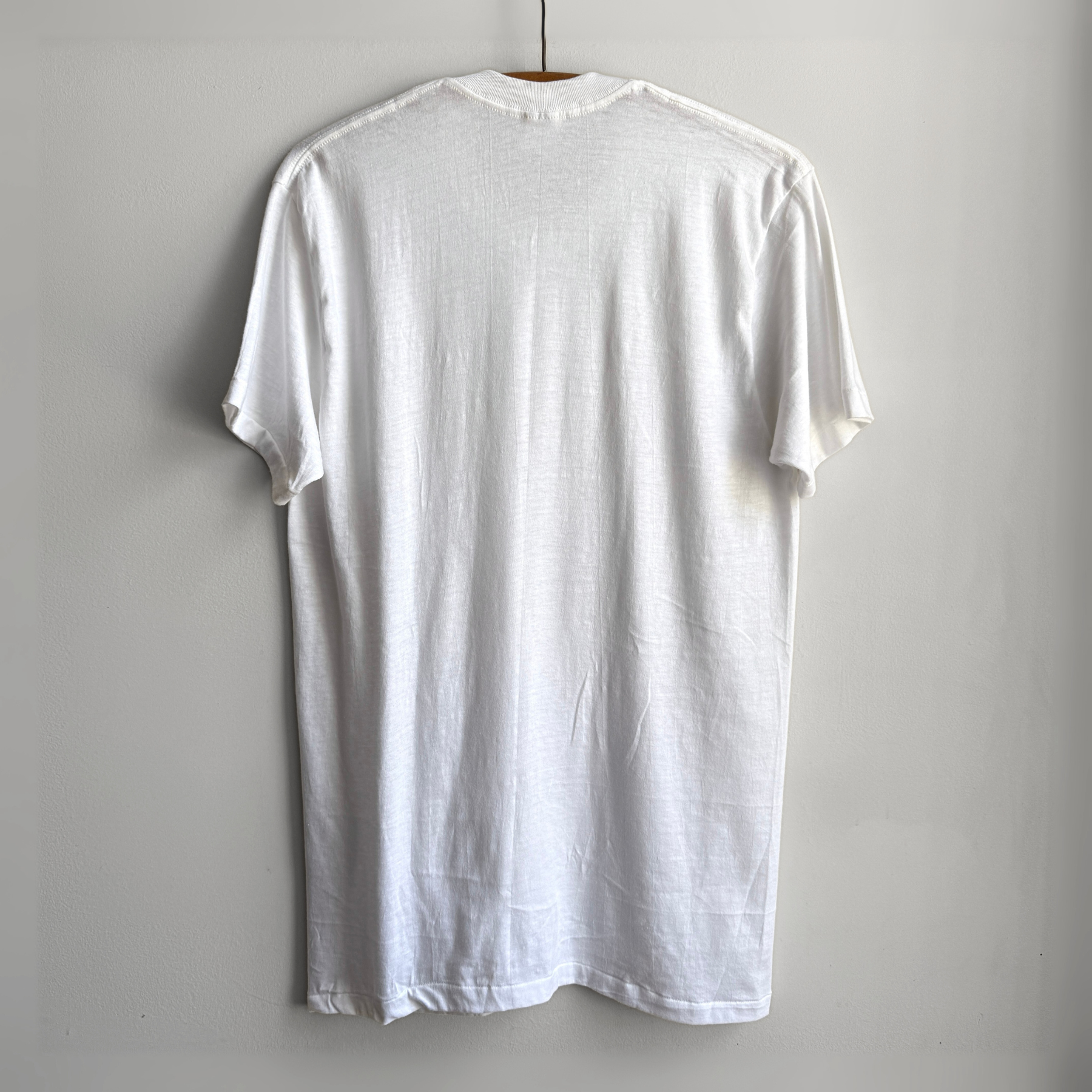 Features a blank white poly cotton material, single stitch sleeves, and overall in excellent/almost new condition. See photos for more.