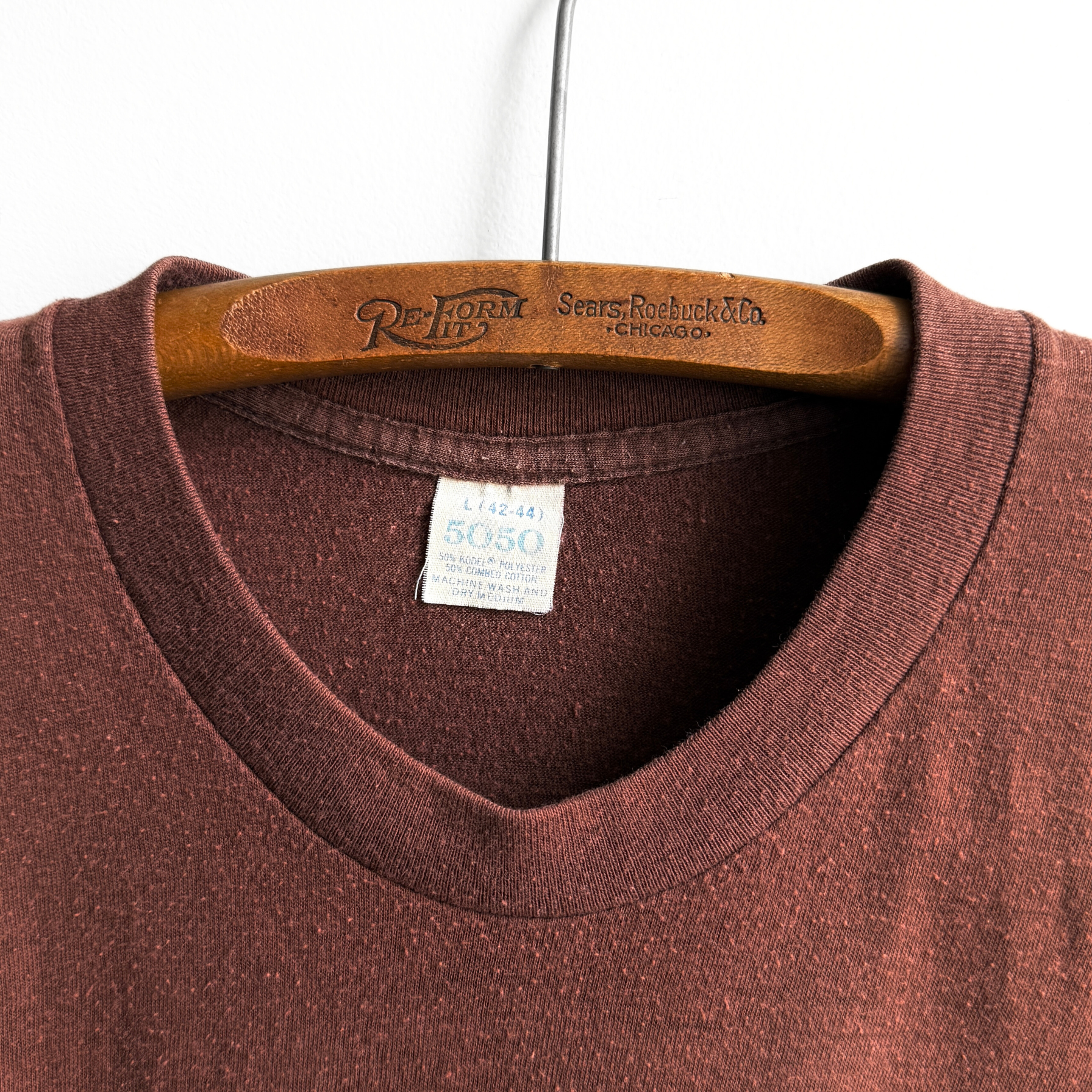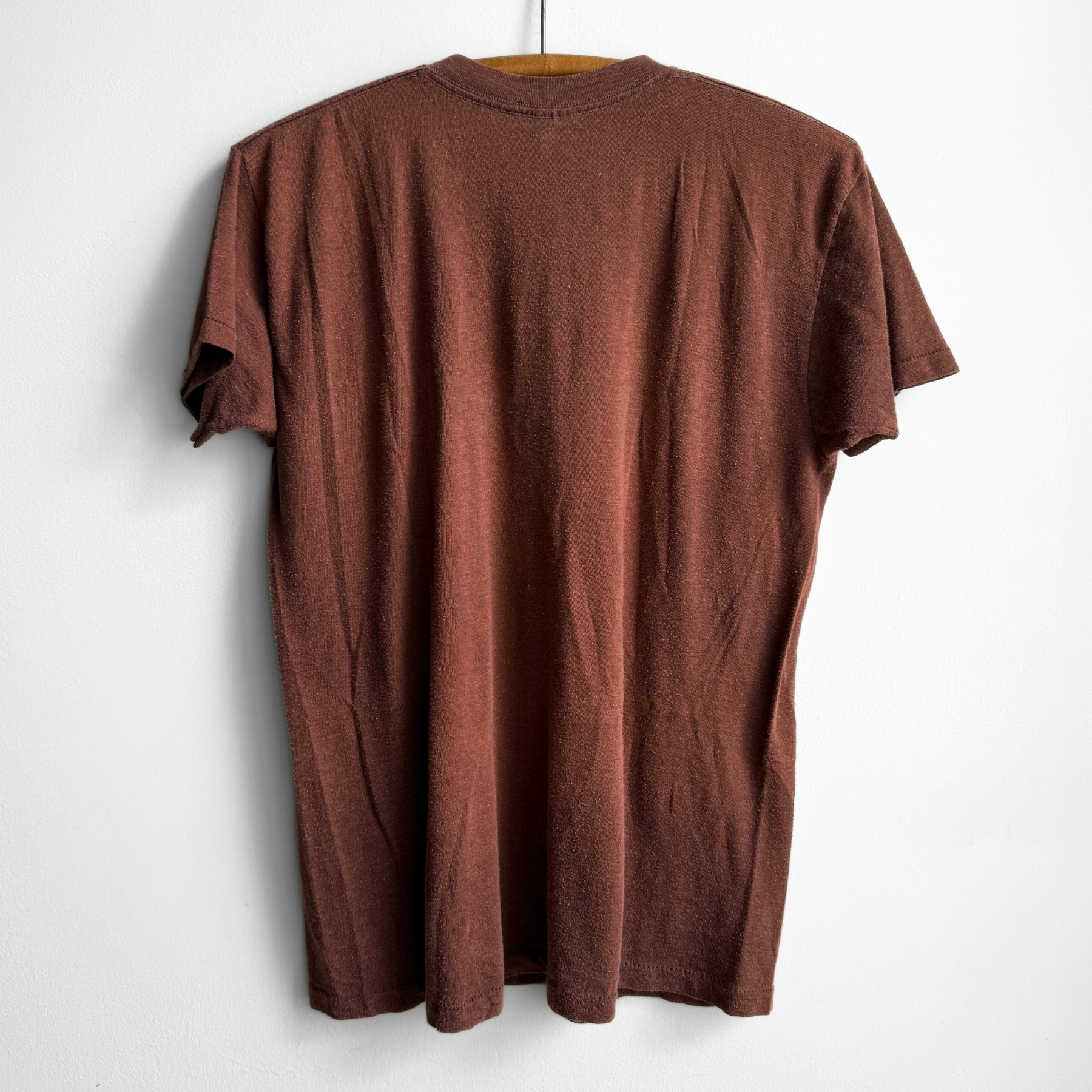 Features a faded, but rich brown color, single stitch sleeves, and selvedge pocket.