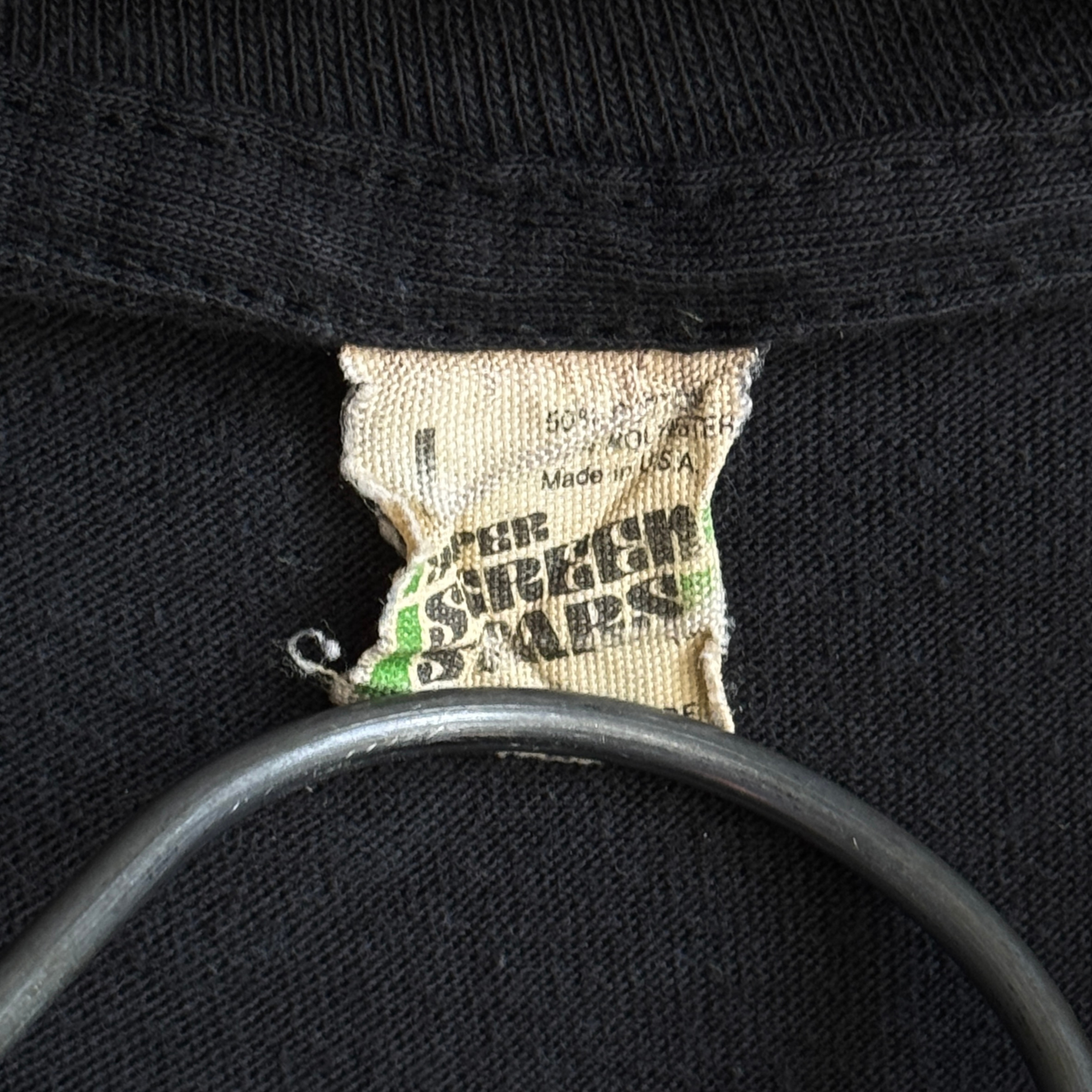 Features a double sided, bald eagle winged logo graphic, single stitch sleeves, and overall great black fade. This tee was given out as part of Harley Davidson's Employee Participative Action Program in which employees were incentivized to problem-solve motor related issues to compete with Japanese motor companies in the 1980s and 1990s.