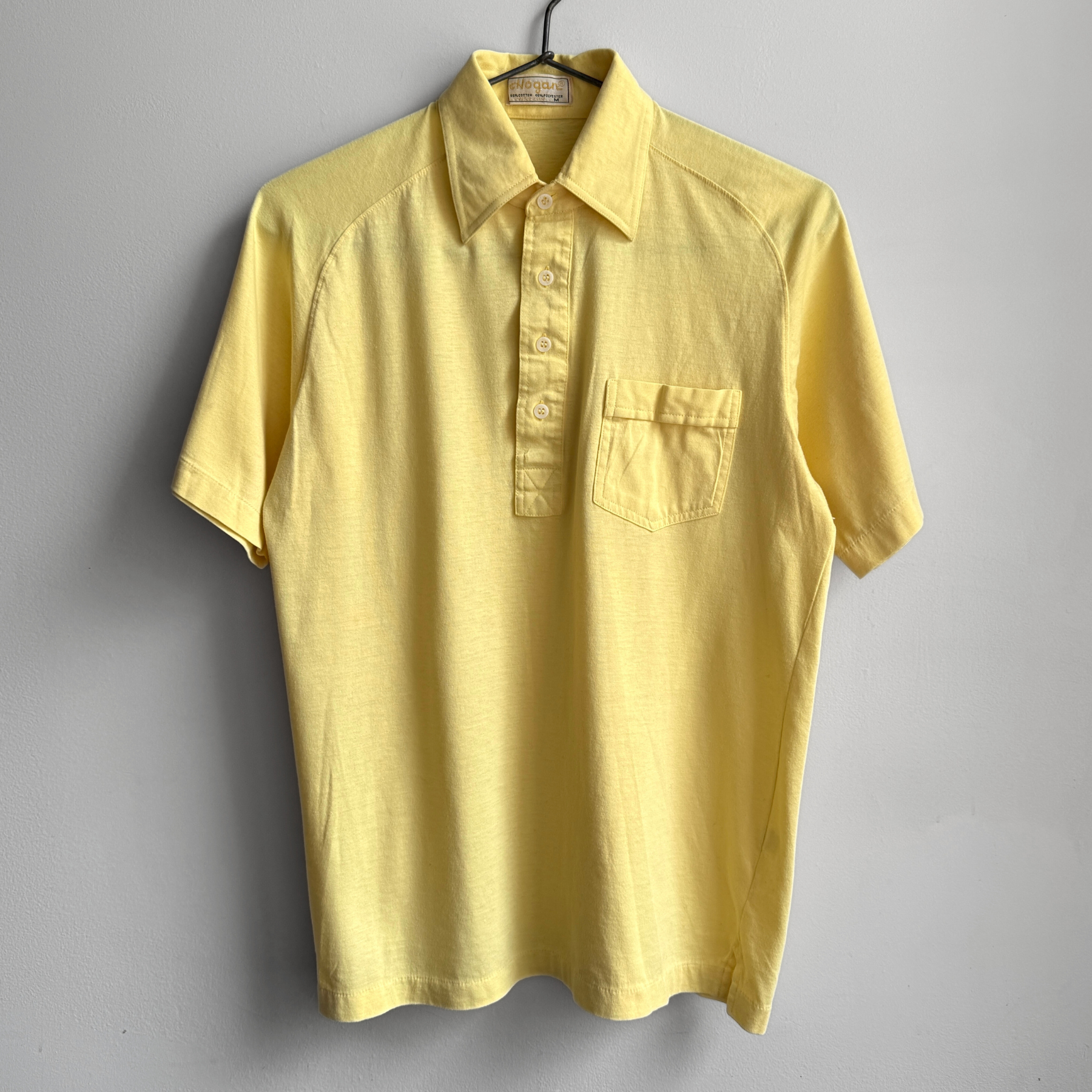 Features a soft poly cotton material, faded light yellow color, single stitch sleeves, and quarter button polo style collar. Overall in excellent condition.