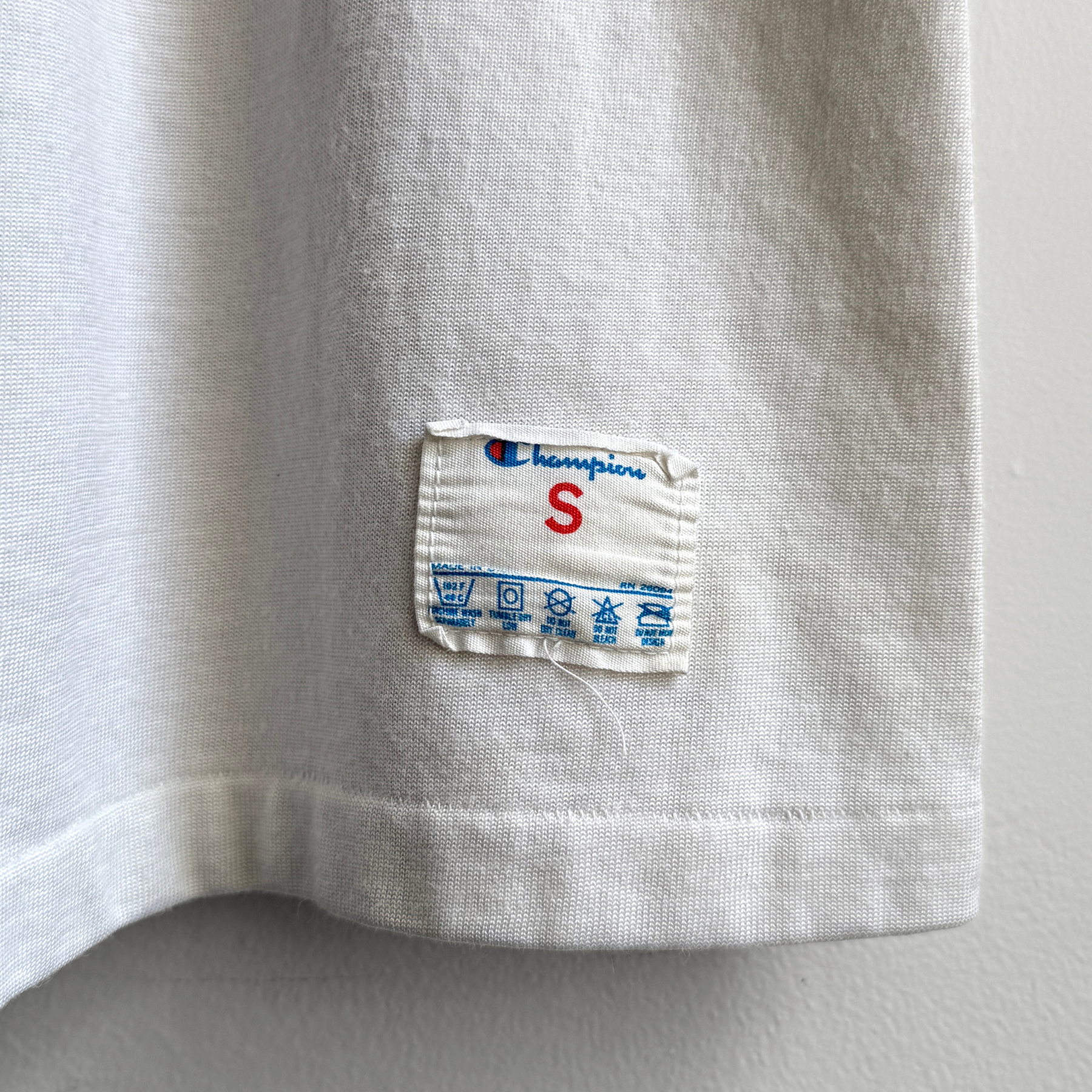Features a thick cotton/nylon based material, subtle off white color, single stitch sleeves, and v-neck collar design. Overall in excellent condition.