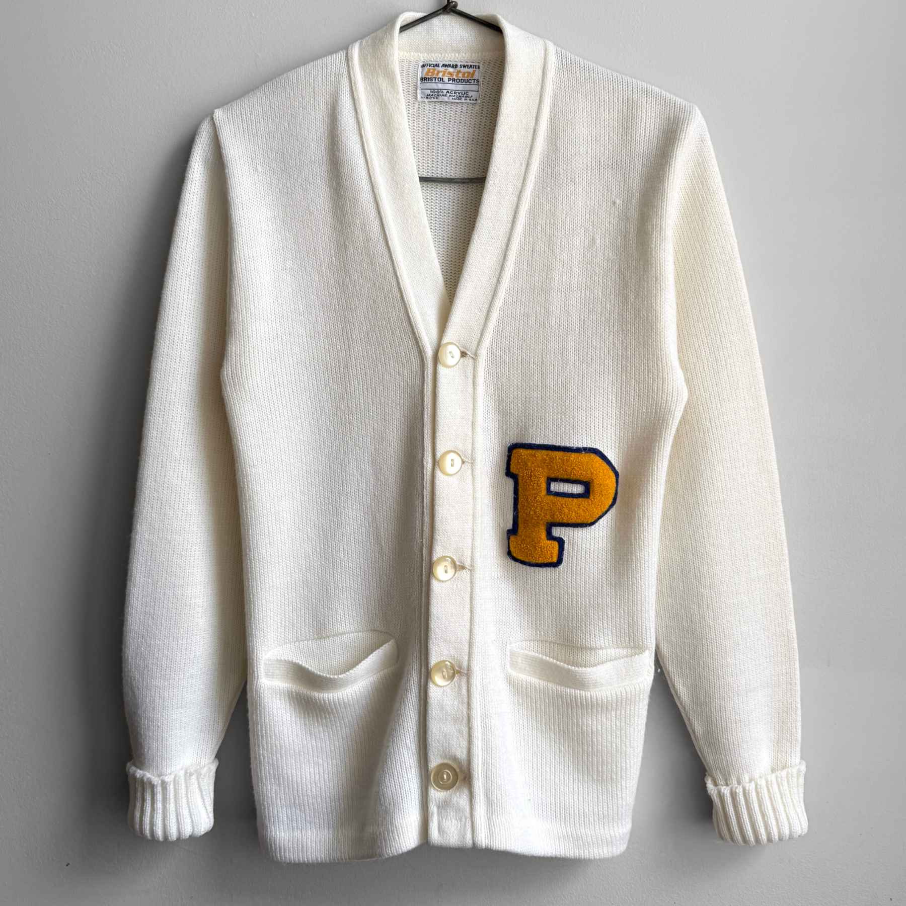 Features a super soft all acrylic material, off white color, large 'P' chenille patch on the torso, and two hand pockets. Overall in excellent condition.