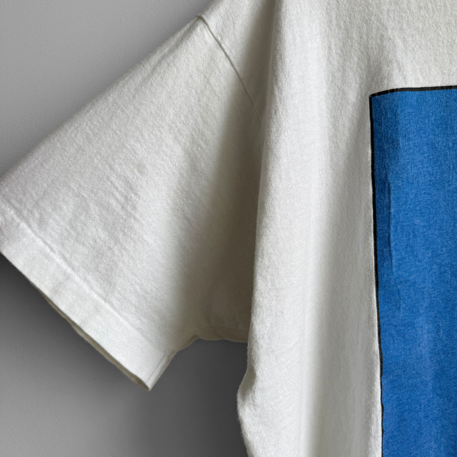 Features a large front side portrait style graphic and single stitch sleeves. Has some staining underneath the graphic as shown.