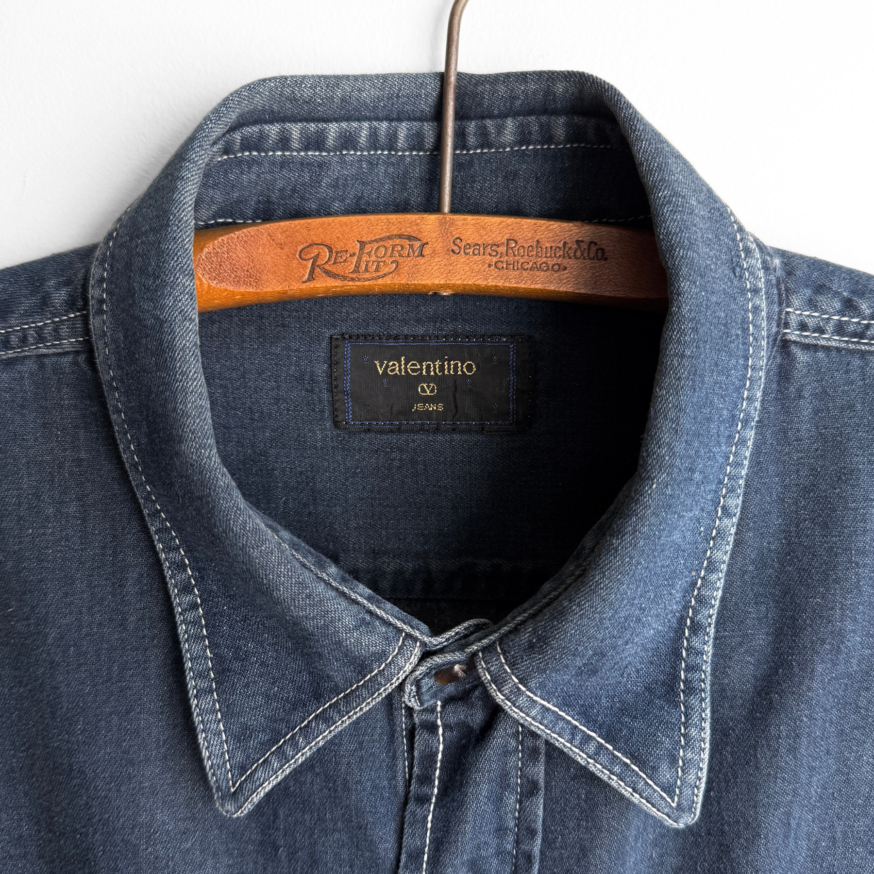 Features a dark indigo blue cotton material, western stitch style details, catseye buttons, and stand up collar.