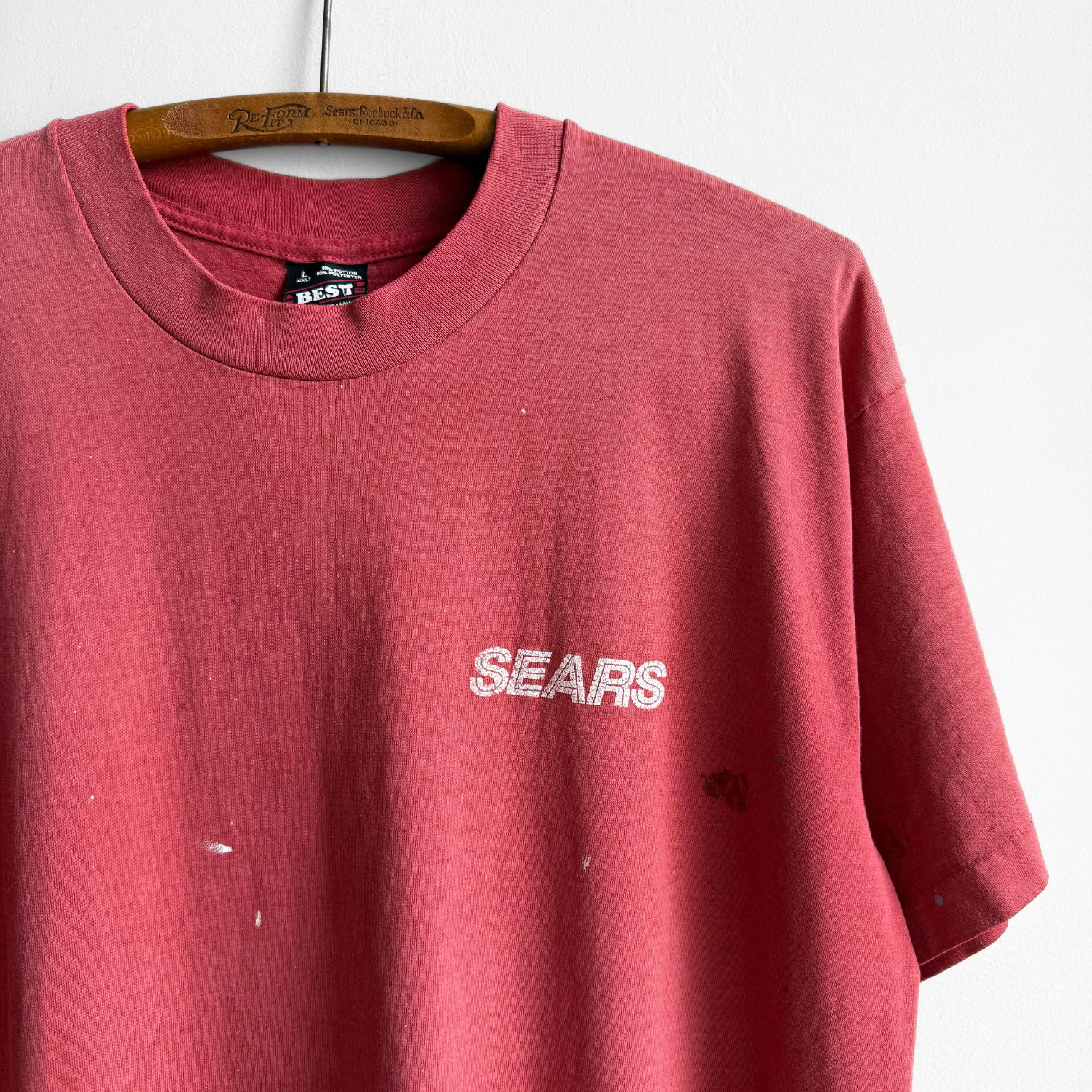 Features a sun faded red color, single stitch sleeves, and paint splattering throughout with a great worn-in, distressed look. This specific logo was first introduced by Sears around 1994.