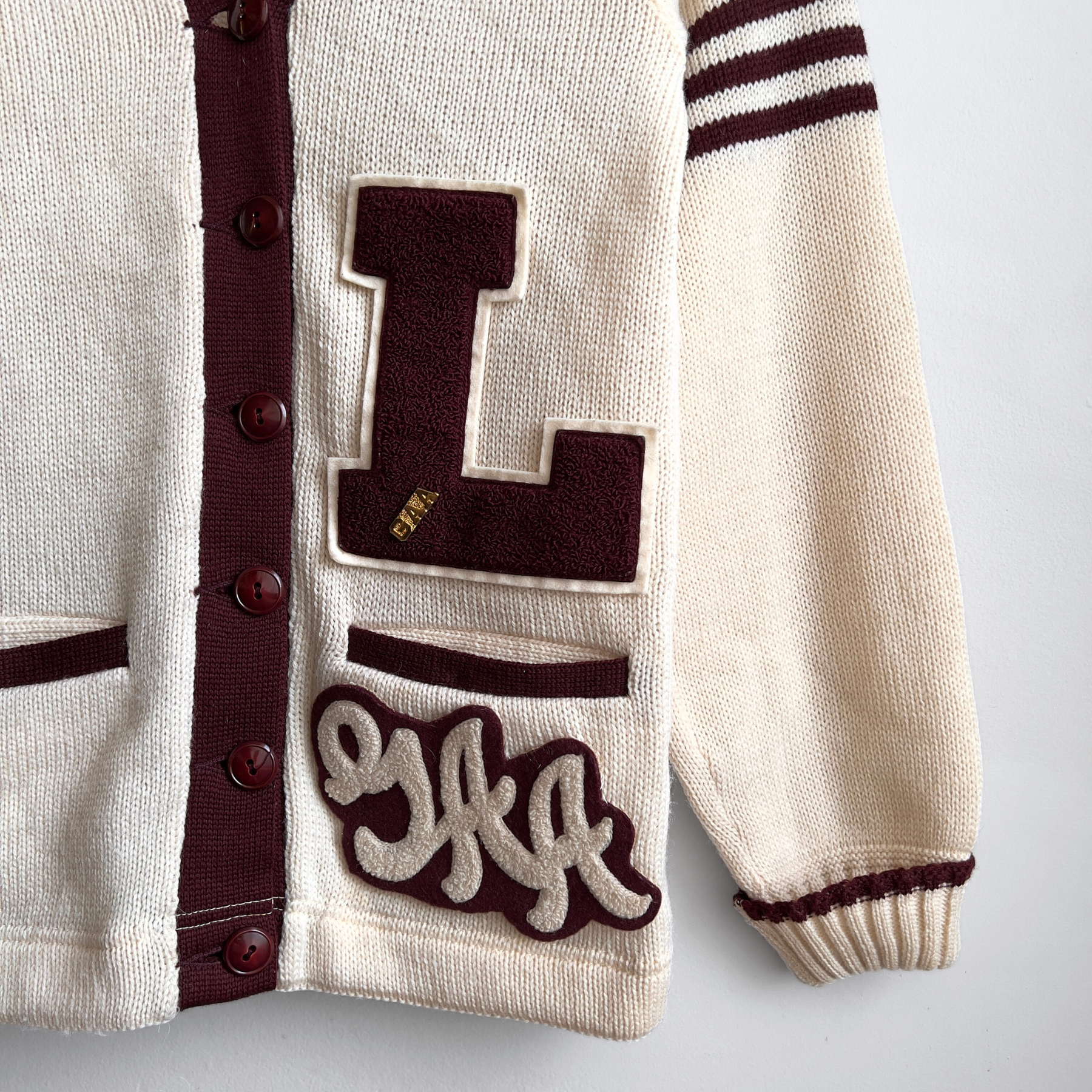 Features a cream colored base and burgundy red stripes, various letterman chenille/felt patches on both sides and sleeves, and two hand warming pockets at the waist. All original pins, lovely colors and details.